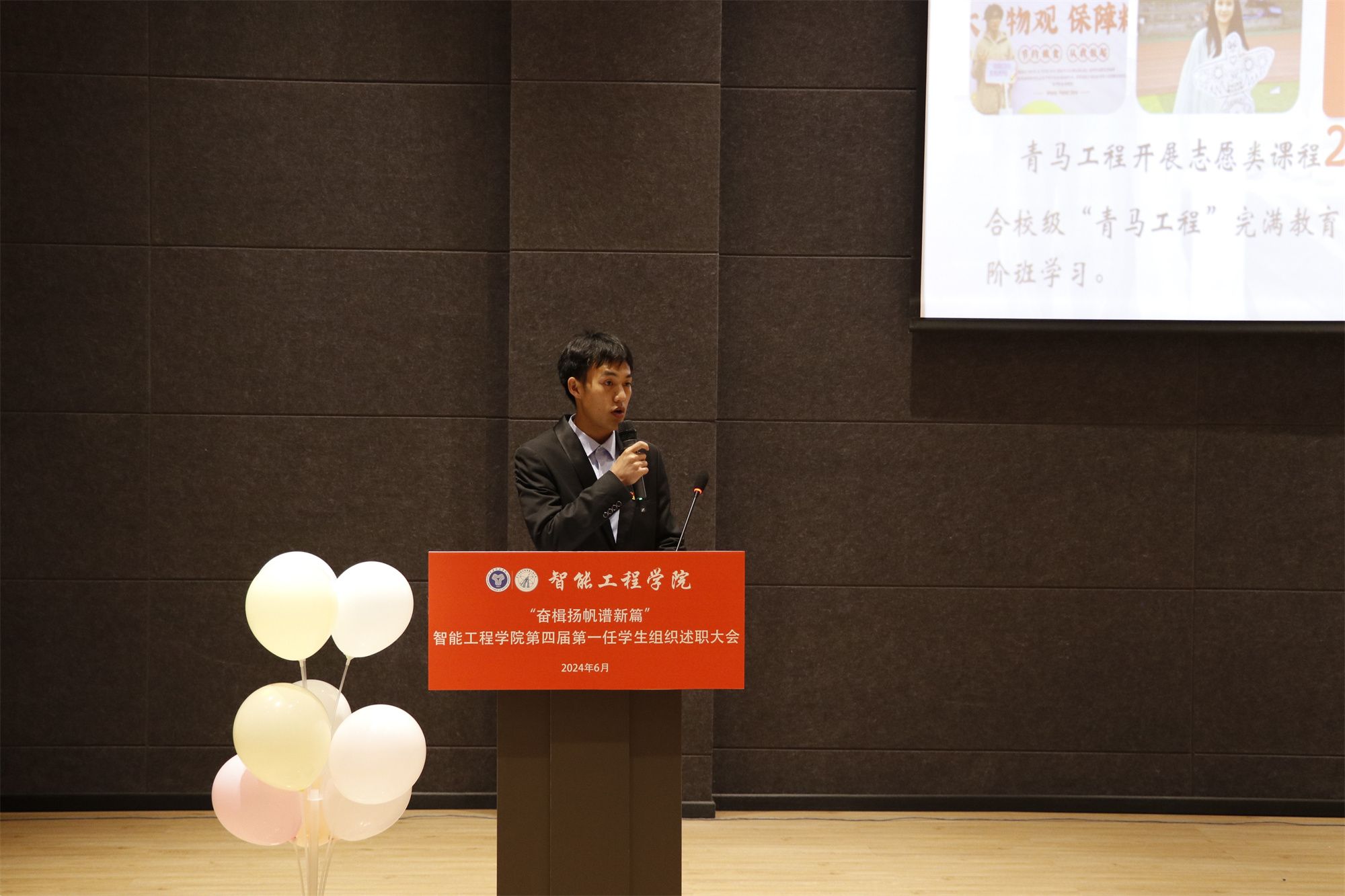 会议正式开始前,通过一段视频总结了过去一年中所有学生组织取得的成果。视频中,定格的每一帧都是同学们对校园生活的热爱,所展示每一张荣誉证书,都是汗水与青春的火花碰撞。在视频中,每一位学生组织人员能够直观地感受到自己在去年工作中的成长与收获。紧接着,所有学生组织成员共同合唱智能工程学院院歌,不仅唱出了对学院的热爱,也在昂扬的歌声中赋予了每一位学生组织成员前进的力量。