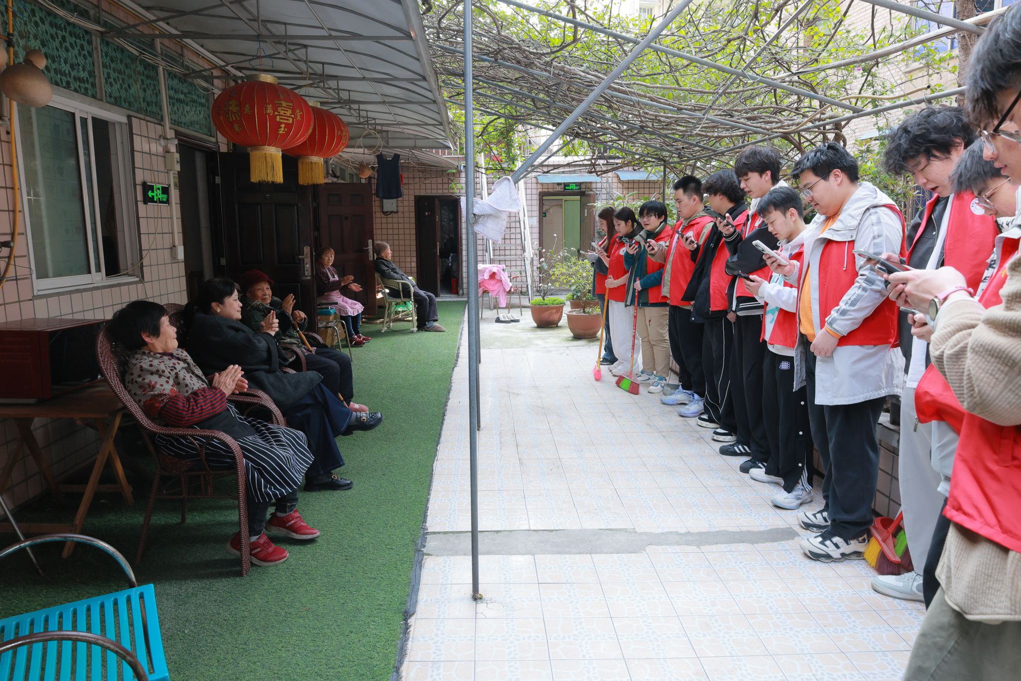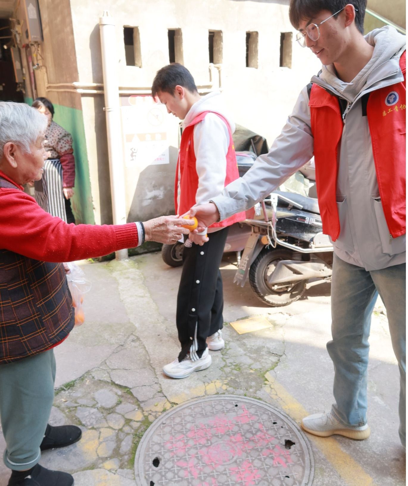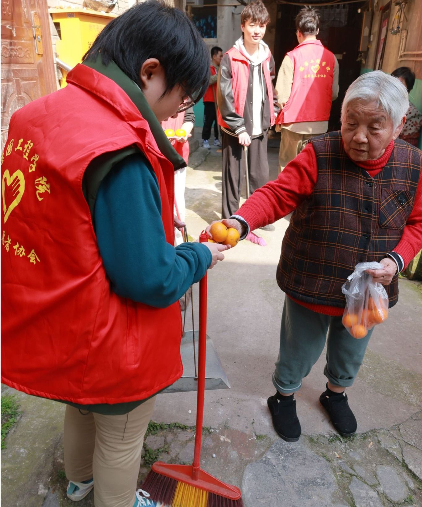 演出结束后,一位老婆婆满含爱意地给每位志愿者都递上一个橘子。小小的橘子,散发着清甜的香气,传递着老人对志愿者们深深的喜爱与感激。这一举动让志愿者们心里暖暖的,也让现场的氛围更加温馨。