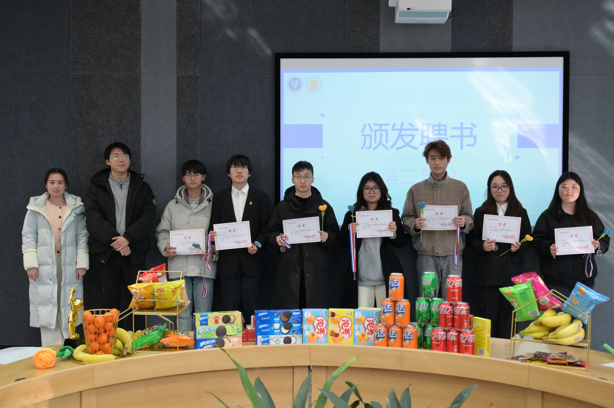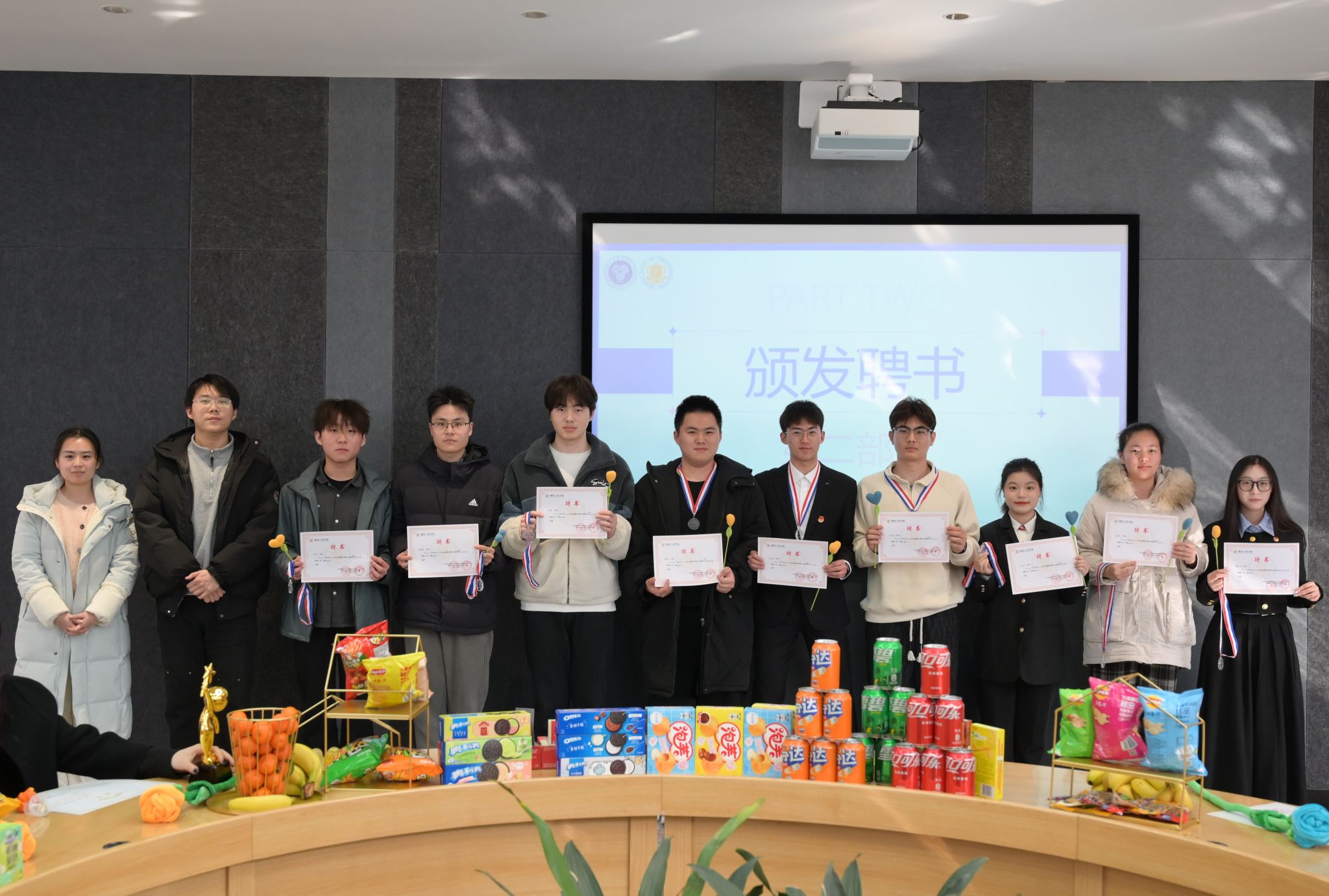 颁奖环节将大会推向高潮。肖瑶老师、刘东鹏老师和秦雪菲老师为上届优秀干部干事颁发聘书,对他们过去一年的杰出贡献予以高度认可。这份荣誉不仅是对个人努力的肯定,更是激励全体成员奋勇向前的动力。