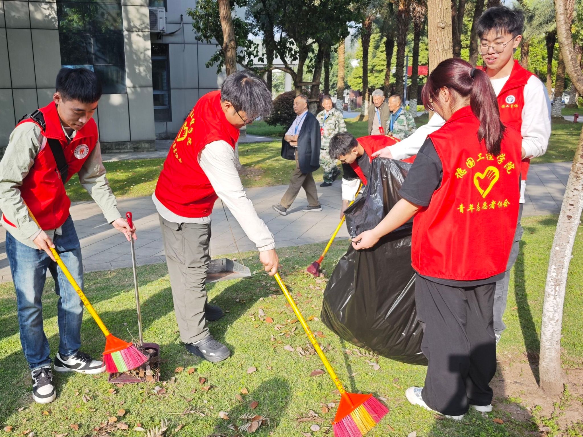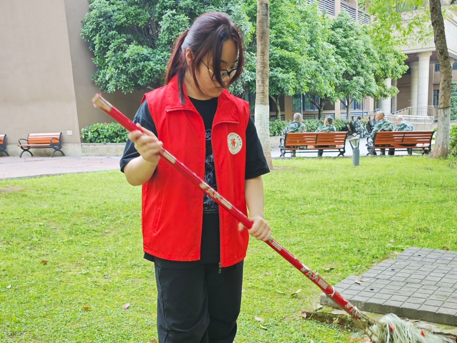夕阳下的荣军院窗明几净,有几位老人在长椅上聊着天,看着忙碌的志愿者们。电气七班的寿培瑶同学,清理花坛时发现一株野草从砖缝里钻出来,她说:“它像极了老兵们口中‘冻僵的手指仍扣着枪栓’的坚持。那一刻,我仿佛不是在打扫卫生,而是在捡拾被时光模糊的记忆。”