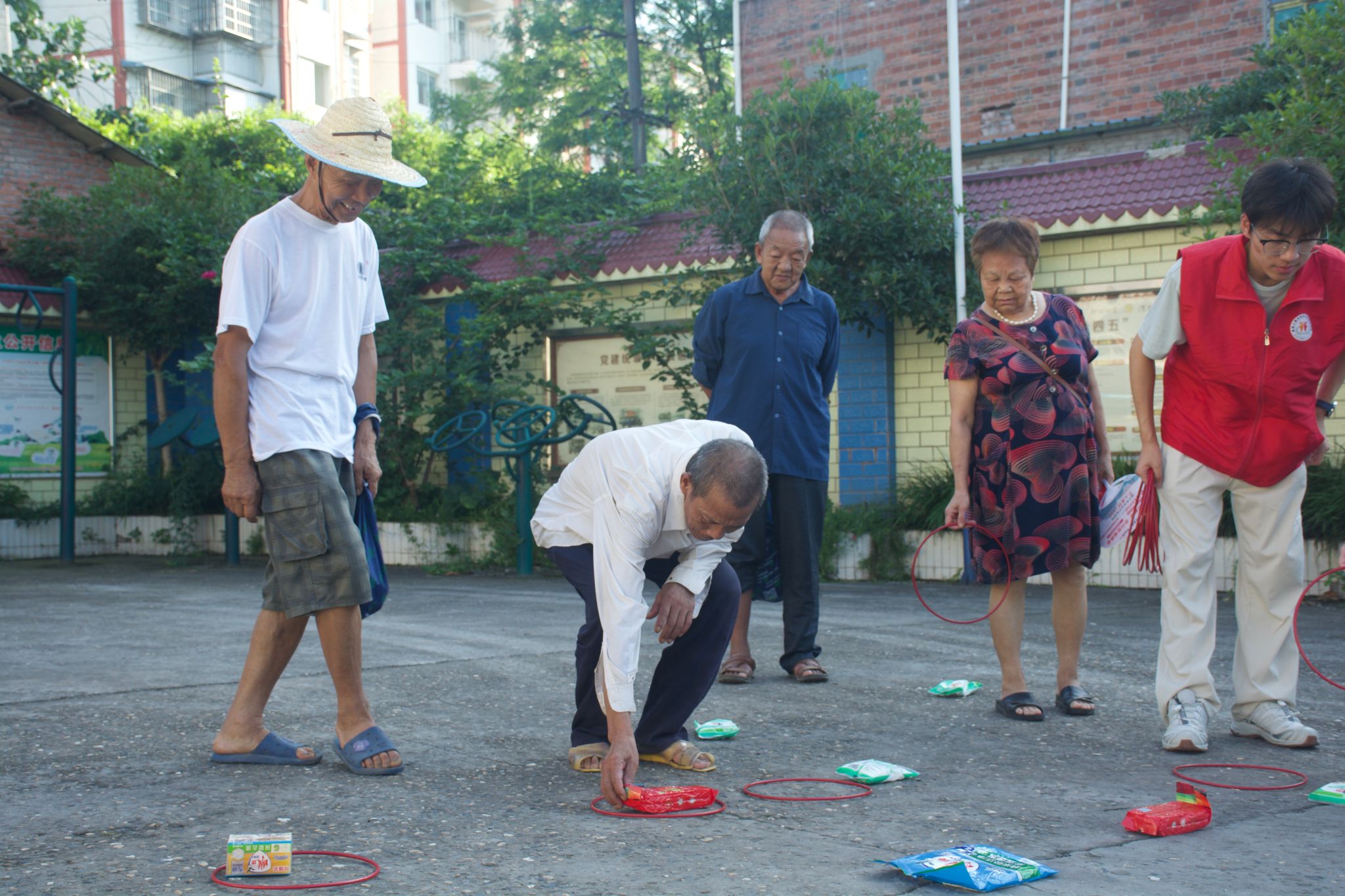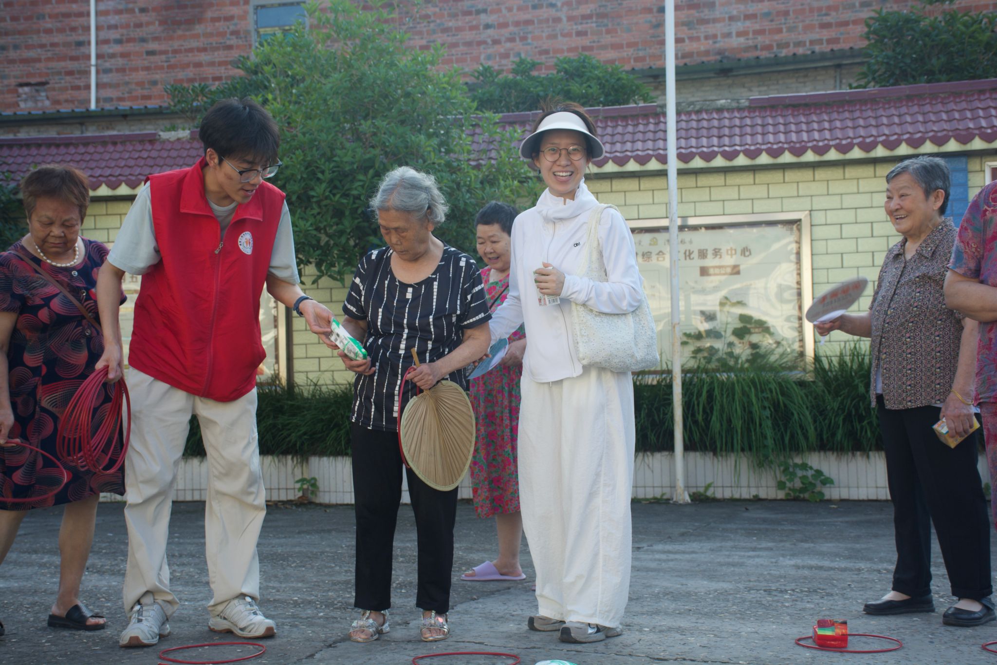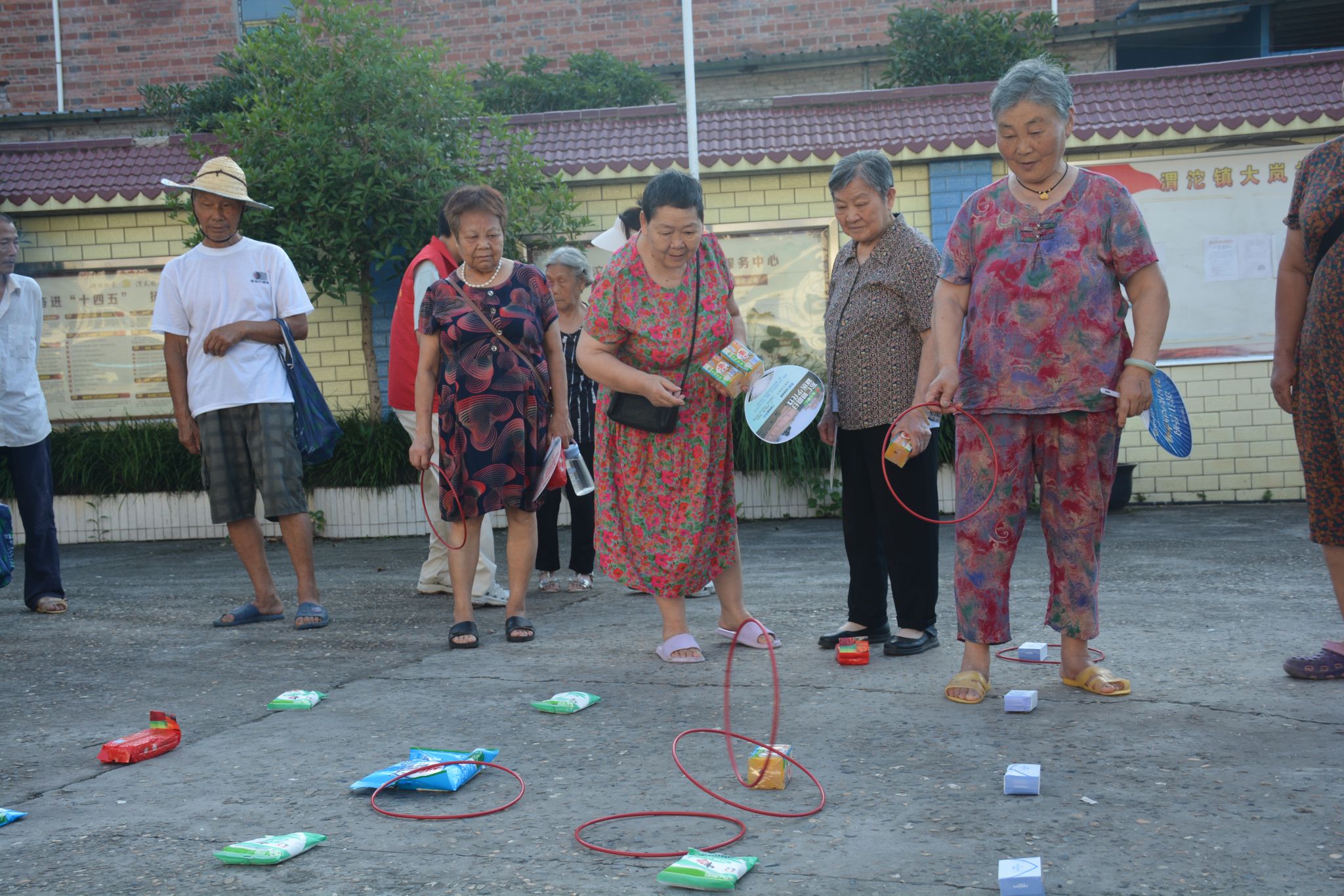 清晨7:30,志愿队的队员们就已抵达大岗村,开启了紧锣密鼓的筹备工作。一部分队员直奔村委会会议室,专注于调试投影仪、麦克风等设备,反复确认课件播放是否流畅、声音是否清晰,为讲座的顺利进行做好技术保障;另一部分队员则来到会议室下方的空地上,组织起趣味套圈活动,提前吸引村民到场。套圈礼品为洗衣粉、肥皂、盐等实用的生活用品,老人们兴致勃勃地参与其中,现场早早便热闹起来。
