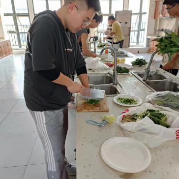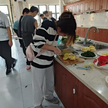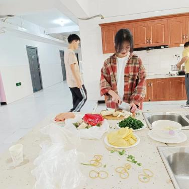 下午四点半我们到达德工厨房,全体四班成员都对食材动起了“手”,洗的洗,切的切,尽管我们中有些人在家里都没做过这些事情,但现看现学的动手能力得到了重复了的激发,并没有让我们感到困惑,每个人脸上都溢出欢乐的笑容。男生切菜,女生洗菜,合理分工,在此期间有说有笑,都融入了做事当中,熟话说得好自己动手丰衣足食,我们不是以吃饭为目的,而是以增强同学之间的默契等等去“工作”。