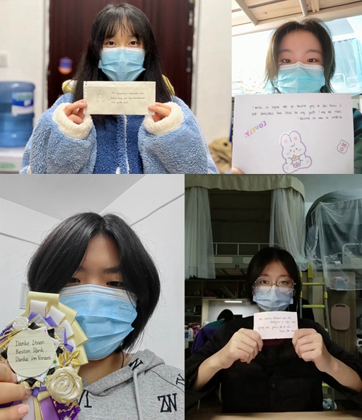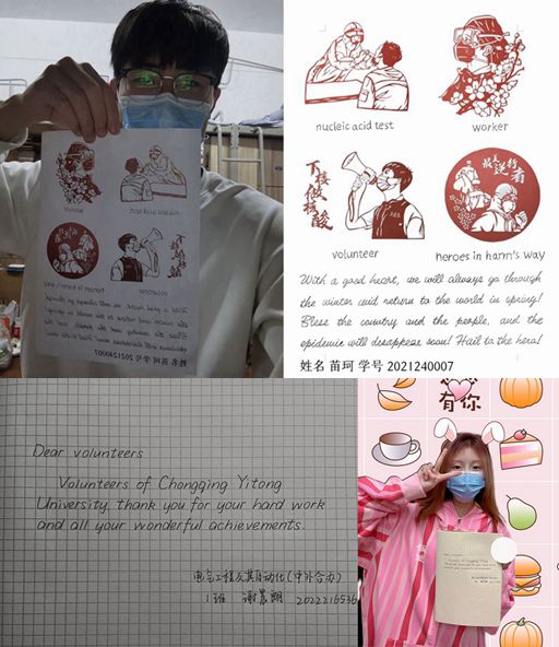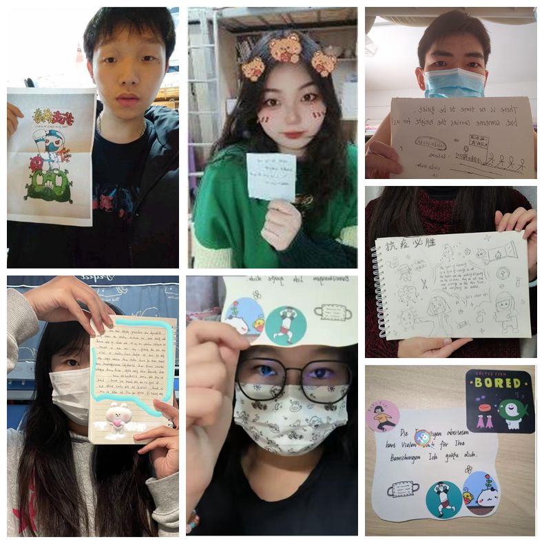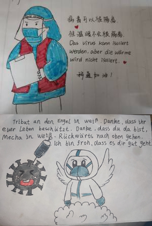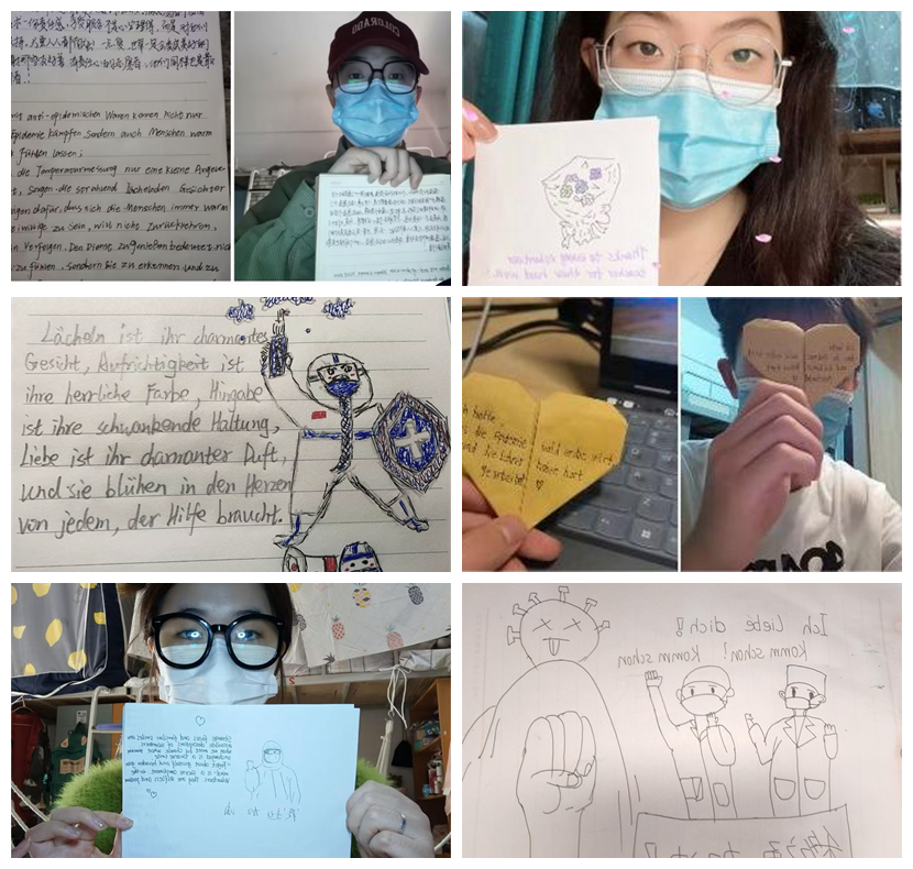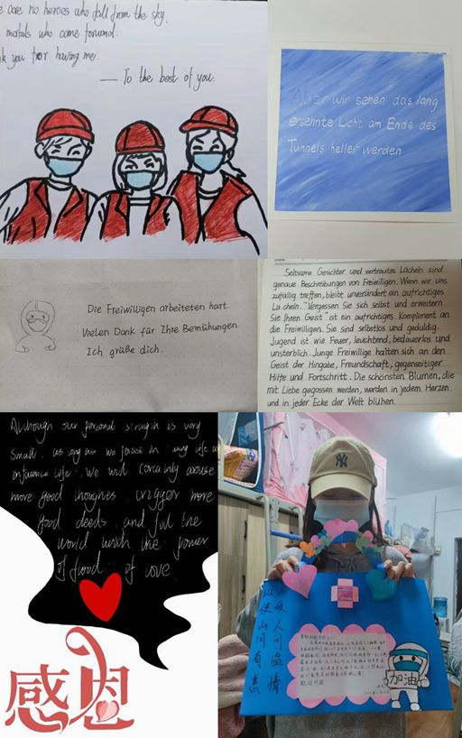 短暂的寒冬抹不去世间的诸多美好,疫情纵然无情,爱却常驻身边。同学们用一根笔,一张纸来表达爱,一笔一划,一个个可爱生动的涂鸦,德工学子们用英语、德语,绘画表达着对志愿者老师们的感激,感谢他们的辛苦付出。从活动收集到的作品可以看出同学们的热情积极,字里行间流露着真情实感。