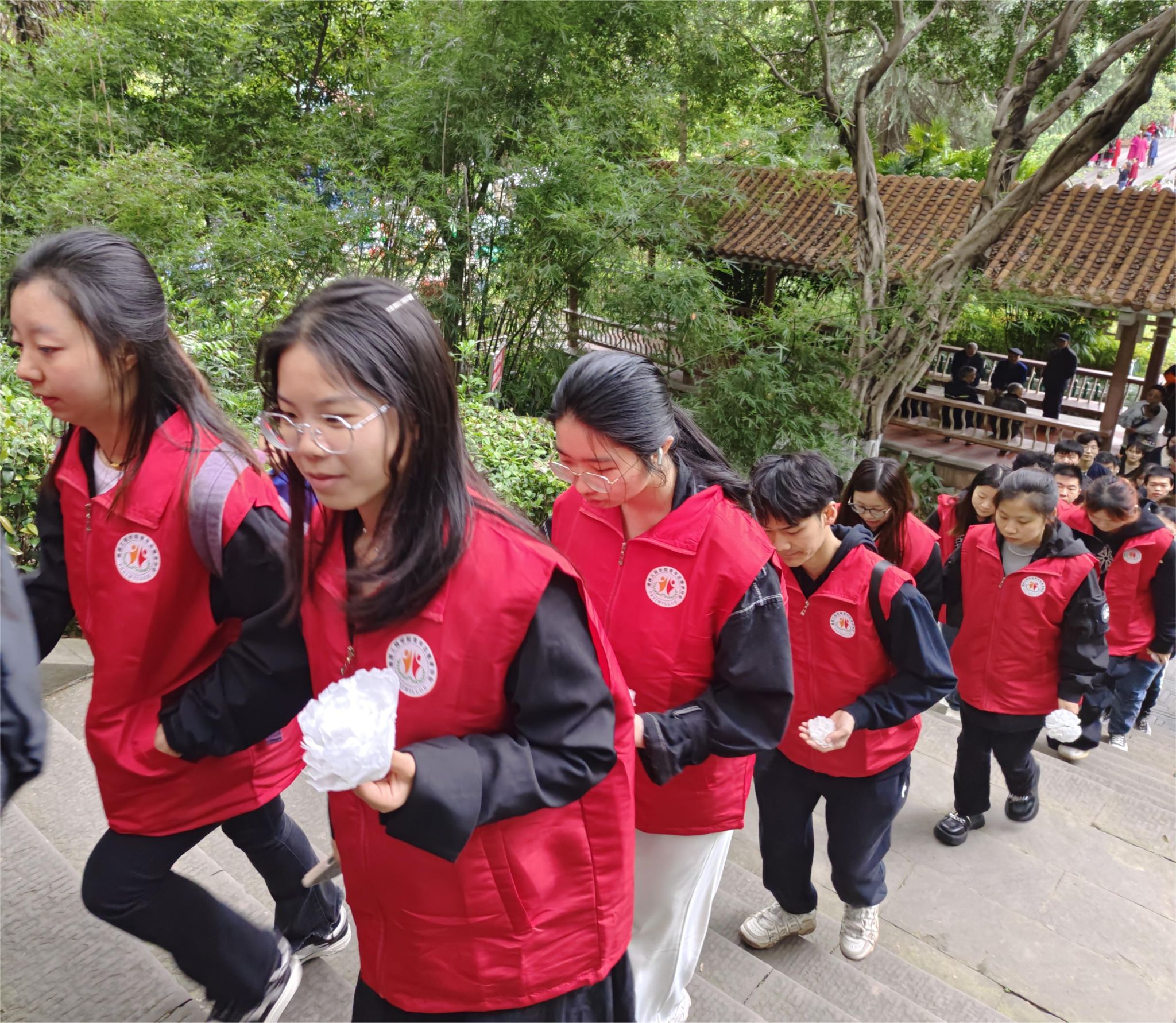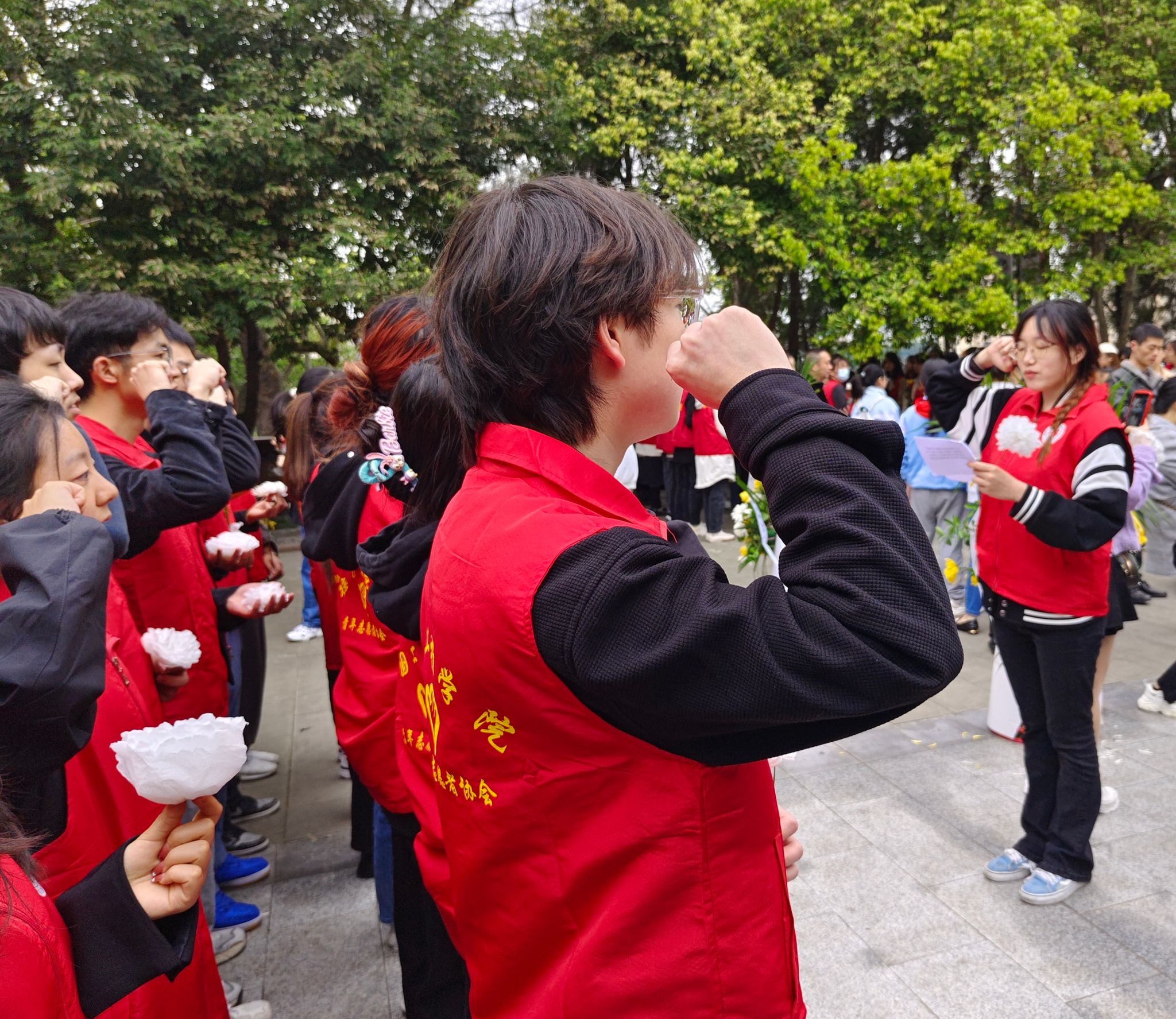 同学们怀着对先烈无比敬仰的心情,带着洁白鲜花和自己手工制作的纸花,追忆先烈的事迹,表达着自己最真挚的敬意。我们不仅是志愿者,也是新时代的弄潮儿。生命就像鲜花一样的美好,曾经的人,曾经的岁月虽然已经永远离去,依旧是我们生命里难以忘怀的温暖,影响了我们一代又一代人的生活。