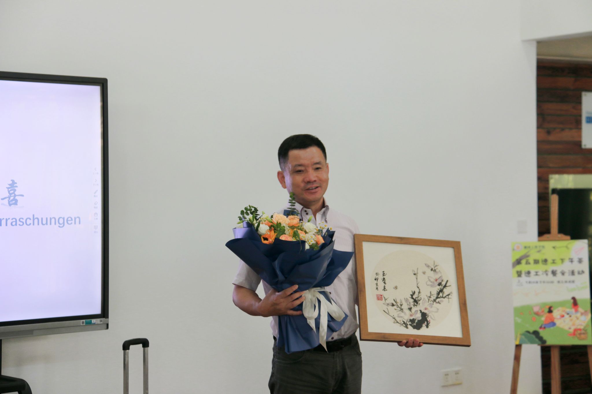 为紧贴此次下午茶的主题,机械专业的黄彦钦同学为我们带来了一首吉他演奏,随着吉他的第一声弦响起,场中所有人员都享受在声音的盛宴之中,歌声中也夹杂着对曲教授殷切的期望,愿曲教授桃李满天下,月圆正当时。最后一道声音落下,我们为曲教授准备的礼物也款款而来,有柴文涛同学亲手创作的字画和我们为其准备的花束,亲手准备的礼物总是包含着不一样的感情。