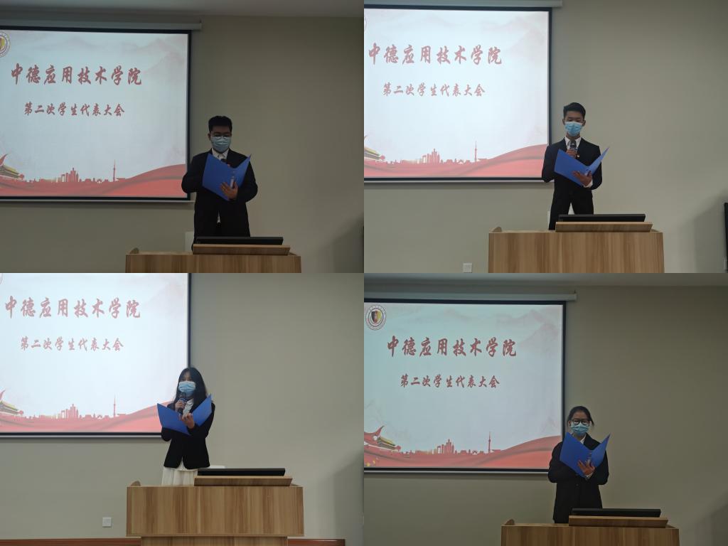 接下来是投票统计阶段,在此期间同时以全体赞成的票数通过了中德应用技术学院第二次学代会代表大会的代表成员名单。紧接着是大会的最后一项,选举产生新一届党团学新主席团成员,竞选者分别是张琪,唐琦等三人。他们以自己对工作的认识出发,谈论竞选的理由及优势。