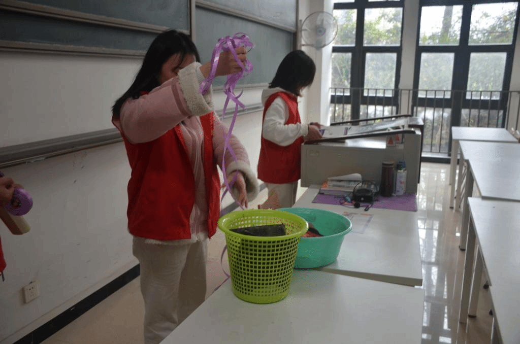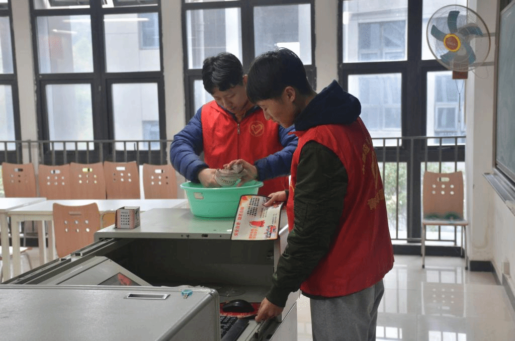 学生们分成3个小组对第六教学楼所有教室更换了印有消防安全提示鼠标垫,并对教室进行整理打扫工作,让教室在假期前夕仍继续保持干净整洁的教学环境。