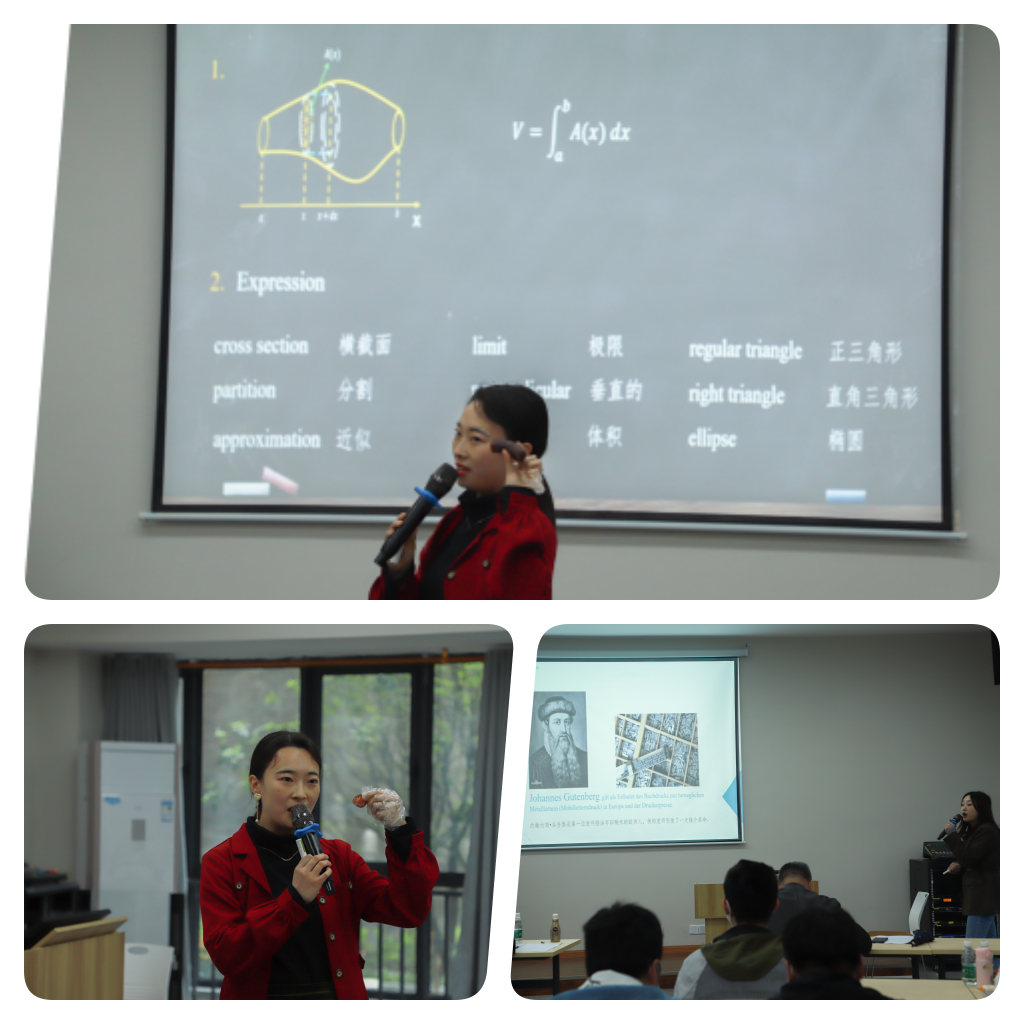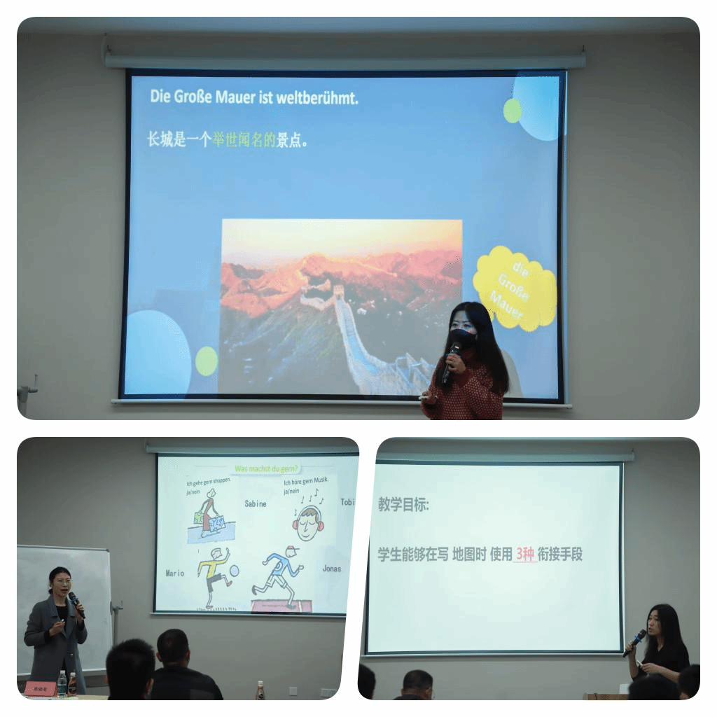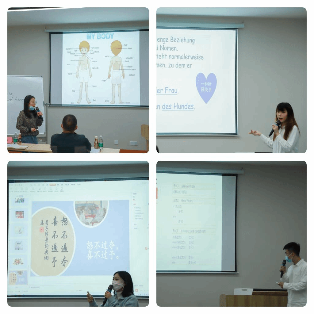 本次比赛分为教学设计、现场说课和现场教学3个环节。参赛教师巧思频频,采用多种教学手段,与学生互动自然而富有启发,为大家呈现了一场场精彩的现场说课与现场教学。陈燕骄老师以计算香肠体积的形式引入定积分的学习,杨洪老师将德语就医主题与中医的“望闻问切”相结合,生动而有趣。另外,老师们都能够巧妙地将中国元素和当下时政热点无痕地融入自己的教学活动中,比如钱柯竹老师在讲颜色与心理测试时提到了冬奥主题,贾云童老师在讲解“主意与发明”时以我国的四大发明为例,秦艳老师在德语练习中融入了长城、动车和女足等主题。