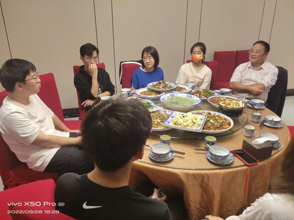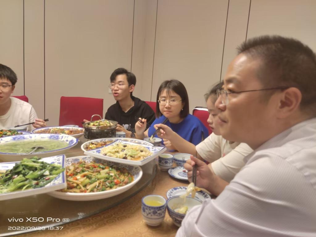 共膳中,尹浩亮院长和李伟光院长起身为同学们盛饭,大家心里滋生了满满的感动和喜悦,对学院归属感愈发强烈。一位同学激动地说“从未想到能与各位老师坐在一起吃饭,学院院长原来这么亲切。”席上一派融融之景,师生无不倾心畅谈。聊到课余生活,戴苏老师鼓励同学们追求自己的兴趣爱好,积极参加社团或组织提升个人能力,开放自己,展现自己。李伟光副院长向大家介绍了完满教育的理念,鼓励同学们全面发展,行稳致远。