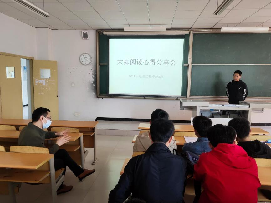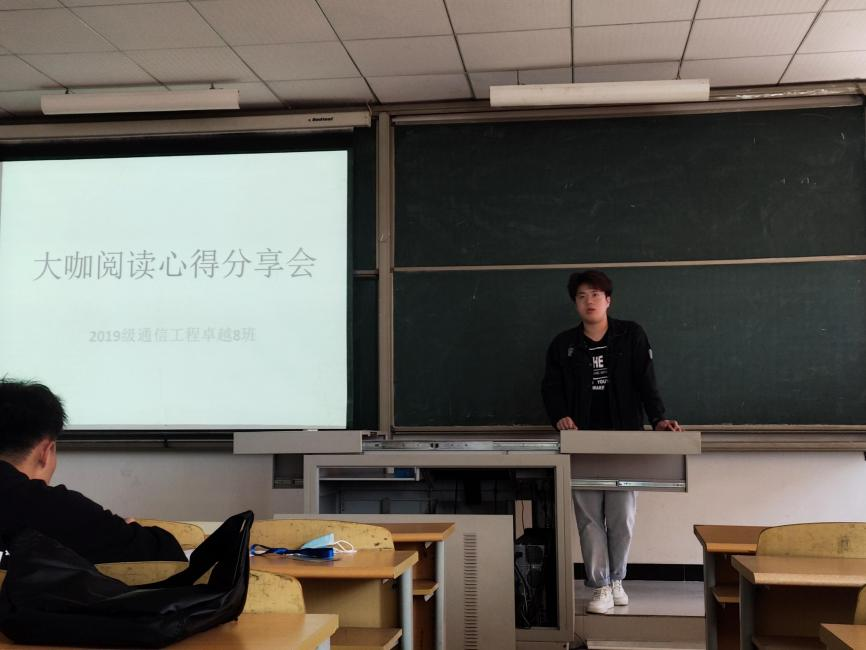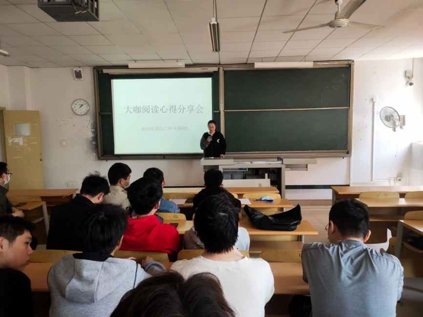 书籍是人类进步的阶梯,大咖是行业内成功的范例。为提高同学们的阅读素质,增加同学们的知识储备,在4月20日中午,2019级通信工程卓越8班的全体同学在四教五楼4505教室举行大咖阅读心得分享会。