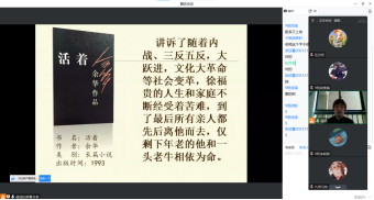 在活动的正式开始时,谌老师先是用疫情,再加上一些例子对分享的书籍《活着》进行铺垫,然后用了作者余华一句“人之所以活着,是为活着本身活着,而不是为活着之外的任何事活着”,向同学们提出问题你们对生活是什么看法?并让同学们在分享完后进行解答,然后开始了书籍《活着》的分享,分享的流程大致为对余华的对书籍的作者余华进行了介绍;剧情进行了解读,以富贵一生为主线讲述他与家人的一生;以及对书中出现的各个角色性格、遭遇等等进行了相应解读。