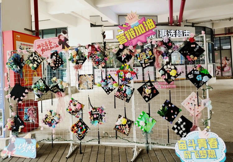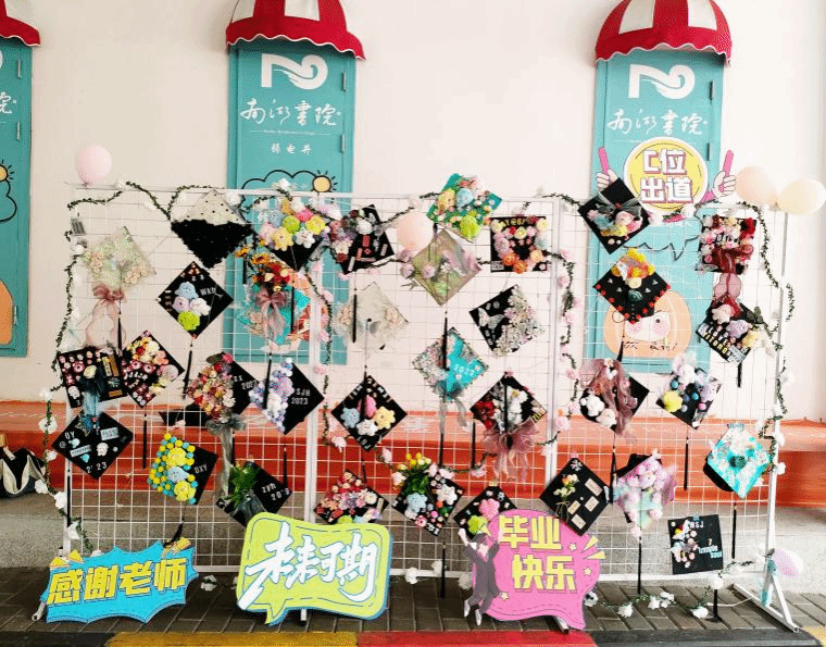 师生们创作完毕业帽,将毕业帽挂置得非常美观,学生们各显神通、各具特色的毕业帽摆设成行,呈现出五颜六色的视觉盛宴,分外引人注目。