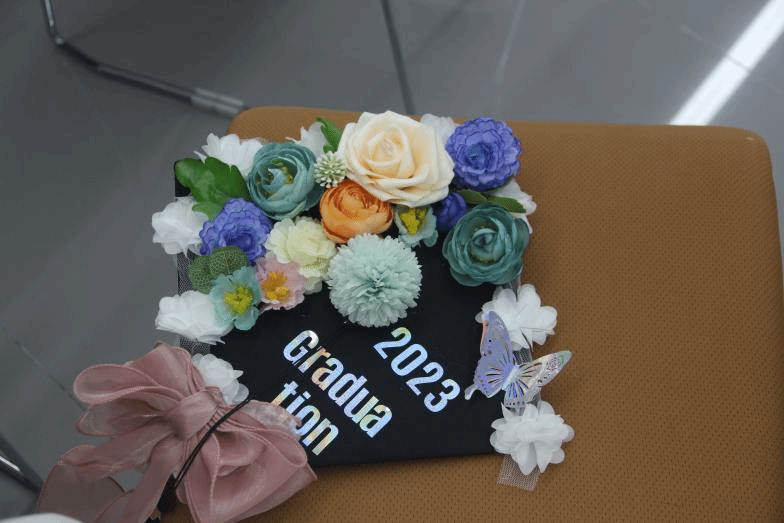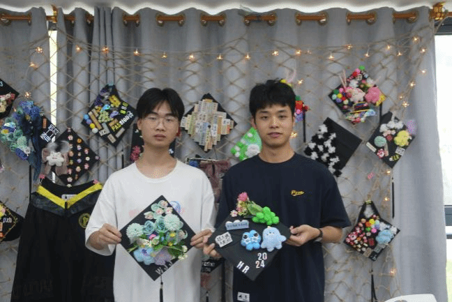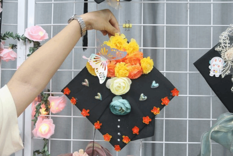 阶段二,由自主报名的同学们进行毕业帽diy。在这个值得纪念的大学毕业季,同学们在创作毕业帽的活动中展现了无穷的热情和细致。在整个创作过程中,同学们充分释放自己的想象力和创造力,在材料选择、设计、制作和装饰过程中不断尝试和探索,思考着如何把自己的内心追求和外在的艺术表达完美地结合起来。他们仔细钻研每一个细节,不断调整尺寸、颜色和形状,相互取长补短,共同挖掘出完美和共鸣的点,从而让作品更加丰满和令人赞叹。