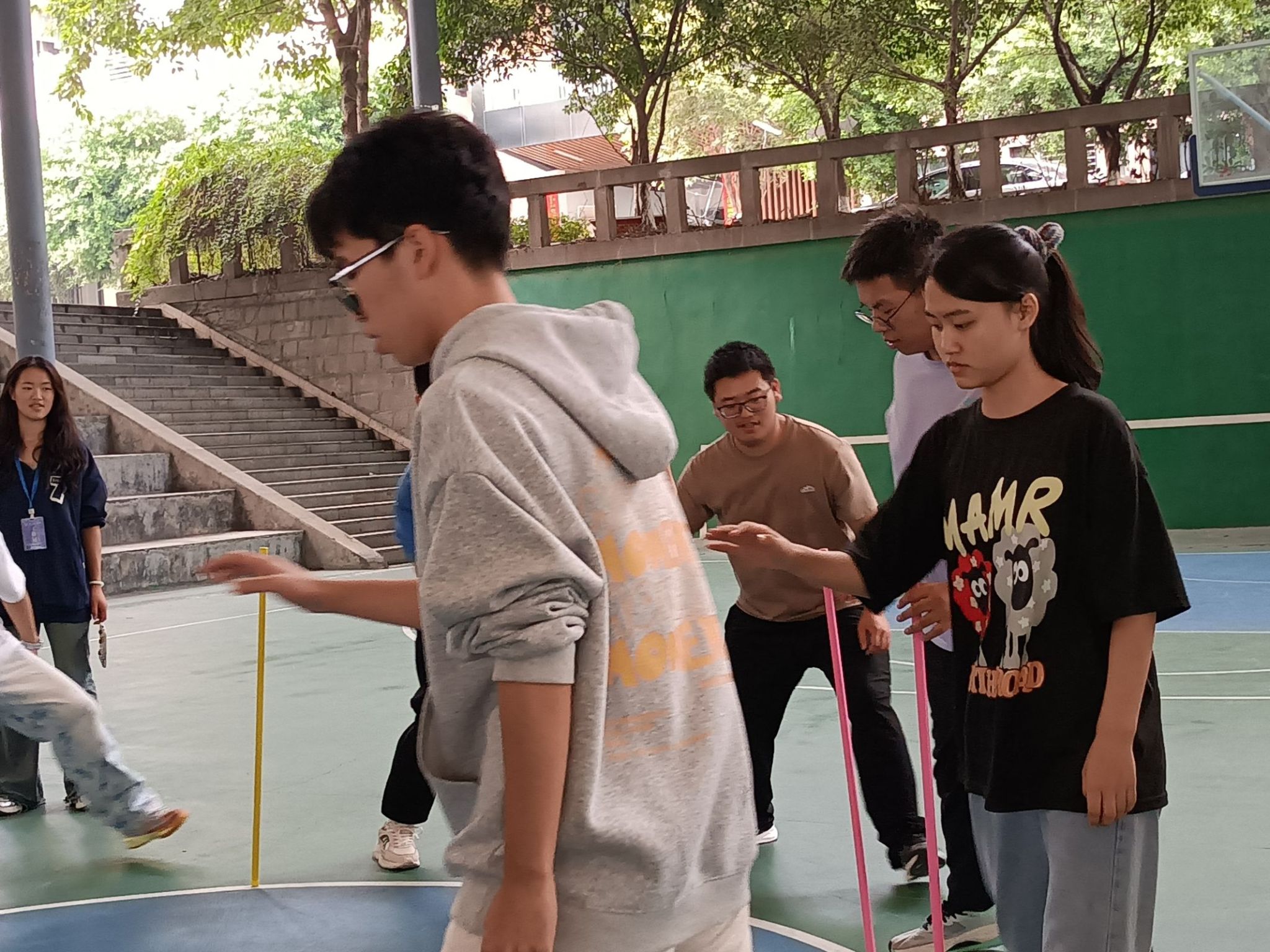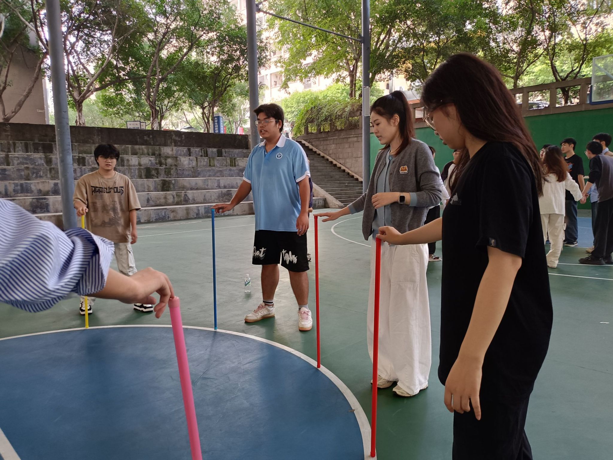 在此项游戏里,老师和同学们展现了卓越的团队协作精神,通过精确的移动和默契的配合,共同保持杆子稳定。这场活动不仅锻炼了团队成员的协调能力,还加深了彼此间的信任与合作。