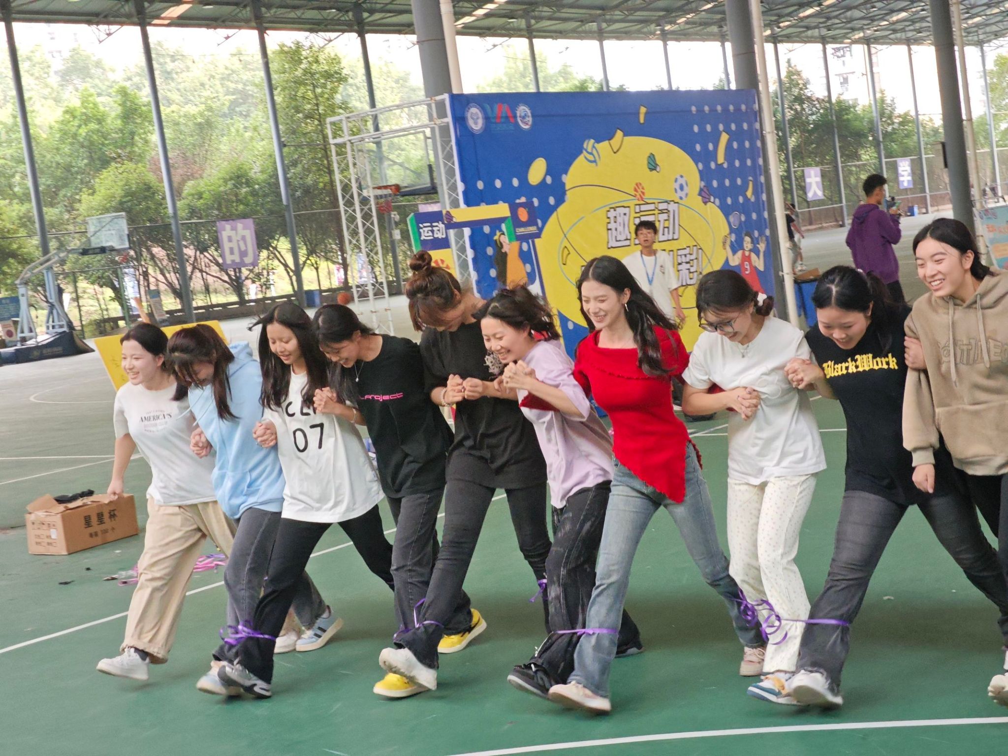 在现场的一隅,随着裁判的一声令下,各小组的同学们齐声喊着“一二、一二”的口号,努力协调步伐,奋力向前迈进。他们脸上洋溢着坚定而兴奋的神情,每迈出一步都伴随着大家共同的呼喊声。现场加油助威的声音此起彼伏,整个氛围紧张而又充满欢乐。