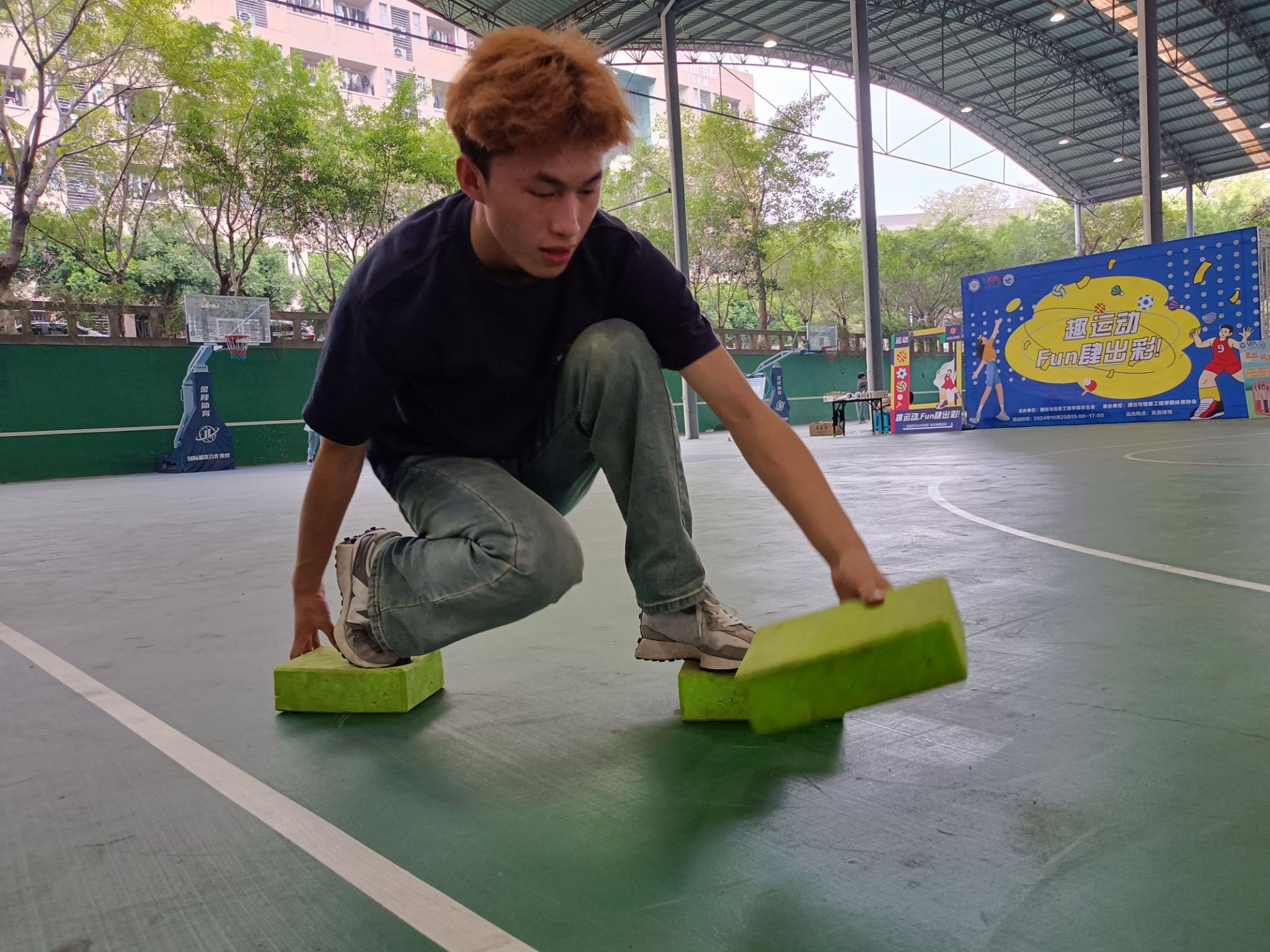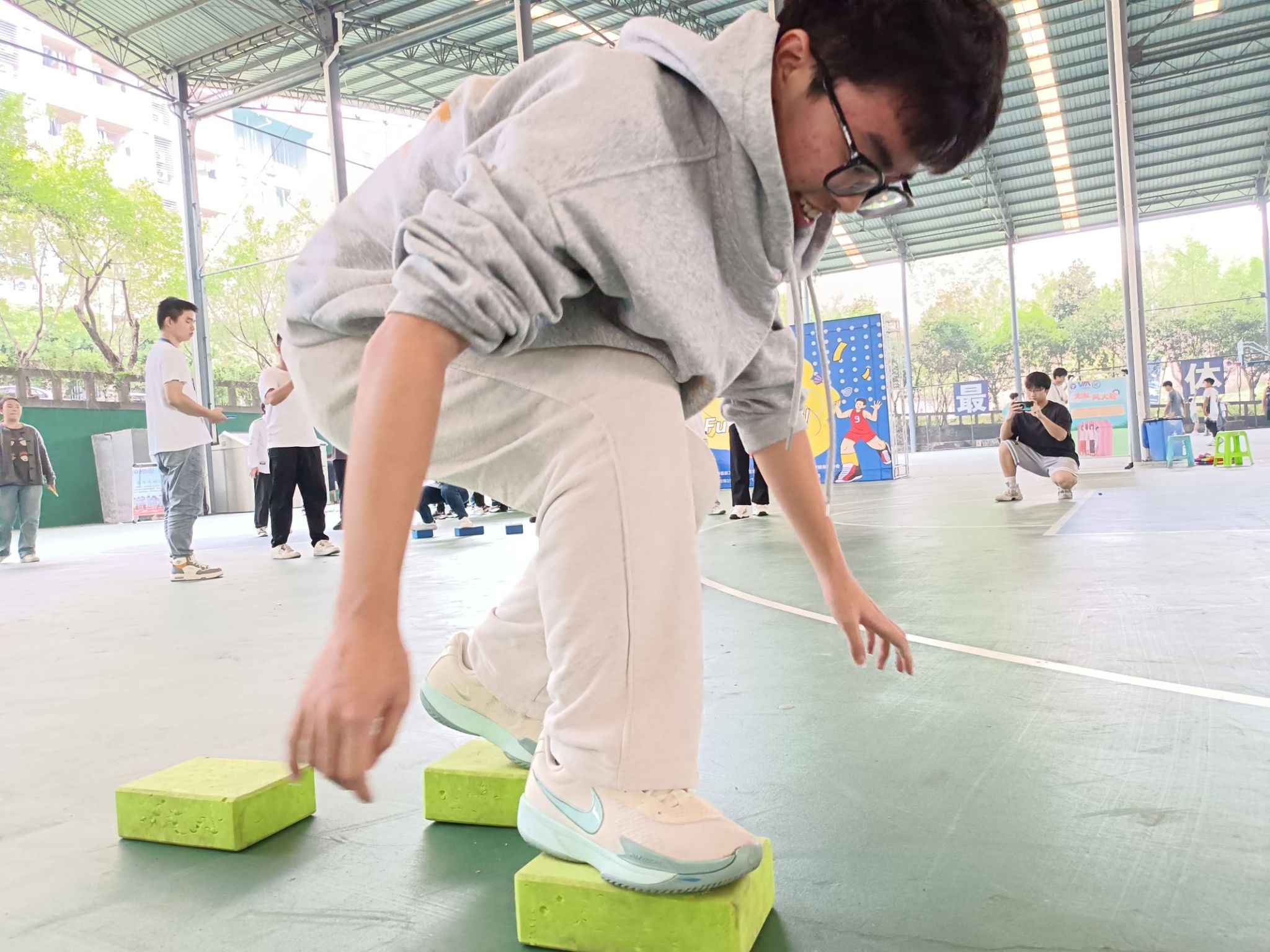 这款小游戏虽然看起来简单,实际上却对同学们的平衡感和持久力提出了挑战。在放置方块的过程中,有些同学未能精确掌握间距,导致在落脚时几乎要失足,身体摇摆不定地努力保持平衡,那惊心动魄的瞬间让旁观者不由自主地为他们捏一把汗。相反,当有同学成功完成一段距离,并将方块顺利传递给下一位队友时,观众席上便会爆发出一阵阵热烈的掌声和欢呼,整个游戏过程既具有一定的挑战性,又充满了乐趣和刺激。
