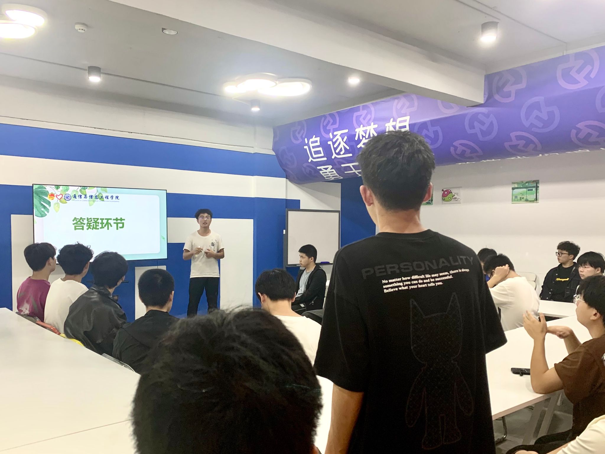 在提问环节,同学们积极踊跃地提出“关于数学竞赛和专业竞赛如何抉择、怎样找寻有意义的事情、有没有必要入党、毕业后先就业还是先创业等问题。在面对每位同学的问题时,石景瑶学姐和肖进程学长针对同学们提出的问题逐一耐心地进行解答。
