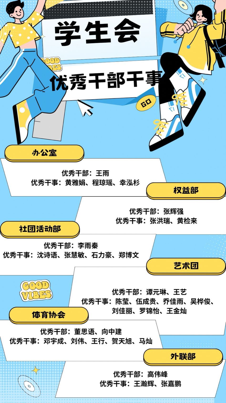 在此愿评选上优秀干部干事的同学戒骄戒躁,以谦逊之态,引领更多同学投身于学生组织这一充满活力与挑战的舞台,共同推进我校完满教育的发展。希望未评选上优秀干部干事的同学能审视自身思想之舟,校准方向,以更开阔的视野和深邃的洞察力,重塑内心的价值坐标,十一月榜单期待各位上榜!