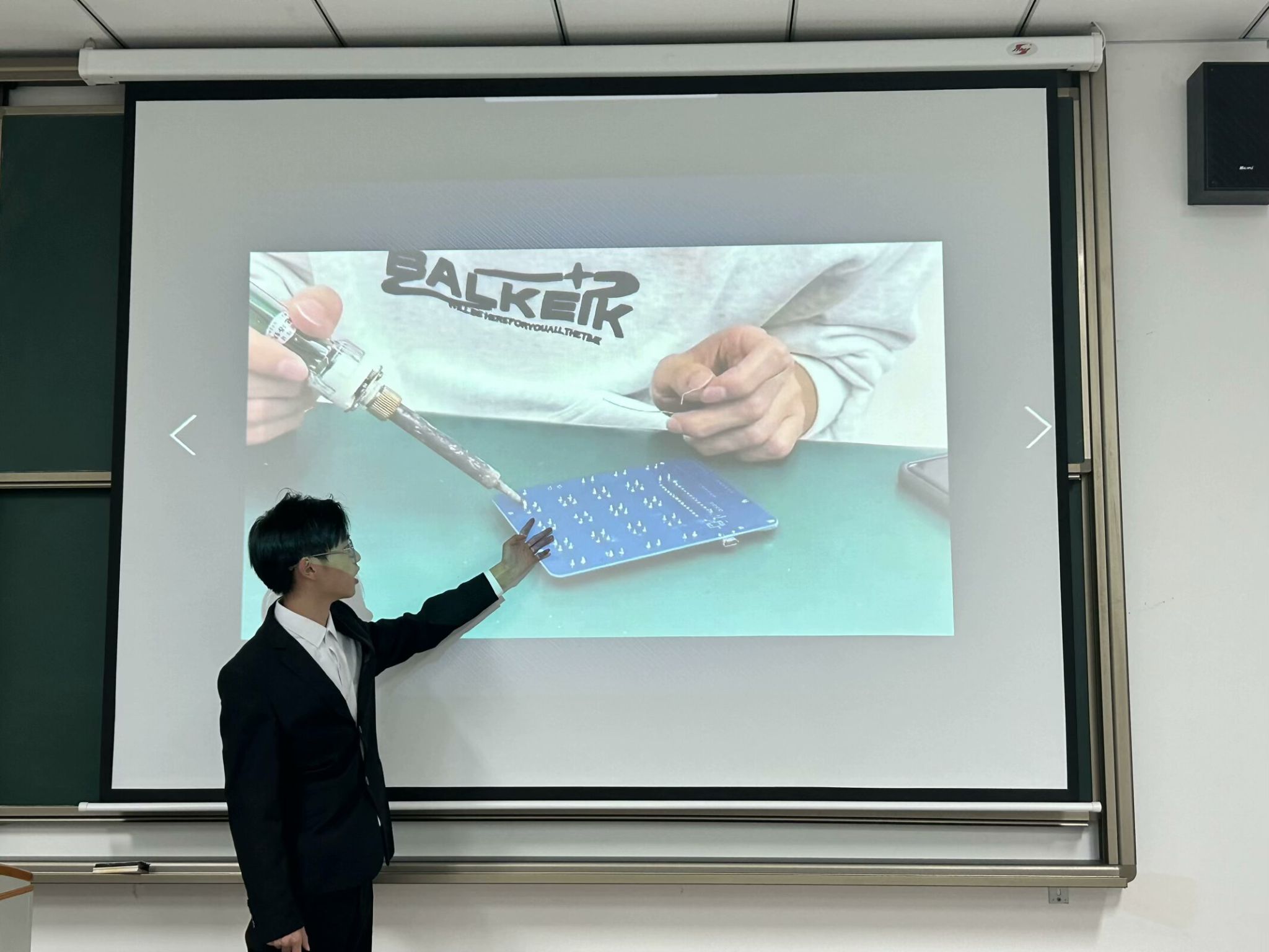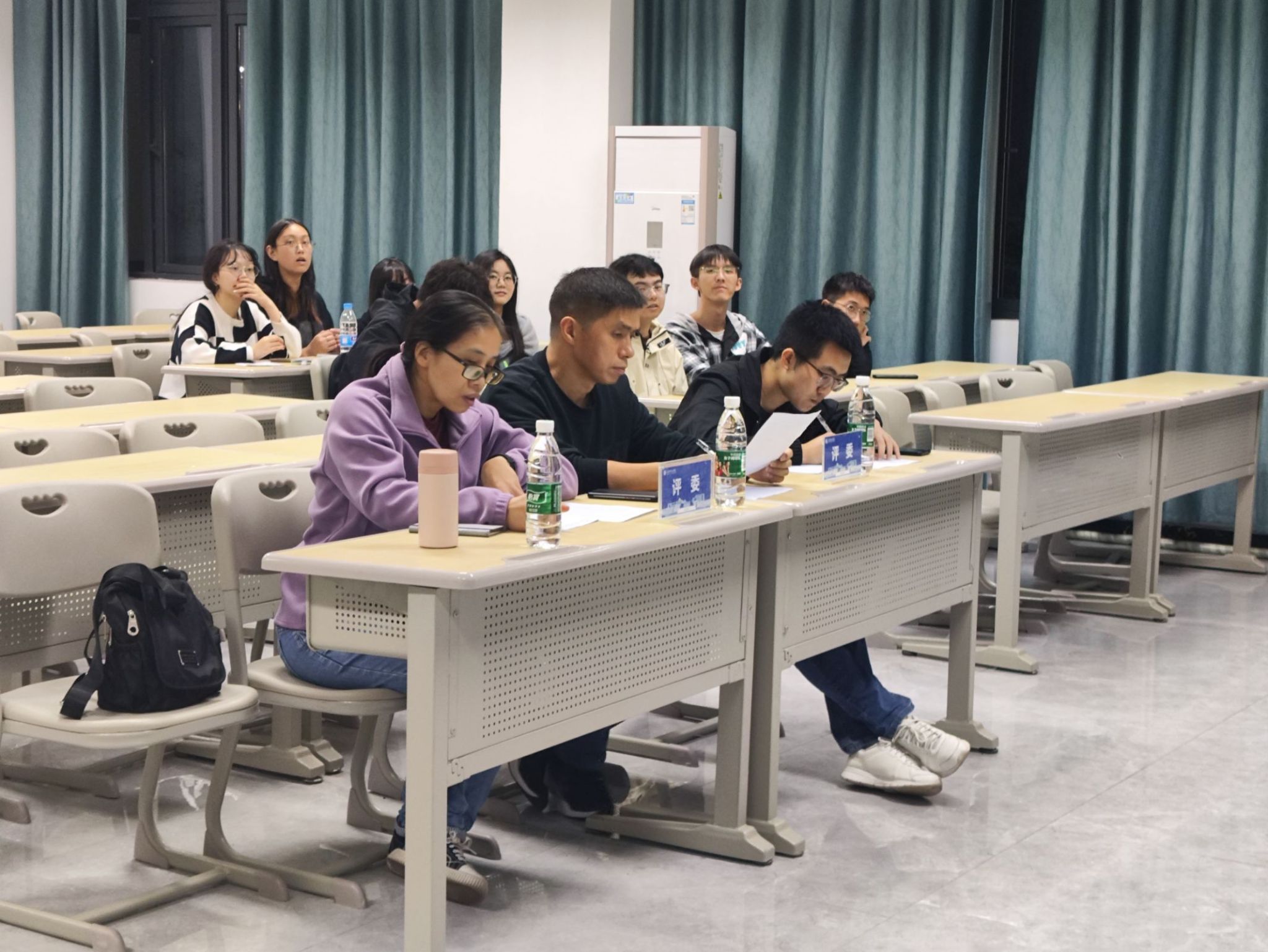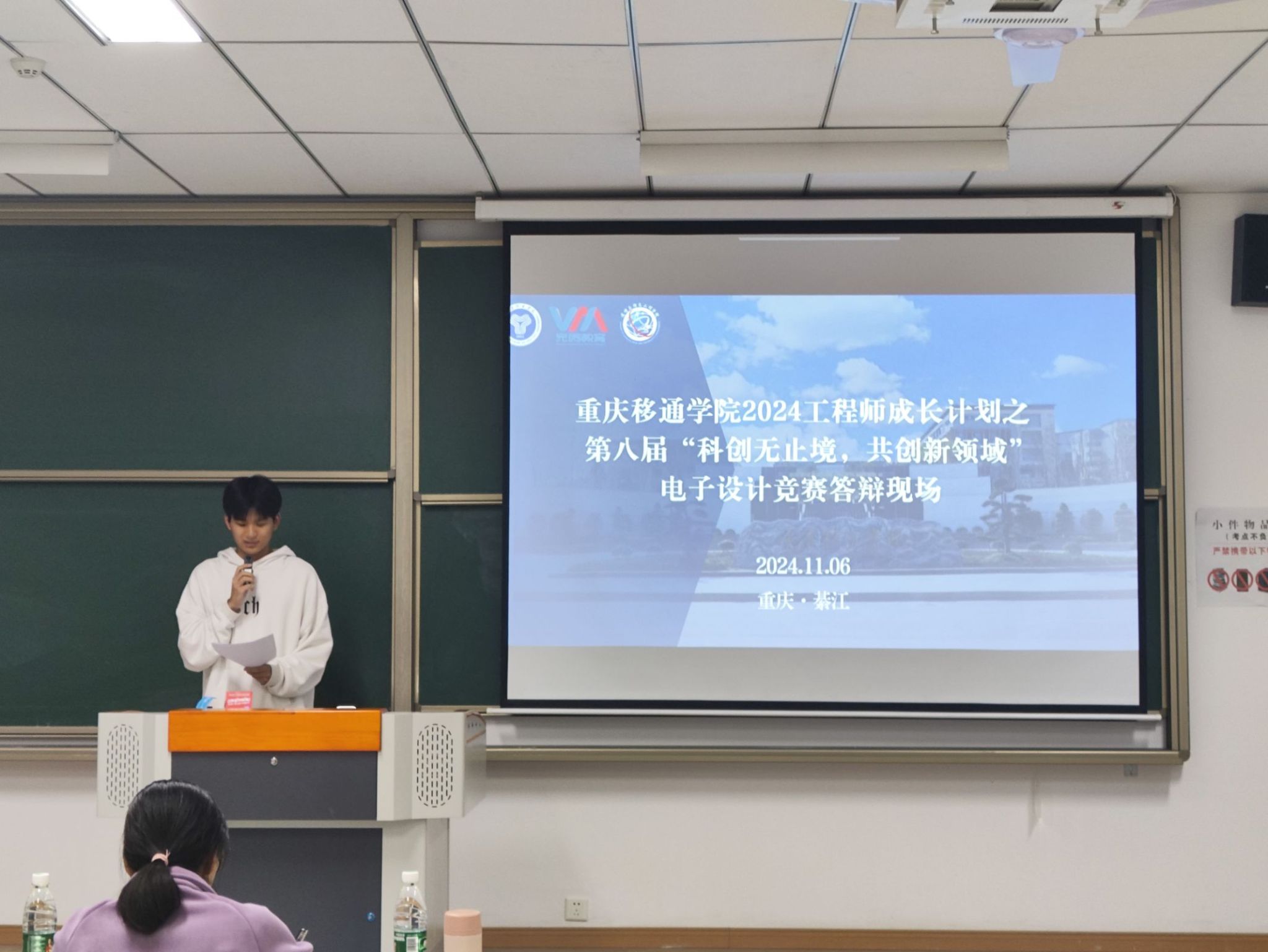 11月6日19:00,电子设计竞赛的答辩环节在行者楼303至306教室开展,72支队伍分成四批,在相应教室进行答辩。工作人员早已精心布置好现场,静候各路选手的到来。答辩序幕拉开之前,参赛同学们信心满满地表示,他们已厉兵秣马,蓄势待发,渴望在竞技舞台上绽放自己的智慧光芒,展现非凡才华。