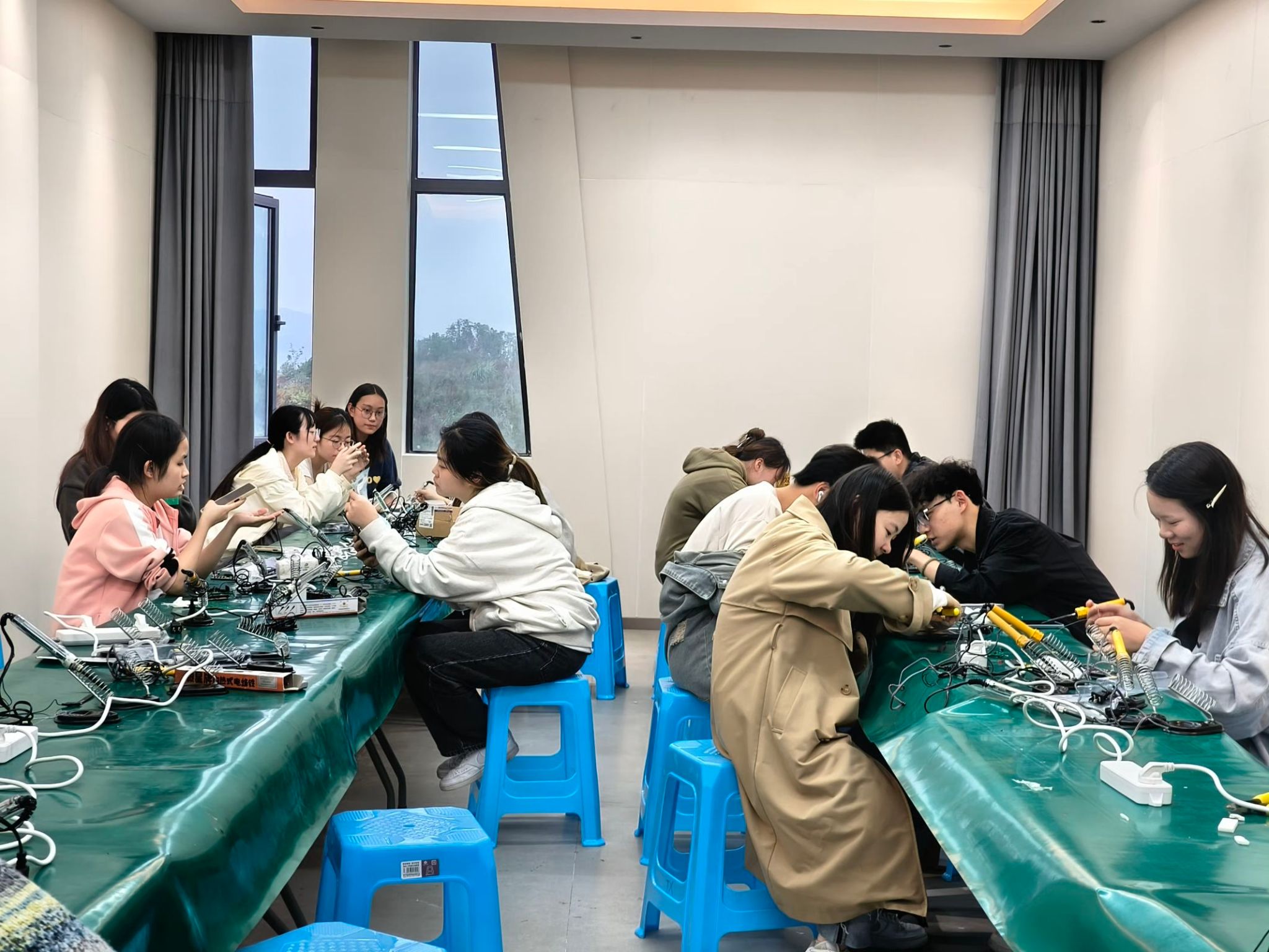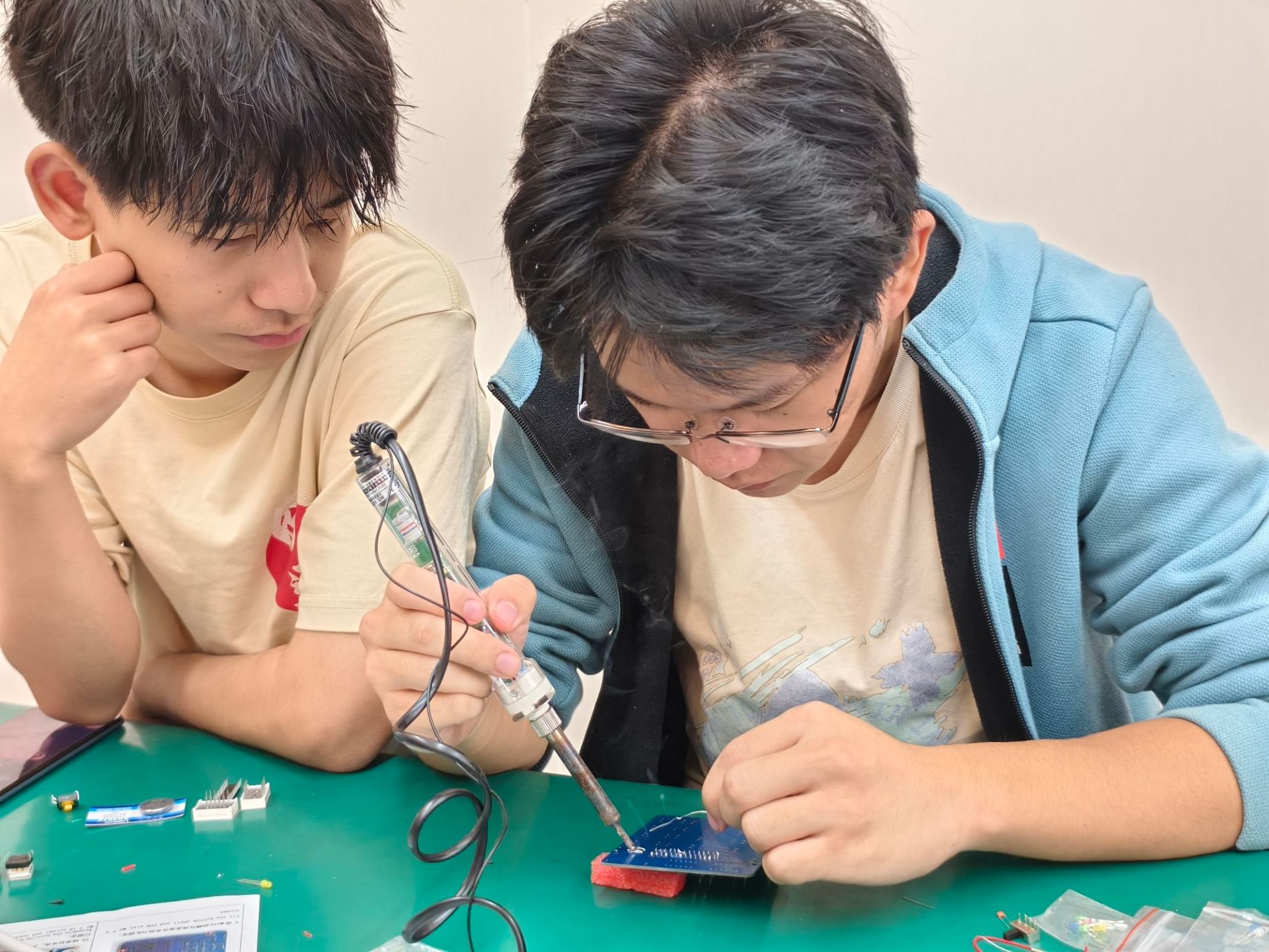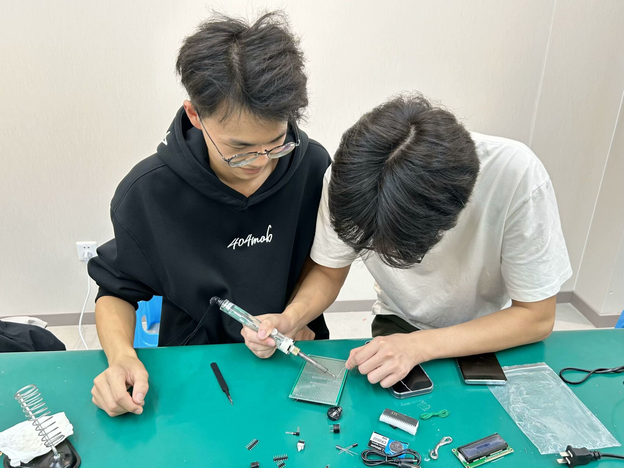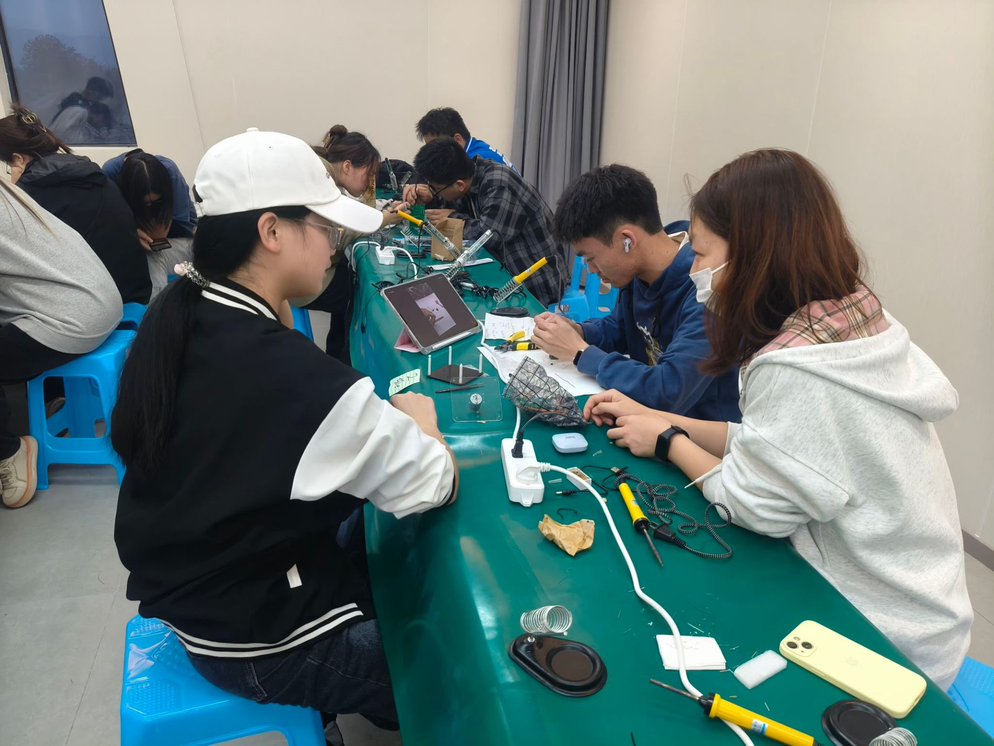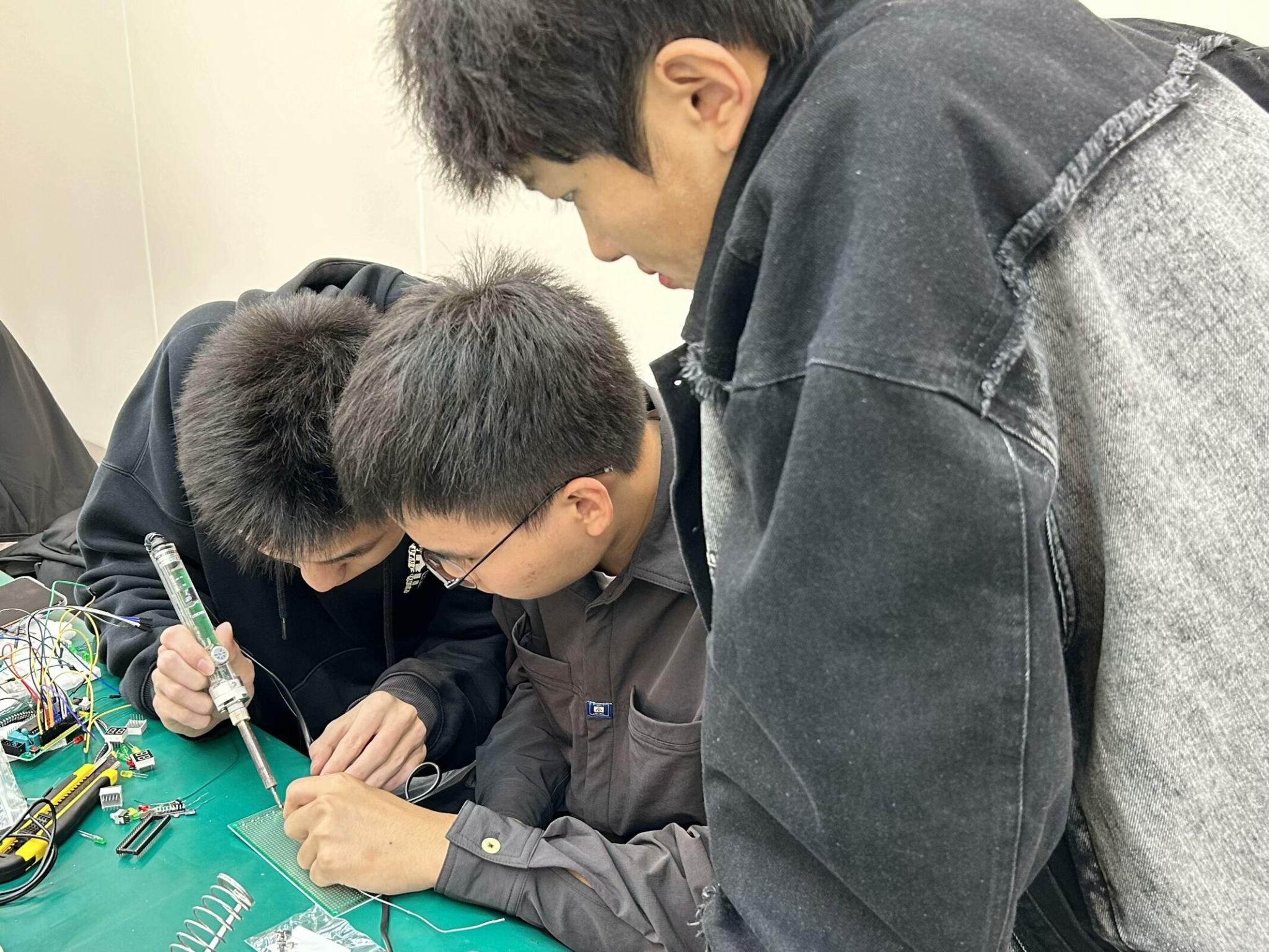 10月30日至11月6日,同学们根据自身专长与竞赛选题,精心选定项目内容,在6天的紧凑日程中,倾注心血于作品的设计与制作。在作品制作现场,同学们对作品进行设计、焊接、细致测试与不断优化。现场讨论热烈,同学们争分夺秒地赶工调试,制作现场氛围热烈非凡。这股浓厚的学习氛围不仅鼓舞人心,也让同学们对电子设计领域充满敬意与向往。