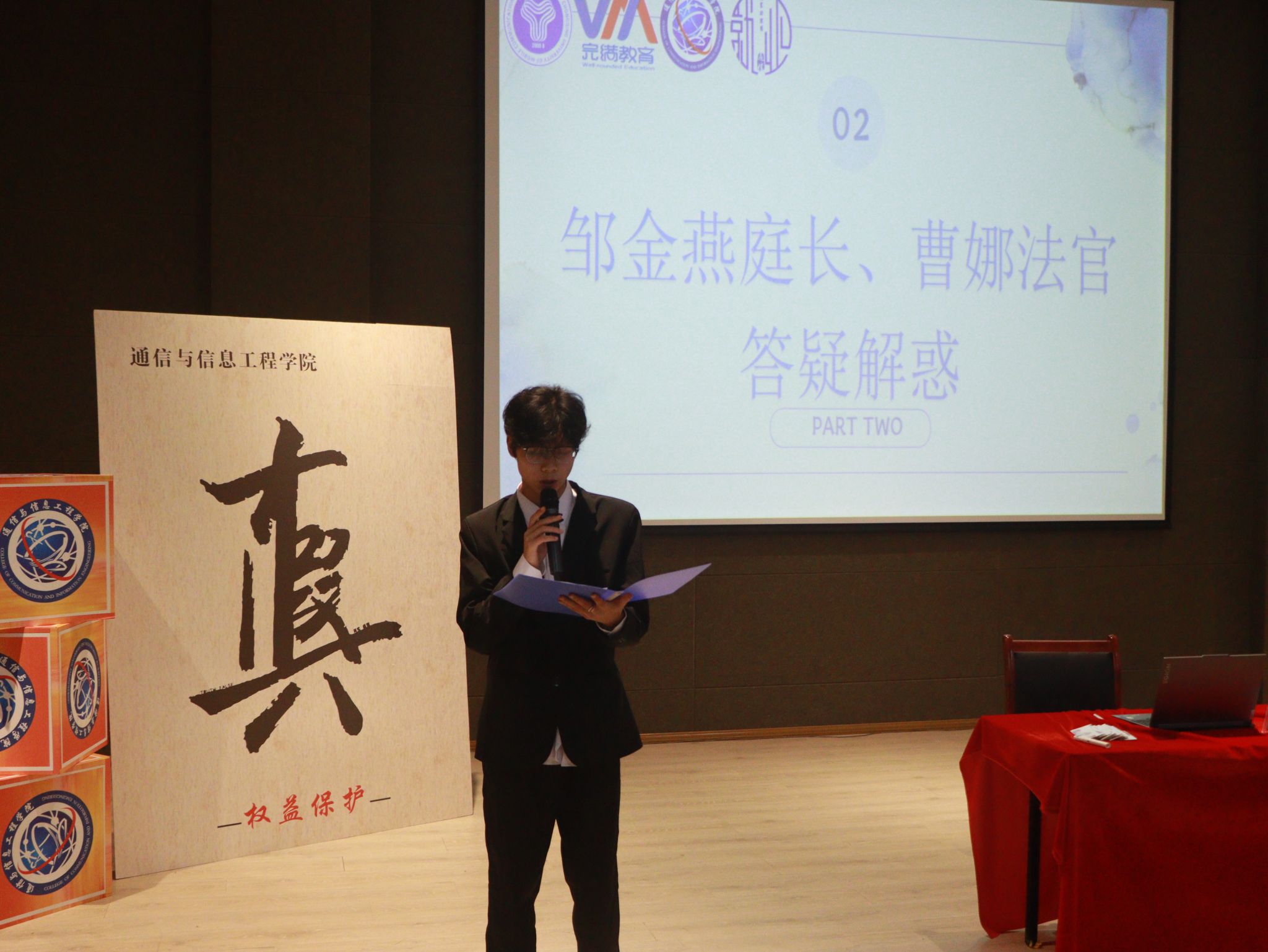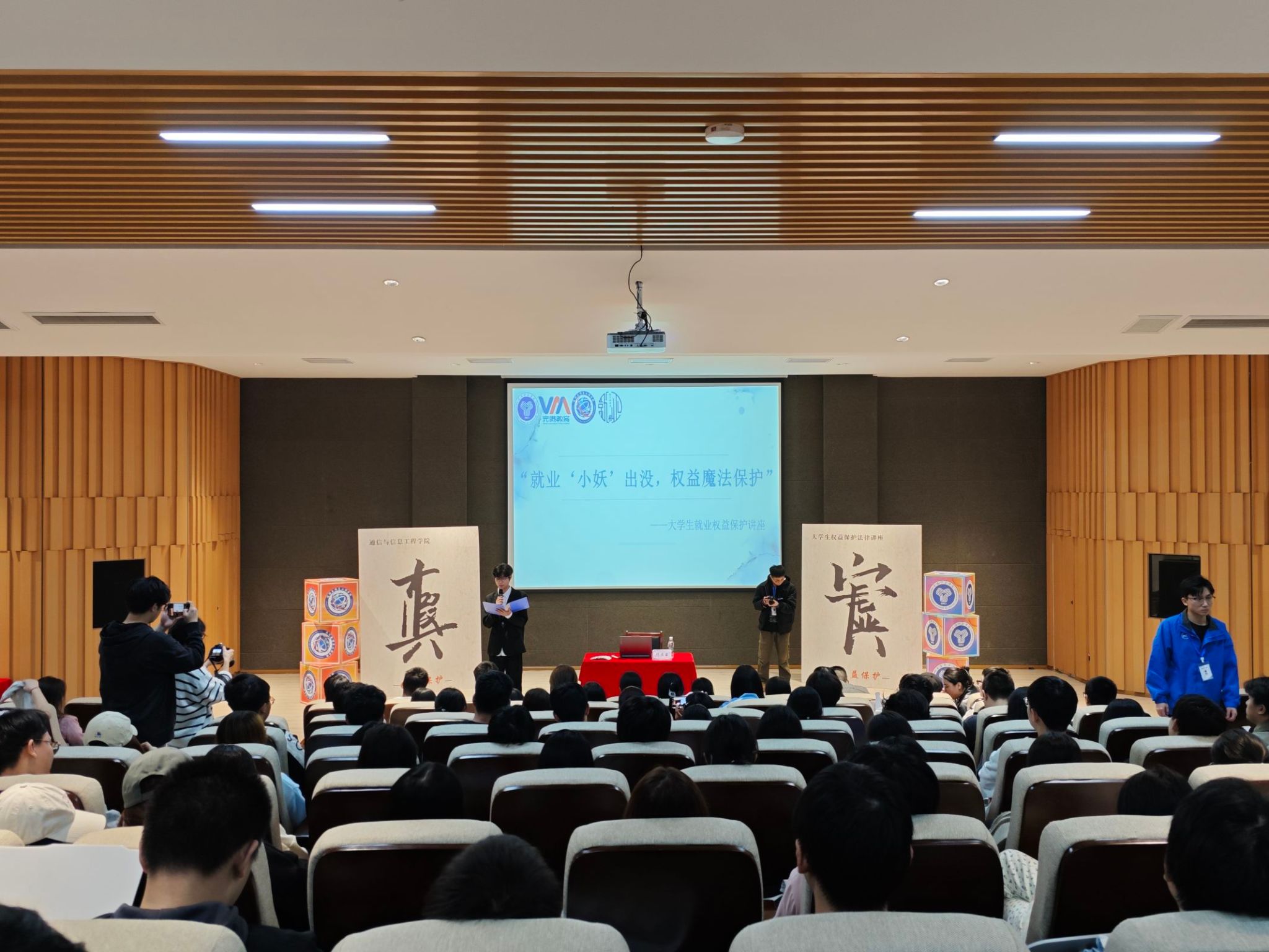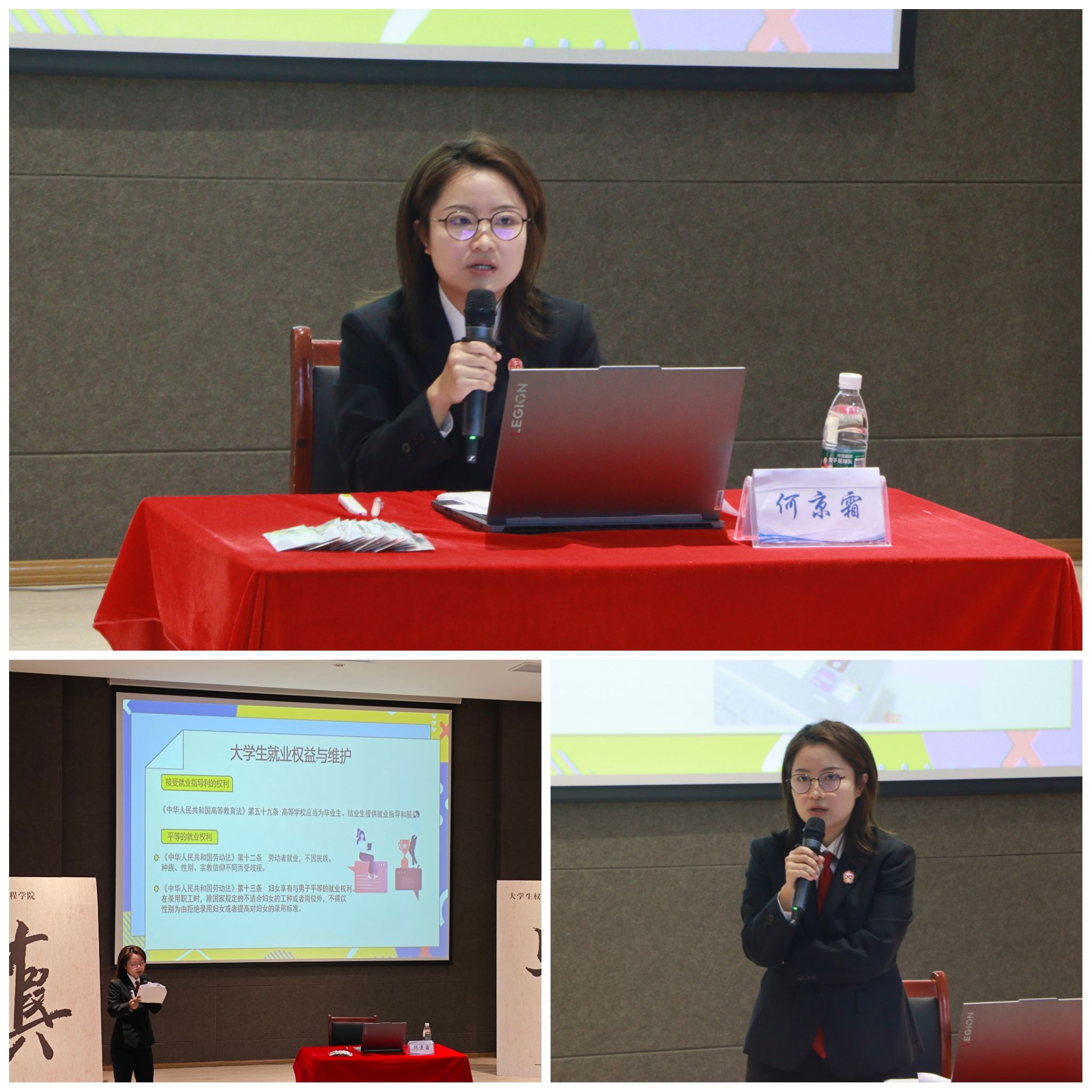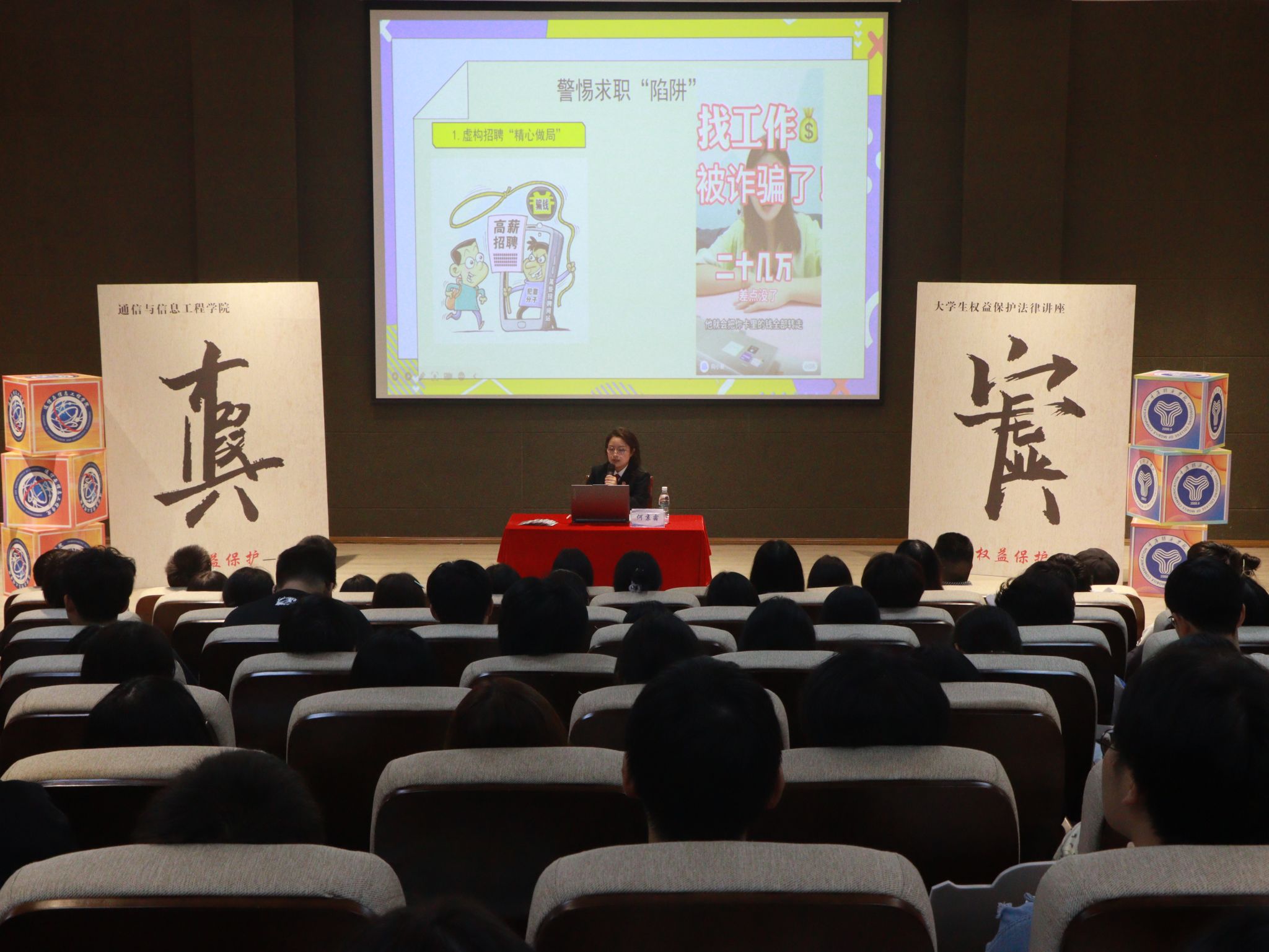 随着高校招生规模的扩大以及就业市场竞争的白热化,大学生所面临的就业形势愈发严峻,有部分学生在从事就业和兼职工作时,因为缺乏必要的法律知识和维护自身权益的能力,从而导致权益受损现象的产生。为助力同学们在未来的就业中具备维护自身权益的能力,避免在求职就业中遭受不法侵害。由重庆移通学院校学生会主办,通信与信息工程学院学生会权益部、就业助理团、学生工作办公室承办的“就业‘小妖’出没,权益魔法保护”——大学生就业权益保护讲座,于2024年11月8日在六度空间-无限多功能厅顺利开展。本次活动有幸邀请到重庆市合川区人民法院团委副书记何京霜作为主讲嘉宾,合川区人民法院民三庭副庭长邹金燕、民三庭法官曹娜作为特邀嘉宾为同学们分享知识、答疑解惑。通信与信息工程学院团总支书记孙怡老师、学生工作办公室主任苟凡铖老师、就创办主任李林燕老师以及200余名学生共同参与了此次活动。