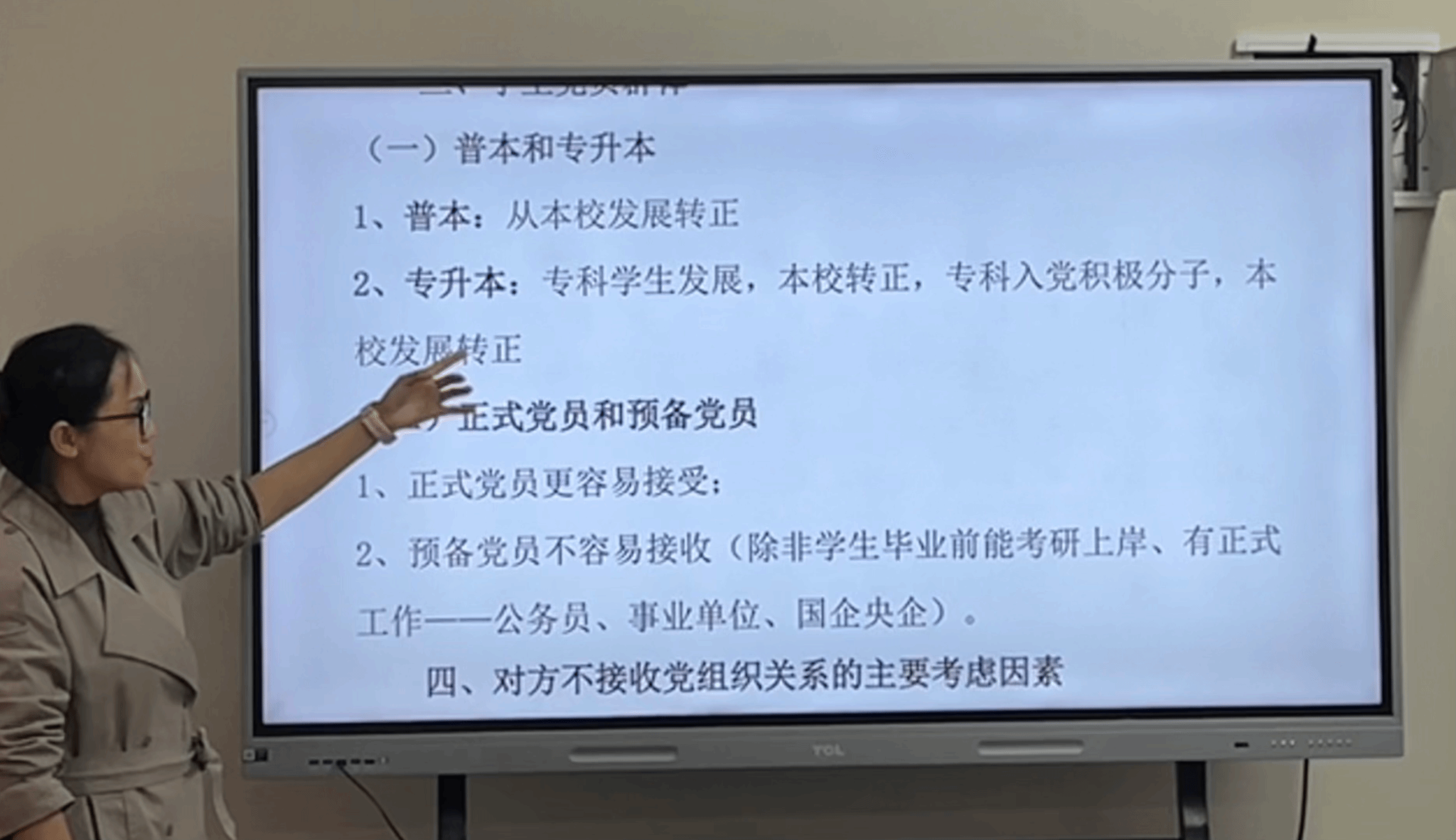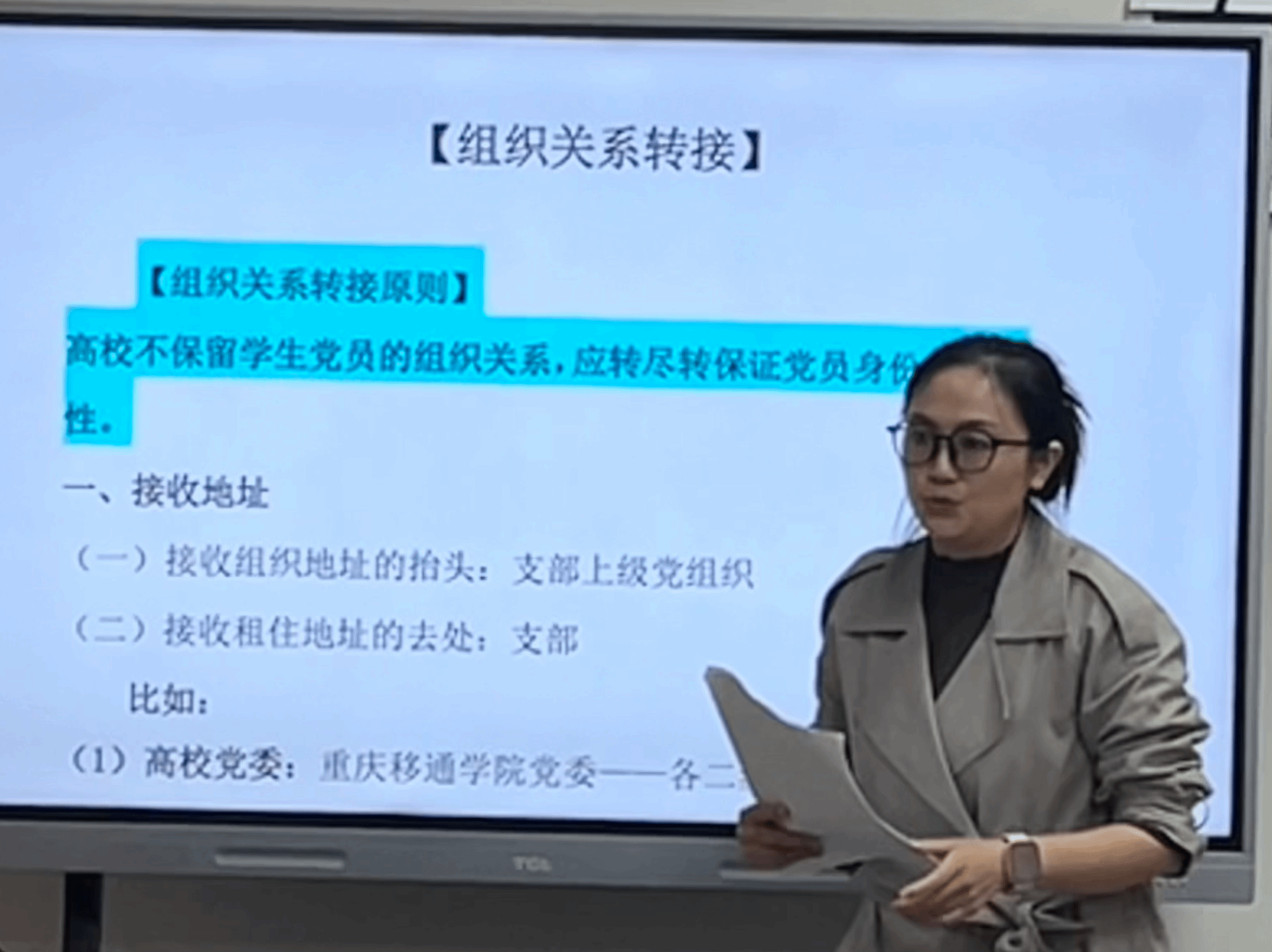 余洋老师就毕业生组织关系转接进行了详细讲解。她强调,高校不保留学生党员的组织关系,应转尽转,以保证党员身份的延续性。余老师详细介绍了接收地址的确定、转接途径以及转接分类,特别指出市内转接可以通过“渝快政”红岩智慧党建平台直接发起,而市外转接则需要线上和线下相结合的方式。余老师还针对学生党员群体,特别是普本和专升本学生,以及正式党员和预备党员的转接问题进行了说明,剖析了对方不接受党组织关系的主要考虑因素并分享了相应的解决措施。