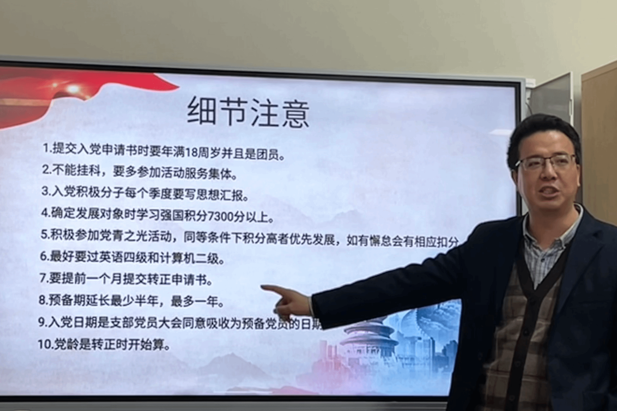 在分享会的最后,余老师结合自身工作实践提出了几点建议,包括端正学生入党动机、建立谈心谈话机制、发展党员的考核机制、培养学院党员干部队伍以及召开党组织生活会等,以提升学生党员的党性和政治思想。