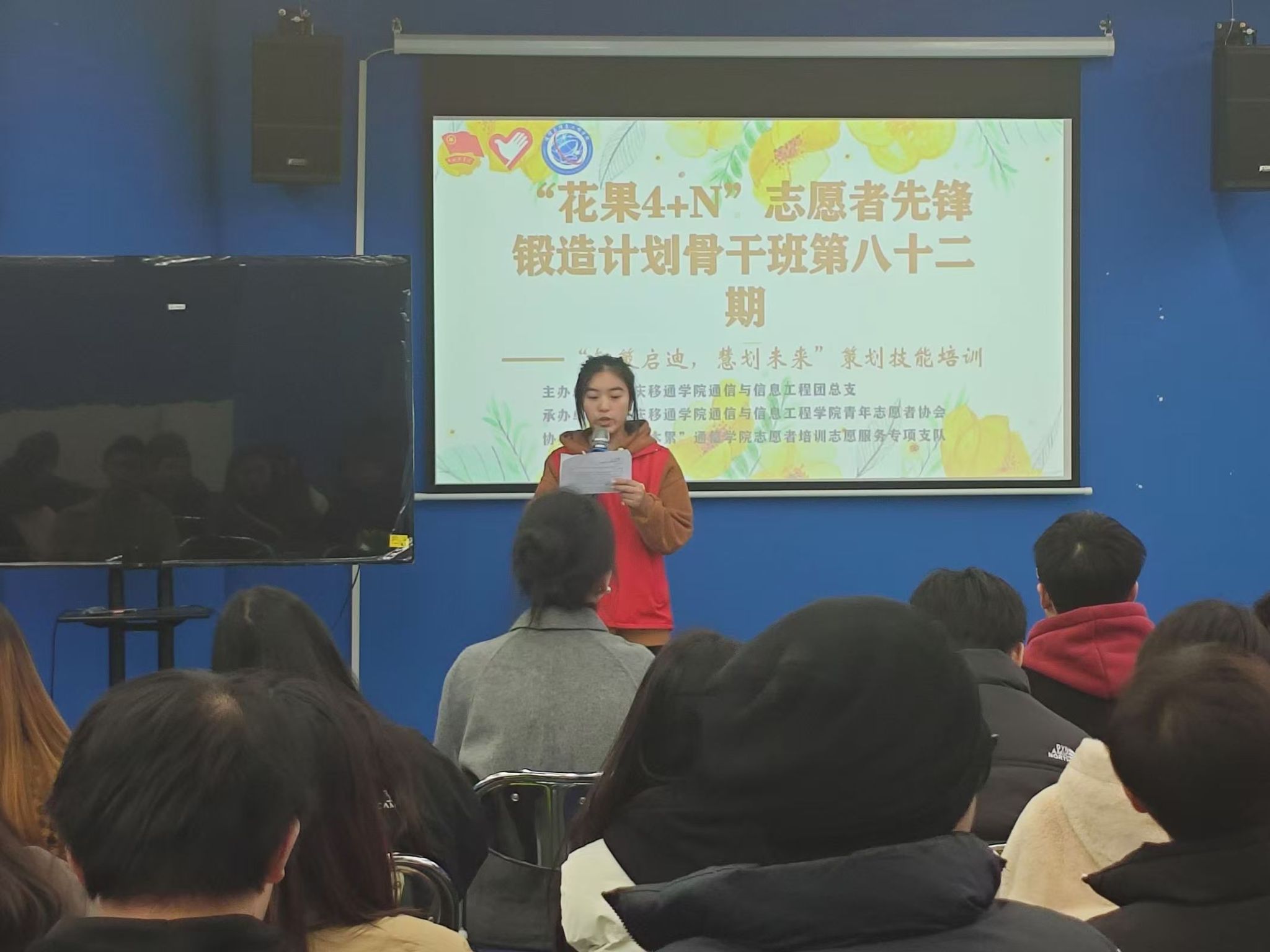 为提升大学生志愿者开展志愿活动的策划能力和团队协作水平,确保志愿活动能够更加顺利和高效地进行,特此举办本次策划培训活动。2024年11月20日下午13:00到14:00,通信与信息工程学院青年志愿者协会与“伐木累”通信学院志愿者培训志愿服务专项支队共同举办的“智策启迪·慧划未来”策划技能培训会于天空书院・揽江厅师生交流室顺利开展。此次活动由花果培训骨干班全体成员参与,共计50余人。