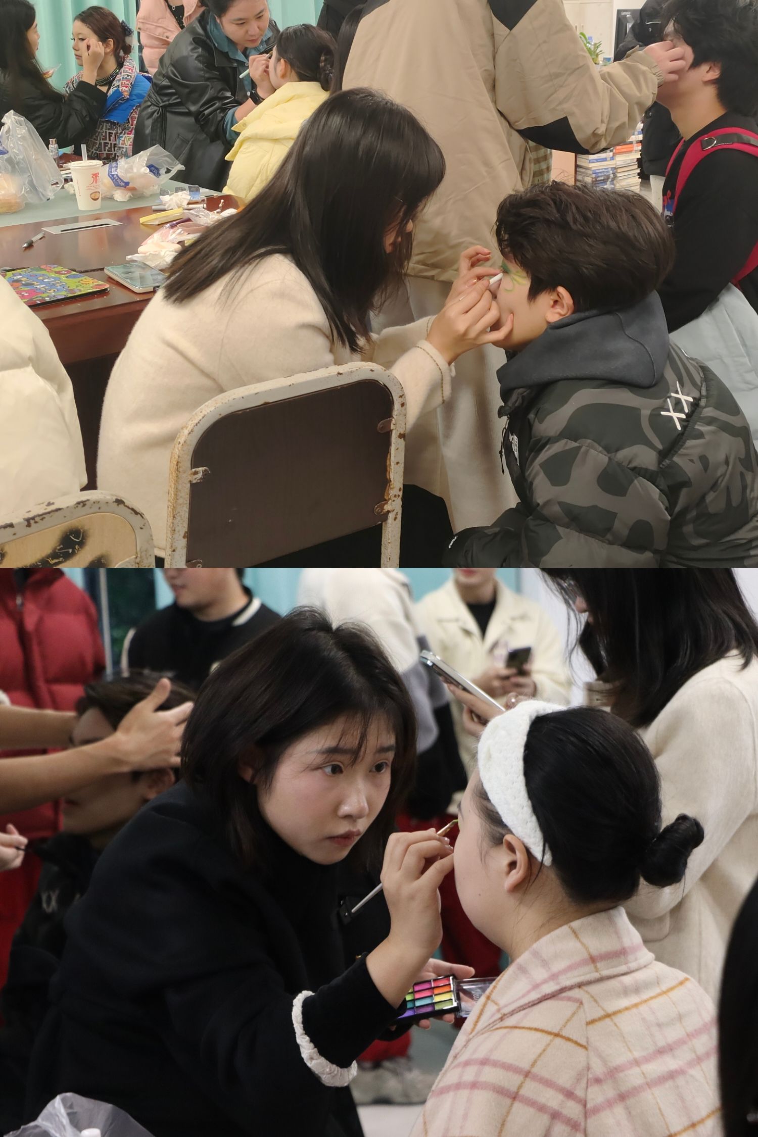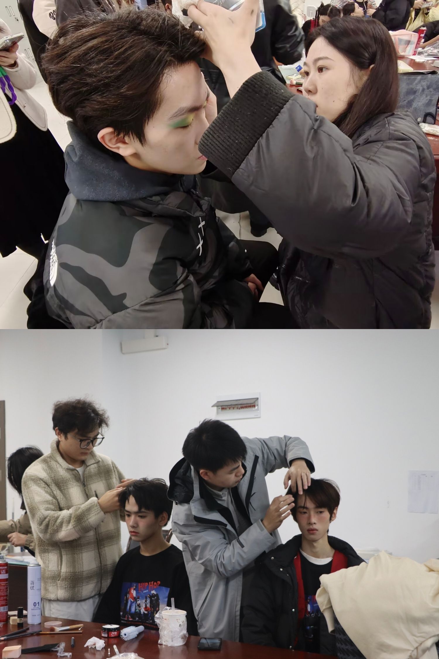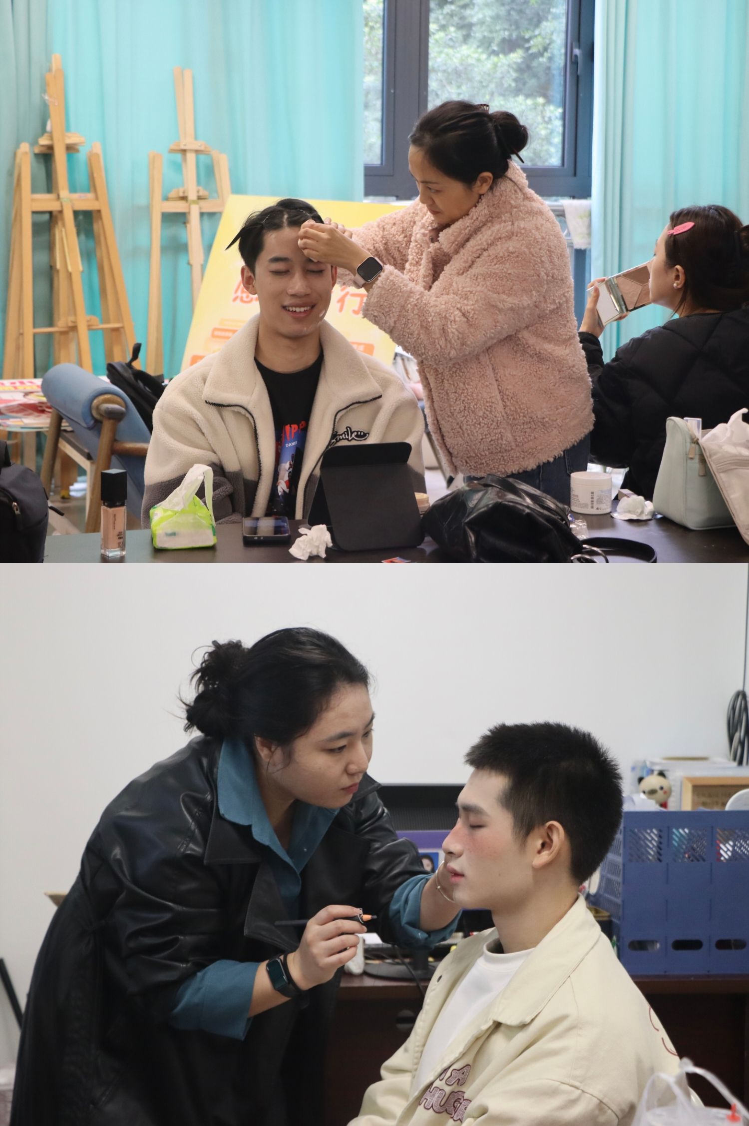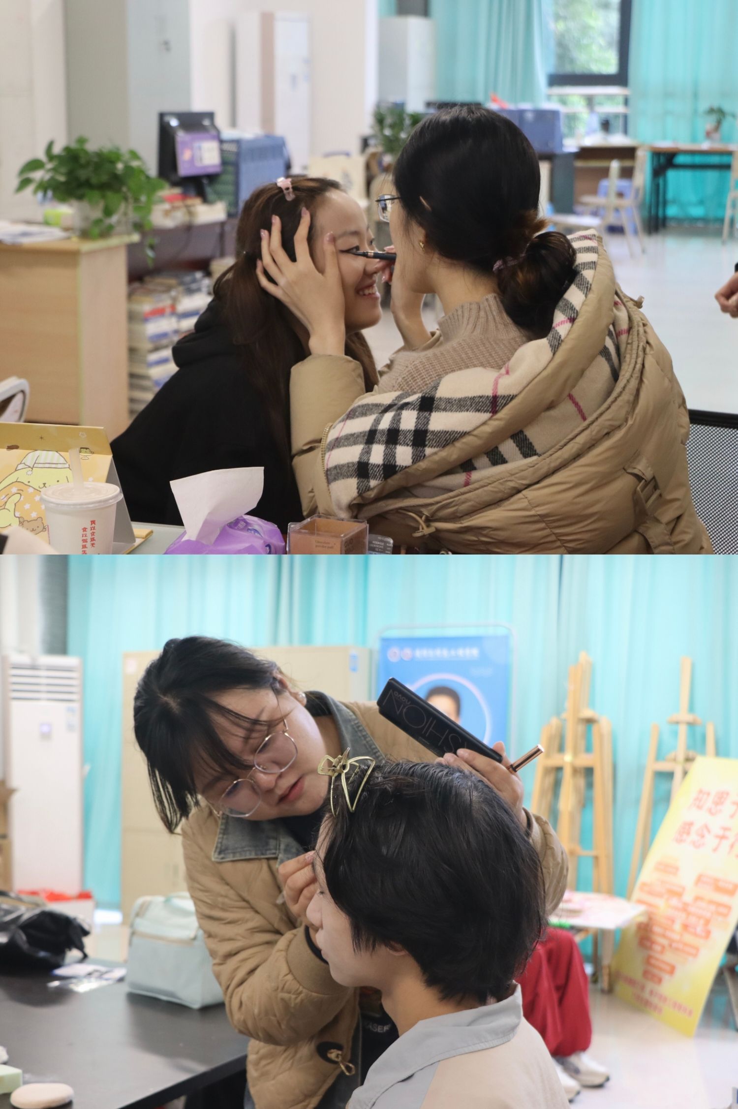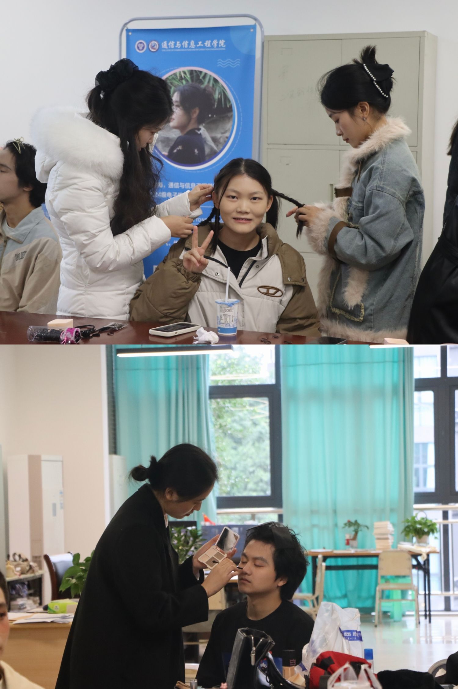 上午十点,通信工程学院辅导员贾雪梅、金子心、段沛言、吕海军、梁杰超、杨文静、余洋、陈颖、黄真、刘国庆、李文静、孙怡老师们历时5小时给参赛队员们画出精致的妆容,寄希望予队员们身披战袍,心携壮志,如凤凰涅槃,静待一飞冲天;剑指苍穹,意守丹田,以舞蹈之姿,誓夺璀璨星辰以示通信学子风采!