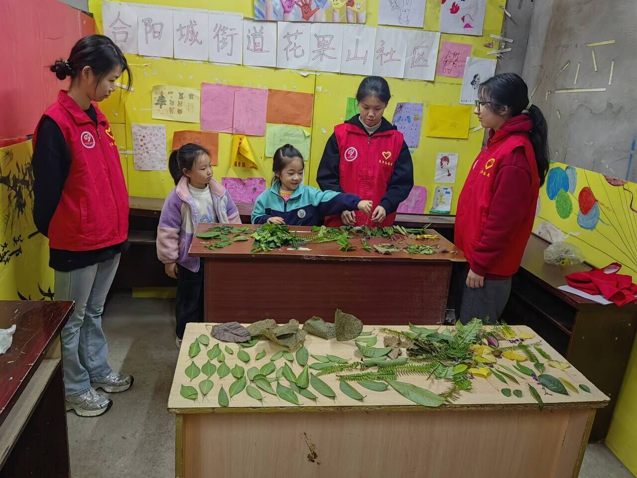五彩斑斓的树叶是大自然的杰作,每一片树叶都带着大自然的灵气,树叶在孩子们的手中也能焕发出多彩的姿态,创作出一幅幅美妙的作品。为了让孩子们在秋季之后冬季来临之时感受美、表现美、创造美,提高他们的动手能力。我们特制定本次“树叶奇迹,约“绘”冬季”志愿服务活动,旨在从贴画中提高孩子们的艺术修养。2024年11月30日下午,通信与信息工程学院“太阳花亲情驿站"关爱双职工子女志愿服务专项支队来到重庆市合川区合阳街道东邦花果山小区开展了“树叶奇迹,约“绘”冬季”志愿服务活动。