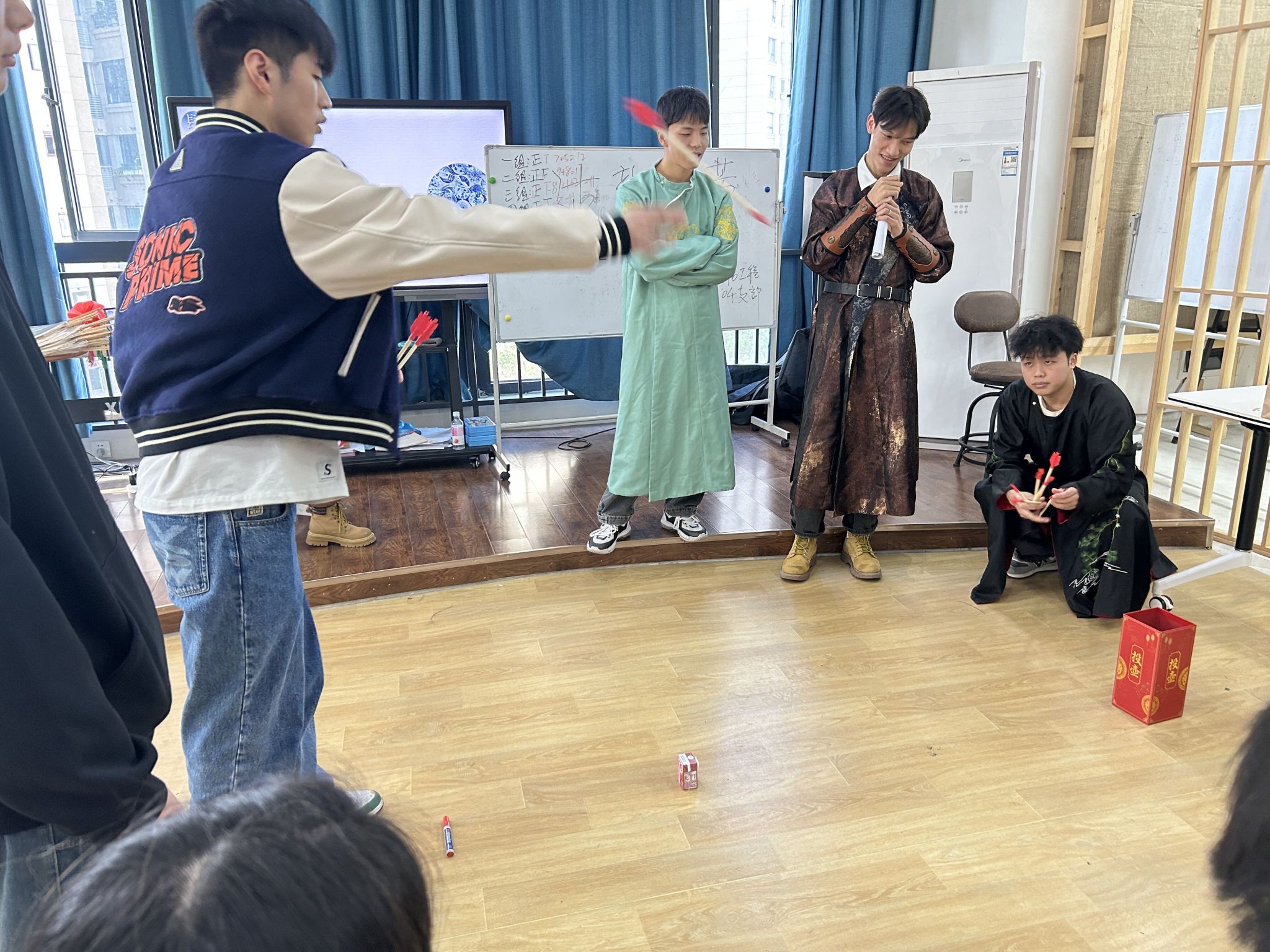 投壶活动现场,同学们分组对抗。投掷时,大家神情专注,箭矢精准飞向壶中,命中便欢呼。此活动重现古代竞技精彩,增进了同学间的友谊,还锻炼了大家的协调性与专注力。