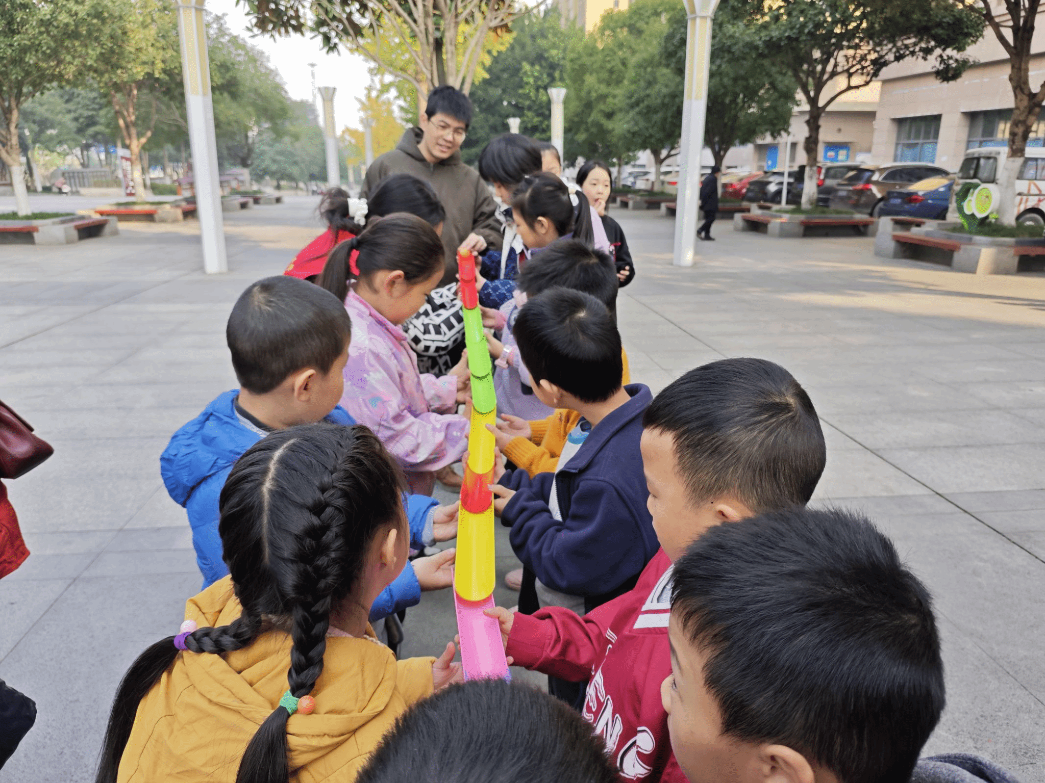 为了让小朋友们释放身心,老师带领小朋友们来到室外,开启了令人期待的游戏环节——搭桥滚球和翻纸牌。老师先是用通俗易懂的话语给小朋友们讲解了游戏规则,紧接着,组织小朋友们按照年龄大小排成两列,一切准备就绪后,有序地开展游戏。同时着重强调在游戏过程中,小朋友们一定要具备强烈的团队意识以及集体荣誉感,并且不忘温馨提醒大家注意自身安全。在老师和志愿者们有条不紊的带领下,小朋友们很快便全身心地投入到游戏当中,他们在游戏过程中尽情欢笑,收获了满满的快乐和喜悦。
