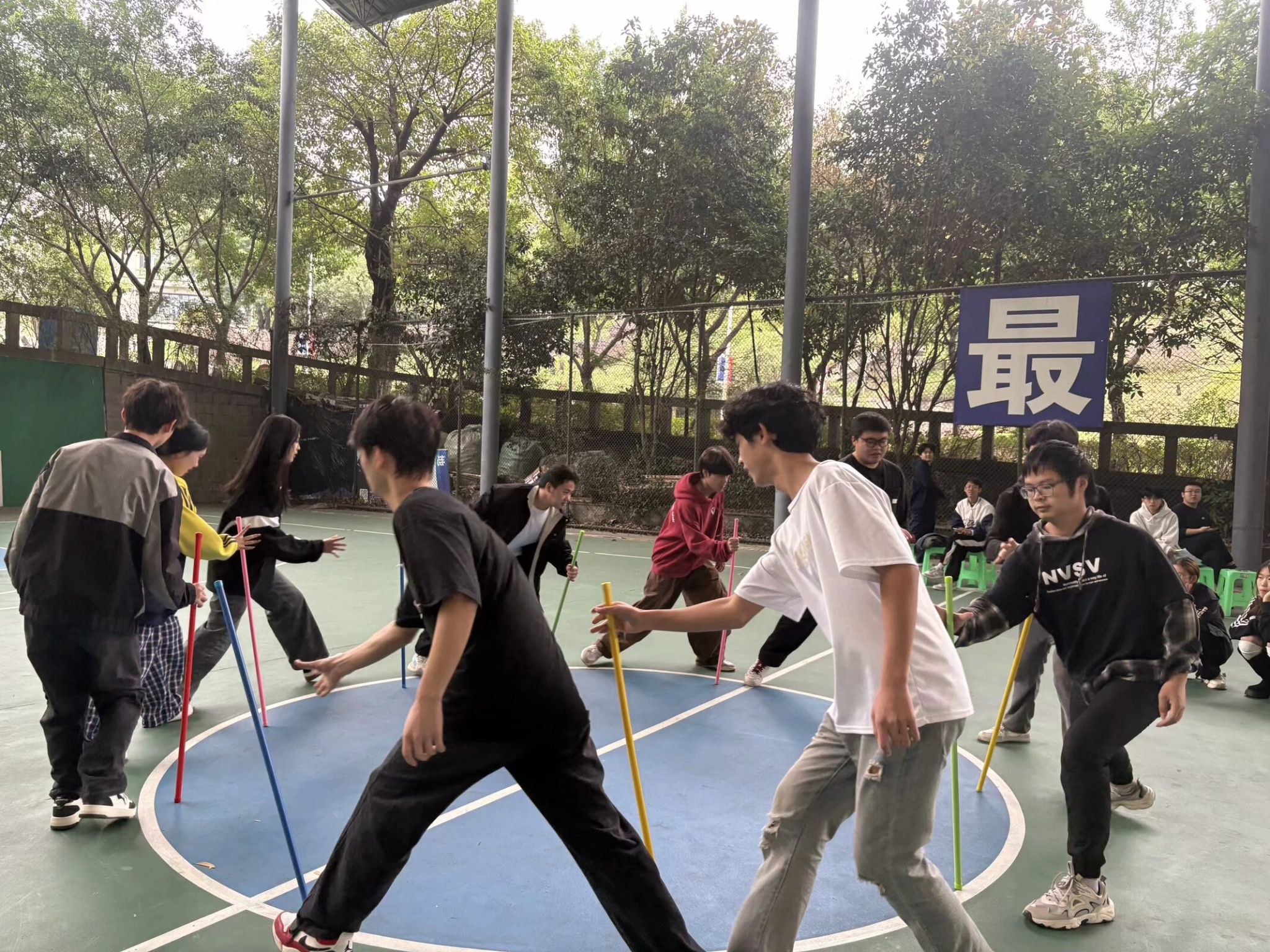 在最后这场游戏中,同学们需要围成一个大圈,每人握住一根塑料杆。随着活动开始,大家迅速移动,确保手中的杆子不倒,同时去扶住前面一个人松开的杆子。整个团队默契配合,顺利完成了一次次的循环。最终,压祥拉队也再次取得胜利。