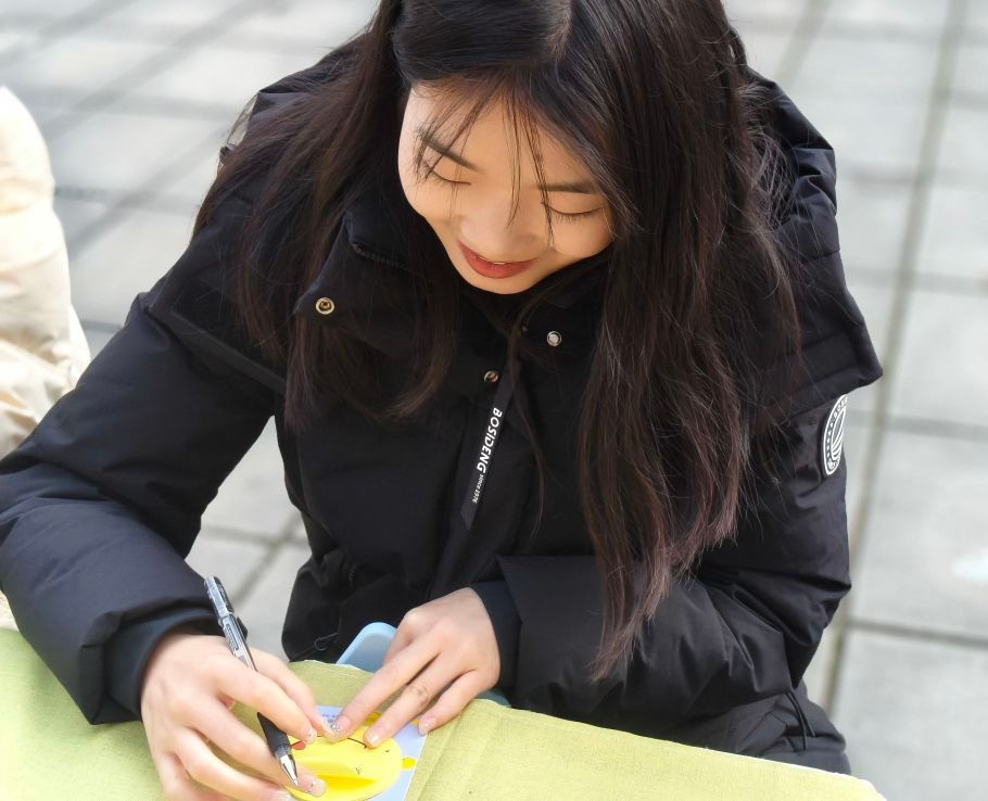 活动的终章——“笑影暖冬集”,参与者们在摊位五领取圆形卡纸,手中的黑色马克笔仿佛变成了描绘心灵画卷的神笔,精心绘制心中的笑脸。随后,他们勇敢地邀请陌生人一同在摄影处用笑脸卡纸遮挡脸部,随着快门的清脆声响,留下了冬日里最温暖的瞬间,也为小卡纸背面画上了一个圆满的句号。