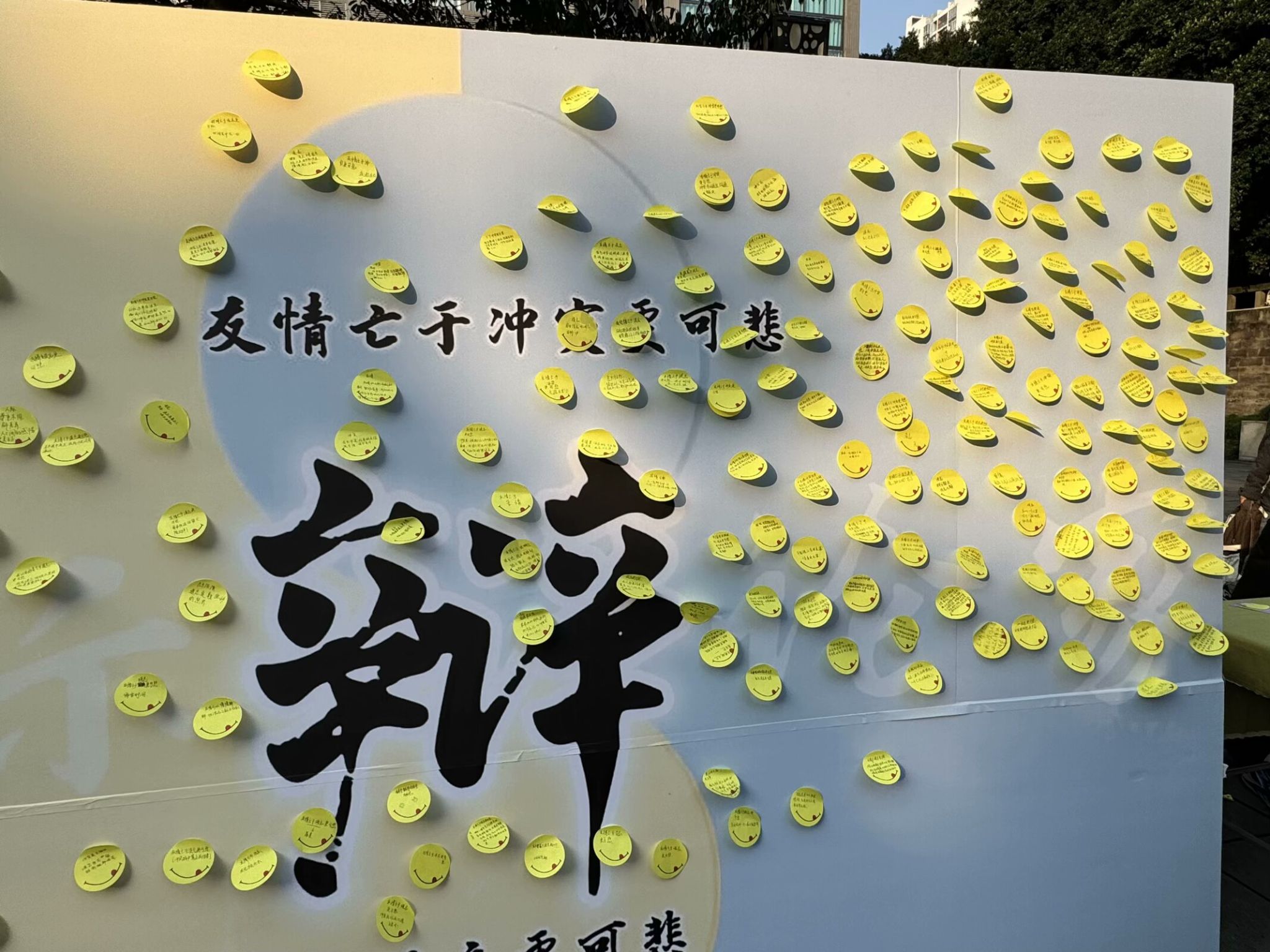 “人际辩论家”活动处,志愿者引导同学在摊位二领取微笑便利贴,同学们眼神中闪烁着思考的光芒,针对 KT 板上的人际关系辩题果断选择正反方,随后将自己内心的见解写于便利贴上,粘贴在辩题下方,再完成观点的精彩表达与思想的深度交流。