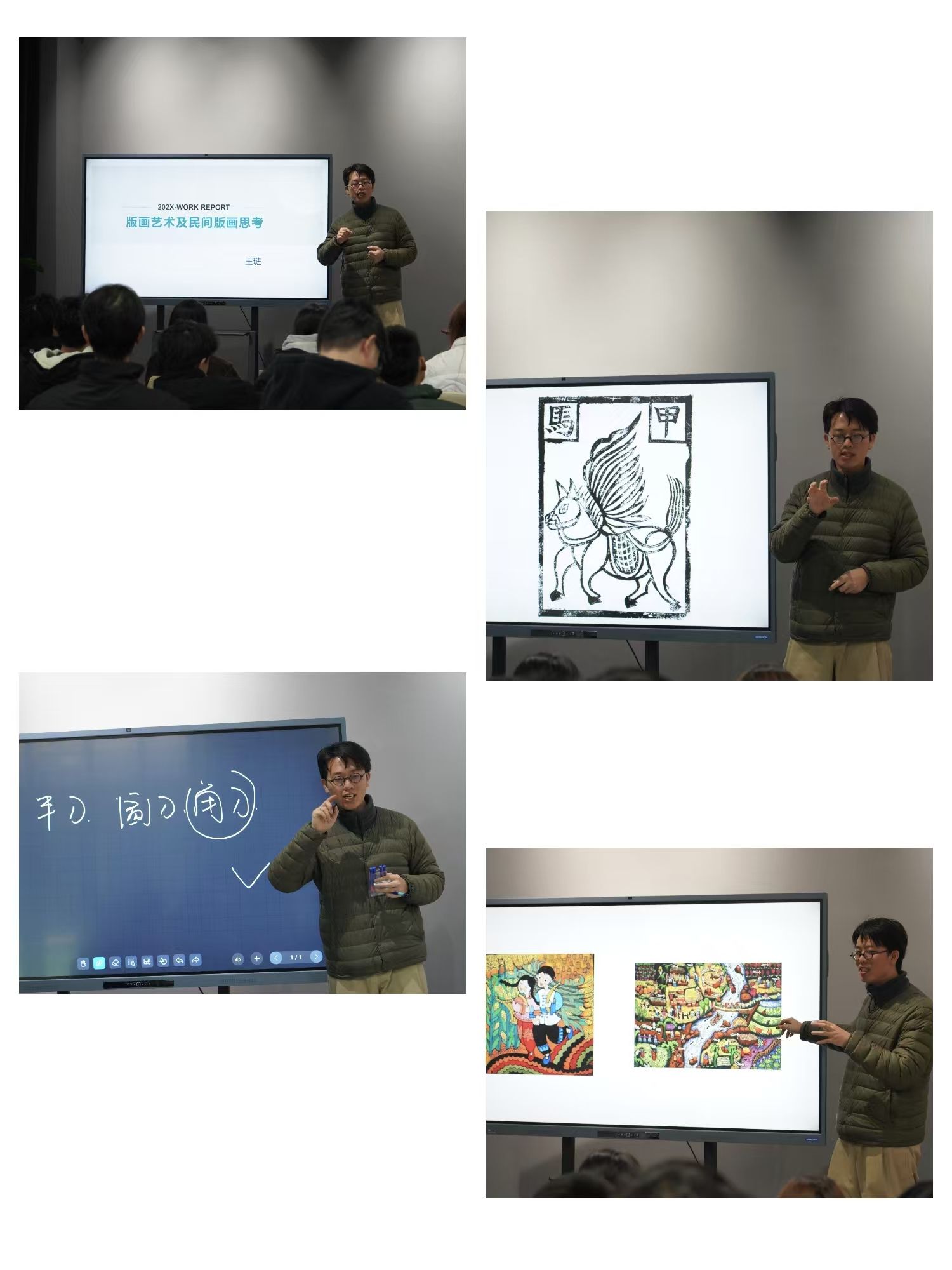 随后,王琎老师为同学们进行版画知识讲解。从版画的起源到发展历程,从不同流派的风格特点到经典作品的赏析,王老师的讲述生动形象、深入浅出,使大家对版画艺术有了更为全面且深刻的认识与理解,为后续的创作环节奠定了坚实的理论基础。