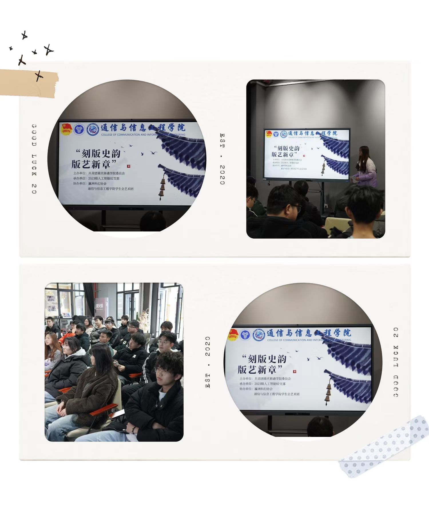 为挖掘传统艺术的深厚底蕴,传递版画艺术的独特魅力,通信与信息工程学院2023级人工智能02支部携瀛溪科幻社以及通信与信息工程学院学生会艺术团,于2024年12月11日14时在瀛溪书院弦宇宙空间开展了“刻印史韵,版艺新章”为主题的完超活动。