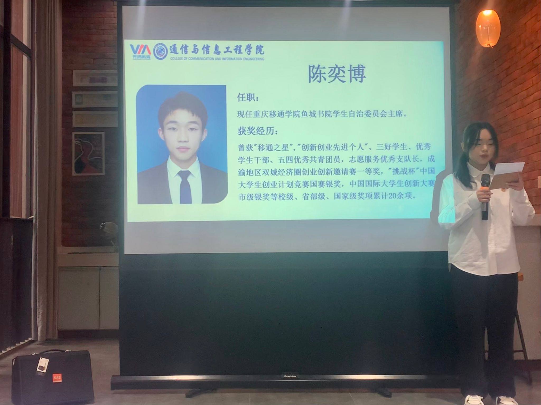 陈奕博,现任重庆移通学院鱼城书院学生自治委员会主席、人工智能20班团支书。曾任通信与信息工程学院“幸福来敲门”志愿服务专项支队队长,创意写作学院志愿团部长。曾获“移通之星”,“创新创业先进个人”、三好学生、优秀学生干部、五四优秀共青团员,志愿服务优秀支队长,成渝地区双城经济圈创业创新邀请赛一等奖,“挑战杯”中国大学生创业计划竞赛国赛银奖,中国国际大学生创新大赛市级银奖等校级、省部级、国家级奖项累计 20 余项。