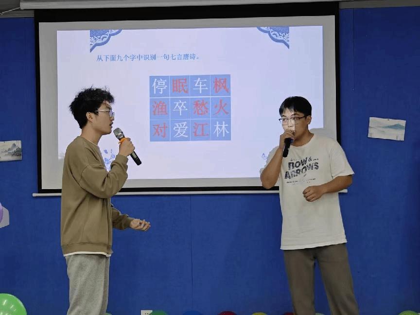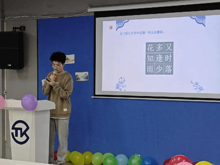 随后是连字成诗环节,支部成员们需要从九宫格所给出的一些相关或不相关的字中,选出正确的字,组成一句完整的五言唐诗,活动一开始,有的成员就举手回答相应的诗句,回答错误的成员将会展示才艺。通过参与连字成诗游戏,支部成员们在轻松愉快的氛围中接触到大量的诗词,进一步丰富了诗词知识,提升了文化素养和审美水平。