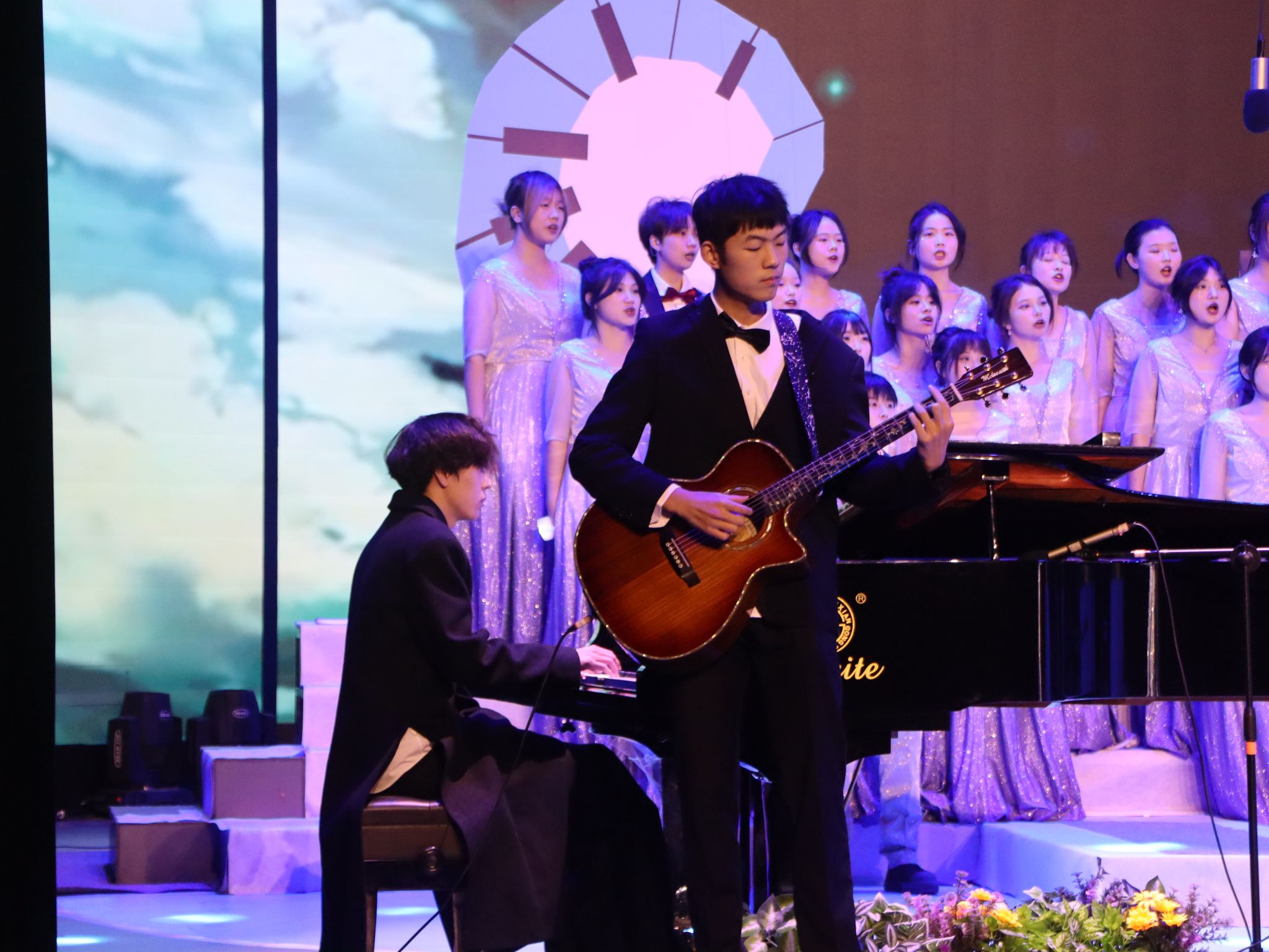 顺利演出的背后,离不开艺术教育中心声乐教师周振宇老师和钢琴教师陈培灵老师的悉心指导;各声部长逐个纠正成员发音;工作人员提供充足后勤保障;通信与信息工程学院艺术板块指导老师杨文静老师全程温情陪伴;通信与信息工程学院各辅导员也从发声技巧、和声协调、情感表达与舞台表现等方面给出专业意见,为合唱提供专业点拨,给予参赛选手莫大底气和勇气。