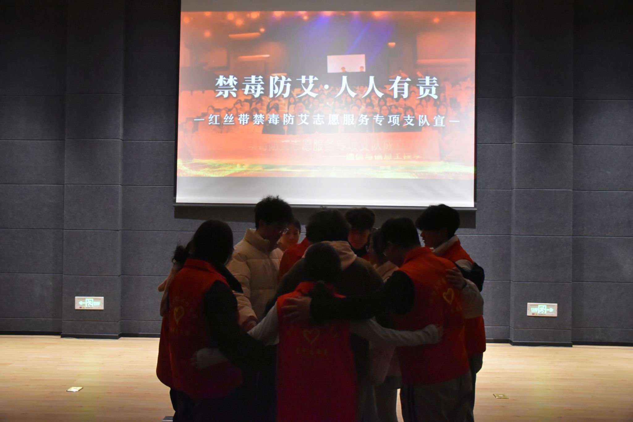 随后,“红丝带”禁毒防艾志愿服务专项支队指导老师段沛言进行了发言,她向同学们介绍了支队成立的意义,说道:“我们成立‘红丝带’禁毒防艾志愿服务专项支队,就是希望能汇聚大家的力量,在校园中,在社会的各个角落,筑起一道坚固的防线。”同时也向禁毒防艾事业表达了殷切希望:“我们还要关注那些特殊群体,比如那些可能因为家庭环境或者心理问题而更容易陷入毒品和艾滋病风险的同学,给予他们更多的关爱与帮助。我相信,只要我们齐心协力,红丝带’就一定能够飘扬在校园的每一个角落,成为禁毒防艾的鲜明旗帜。同学们,让我们携手共进,用我们的行动去唤醒更多人的意识,用我们的努力去改变社会的认知,为创造一个无毒无艾的美好明天而不懈奋斗!”