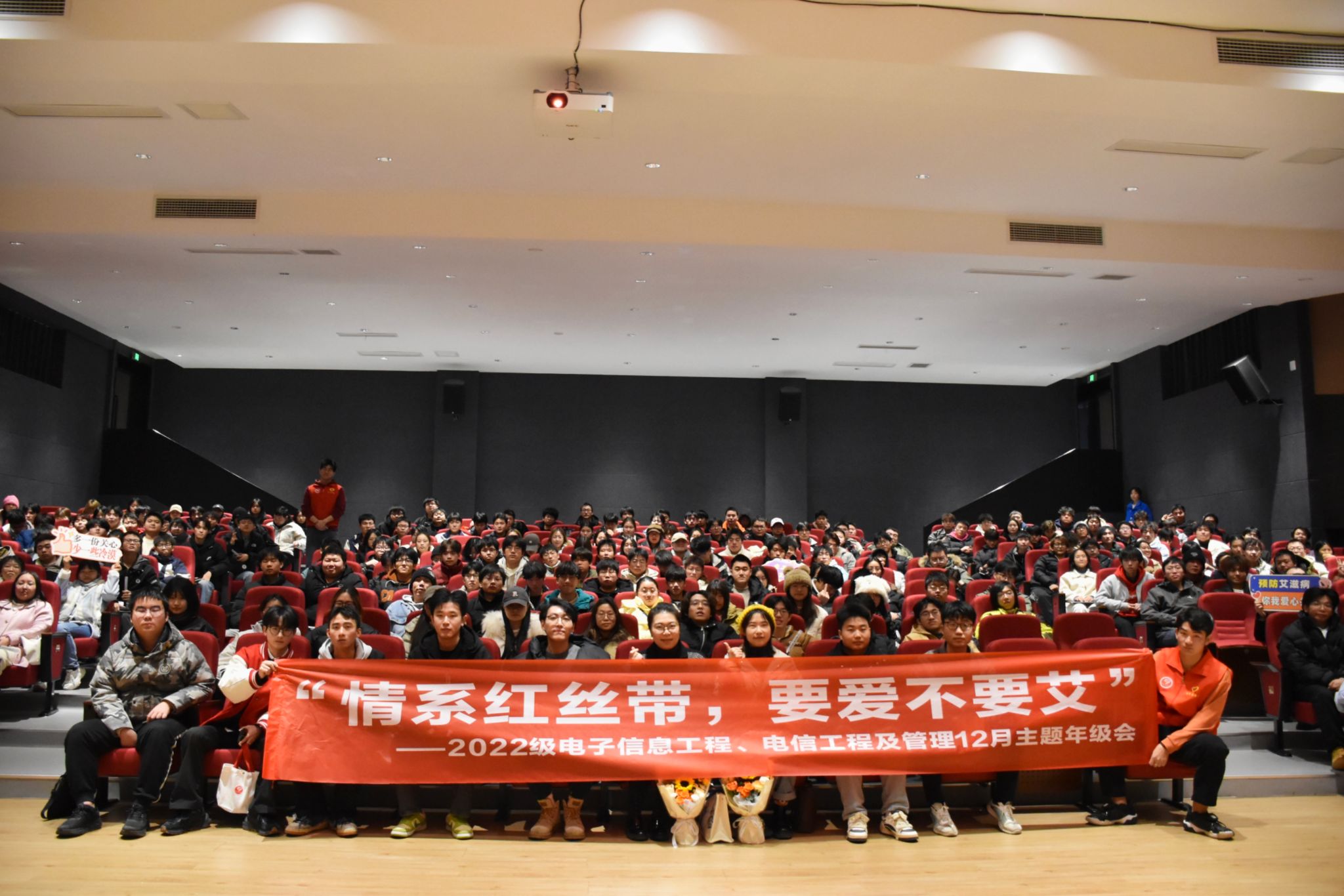2024 年 12 月 20 日,“红丝带”禁毒防艾志愿服务专项支队协同通信与信息工程学院2022级电信工程及管理,电子信息工程年级于六度空间105℃学术报告厅召开了一场意义非凡的禁毒防艾年级会。会议融入禁毒防艾重要宣讲内容,为年级发展注入新动力,为同学们的成长明晰方向。出席本次会议的有合川区疾控中心黄爽老师,“红丝带”禁毒防艾志愿服务专项支队指导老师段沛言,通信与信息工程学院2022级电工、电管专业辅导员梁杰超以及通信与信息工程学院的同学们。