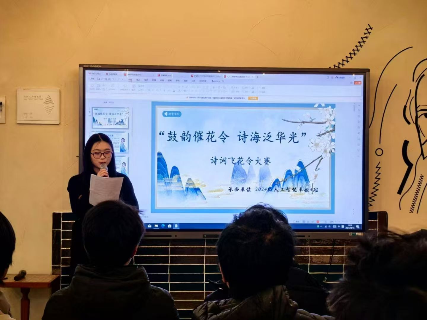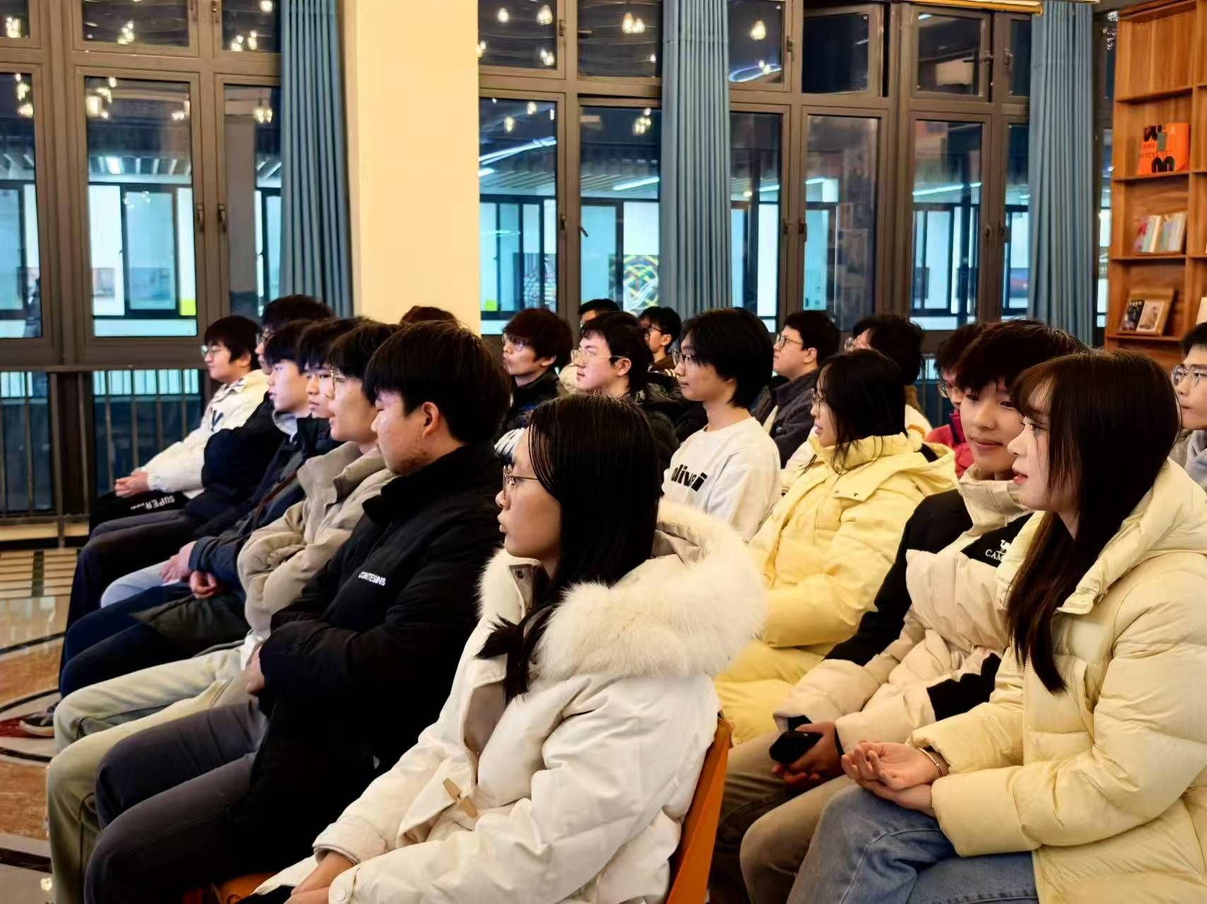2024年12月18日,天空书院506院思妥耶夫斯基书店内诗香四溢,一场别开生面的以“鼓韵催花令,诗海绽华光”为主题的诗词活动在此盛大举行。本次活动由重庆移通学院示范创建团主办,2024级人工智能04支部全体同学参与其中,共同沉浸在中华诗词的魅力海洋。