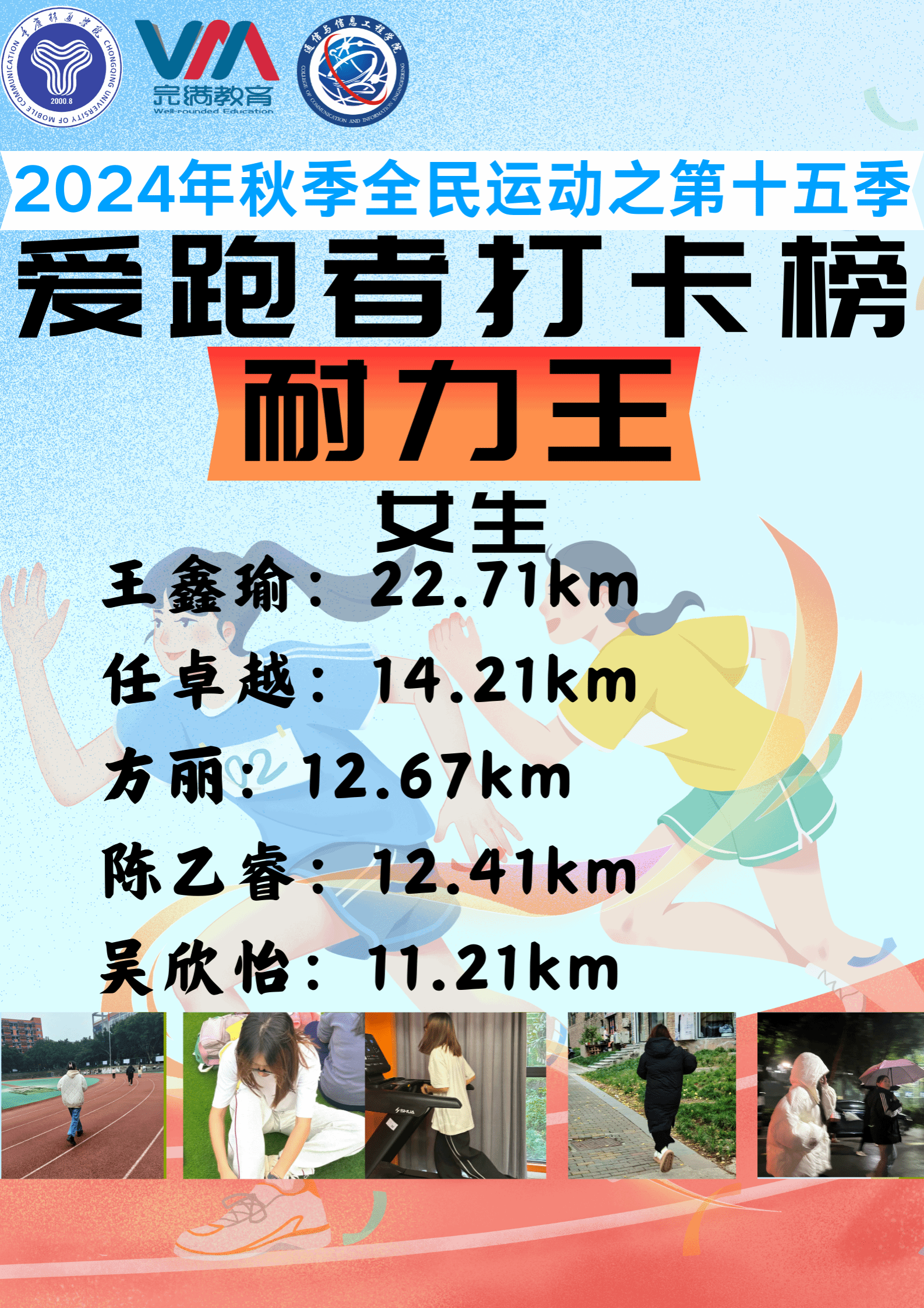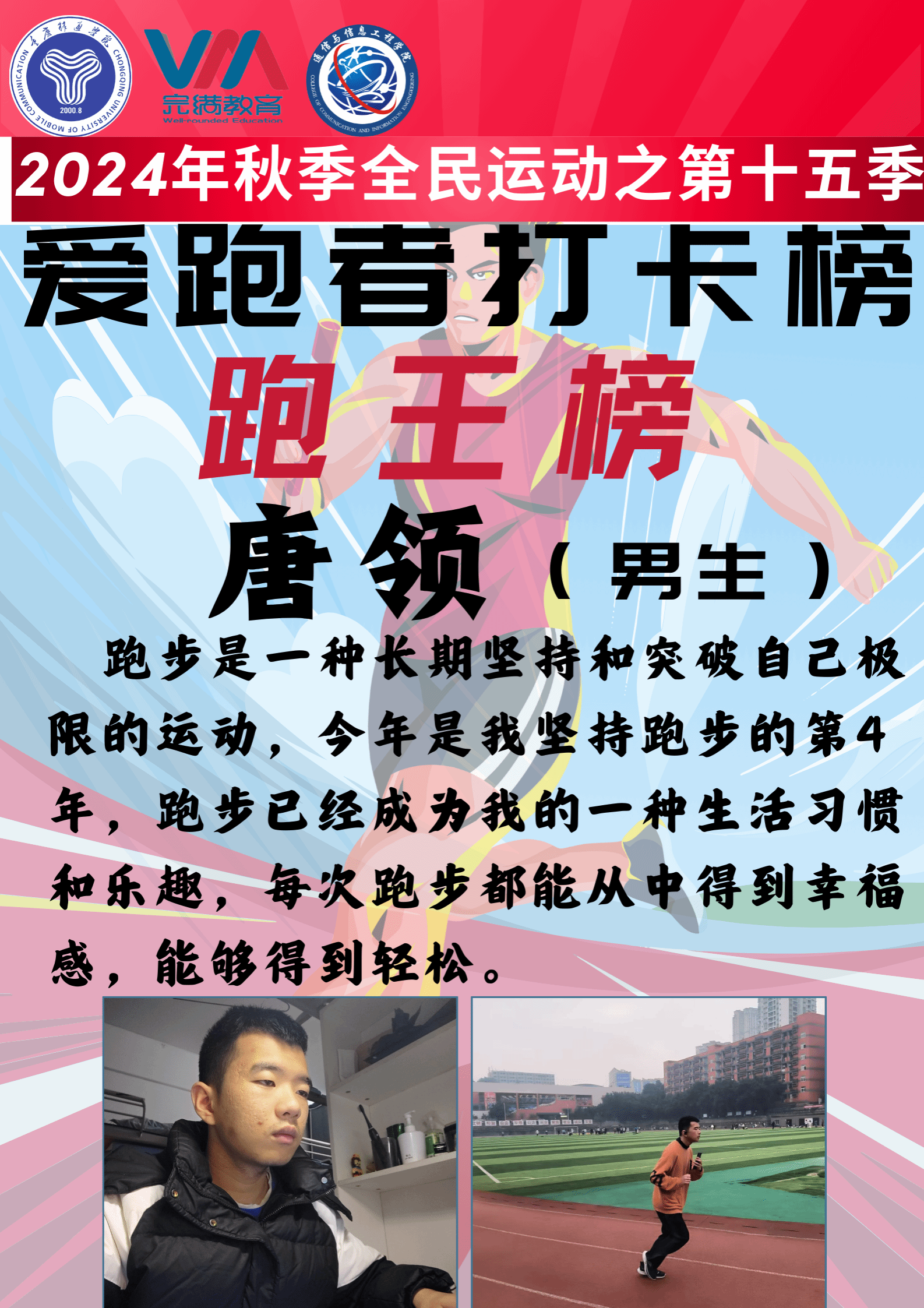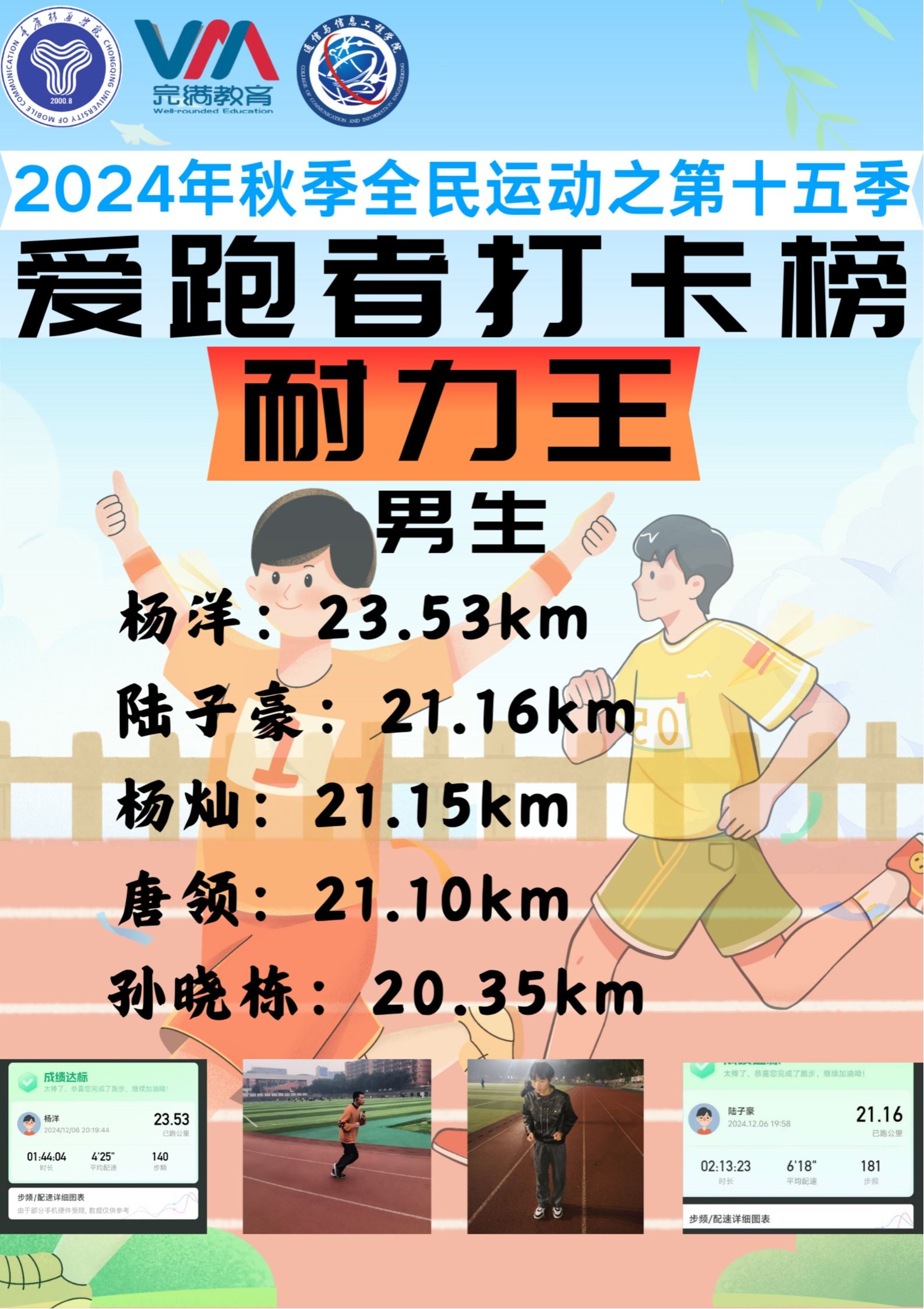 2024年12月22日,由重庆移通学院竞技体育中心主办、通信与信息工程学院承办的2024-2025学年全民运动计划之“奔跑逐梦,活力飞扬”第15季爱跑者打卡榜圆满结束。本次第15季爱跑者活动结合线上线下双模式开展,共开展18天,双校区共2052名同学参与,跑步里程累计55324公里。