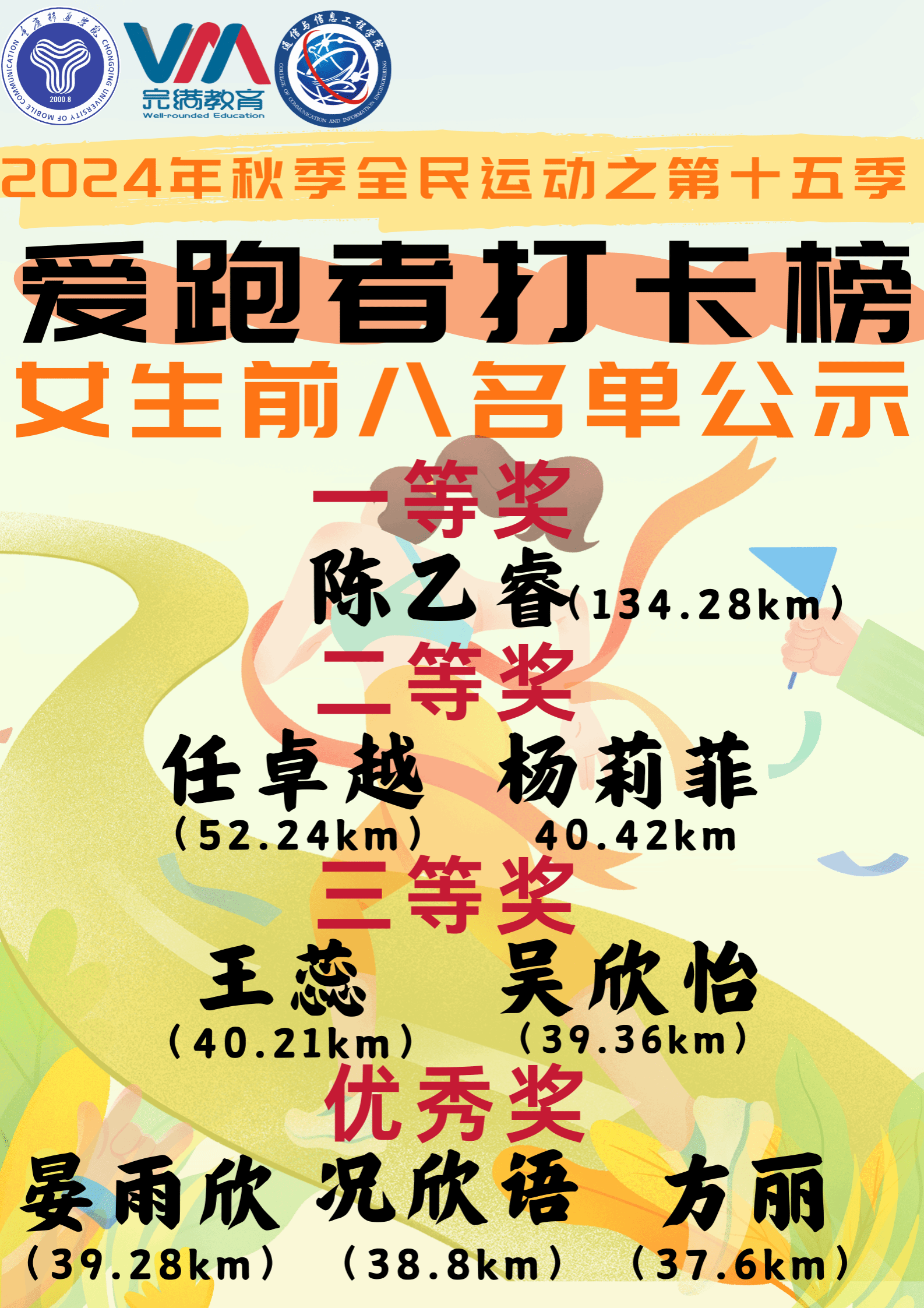 女生跑王(134.28km)来自通信与信息工程学院-2022级通信工程志向3班——陈乙睿,分享她的跑步经验说:“跑步是一场自我探索的冒险,不要一味地追求速度和里程而忽略了内心的感受。每一次跑步的强度和距离都应该依据当下的身体状态和心情去合理调整。如果一开始就过度逼迫自己,不仅可能让身体受伤,还会失去跑步带来的内心宁静和愉悦。”