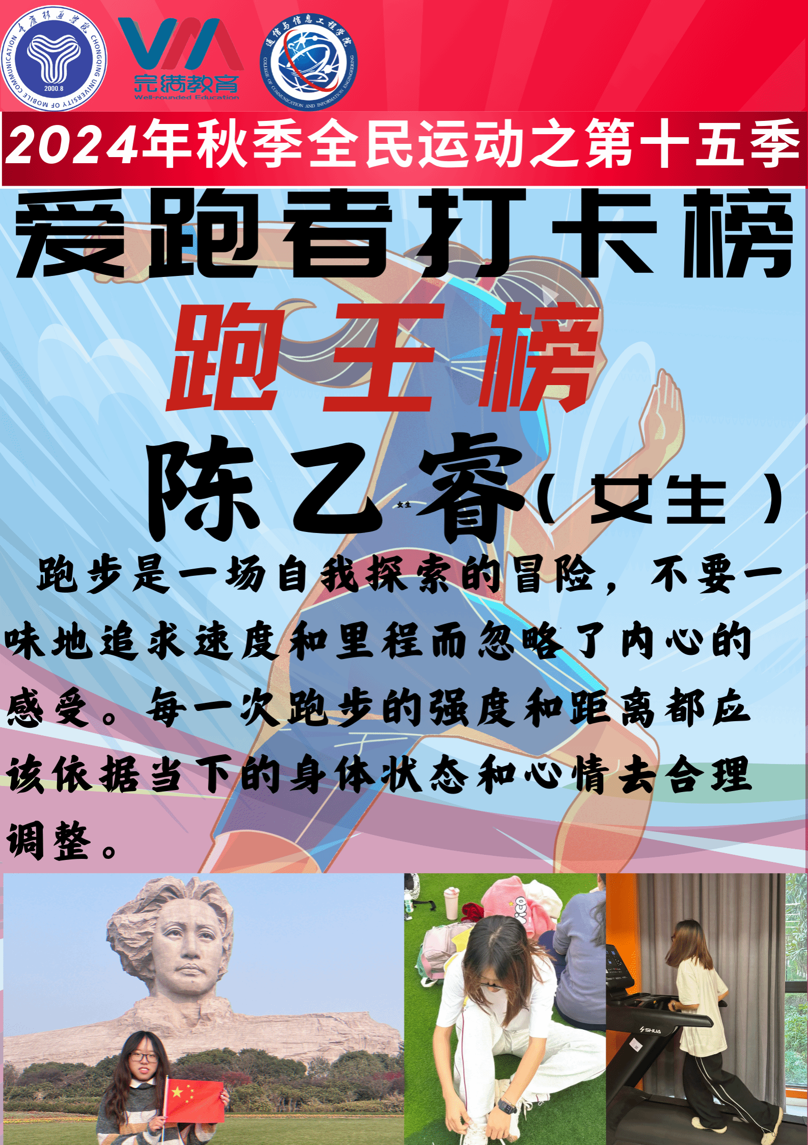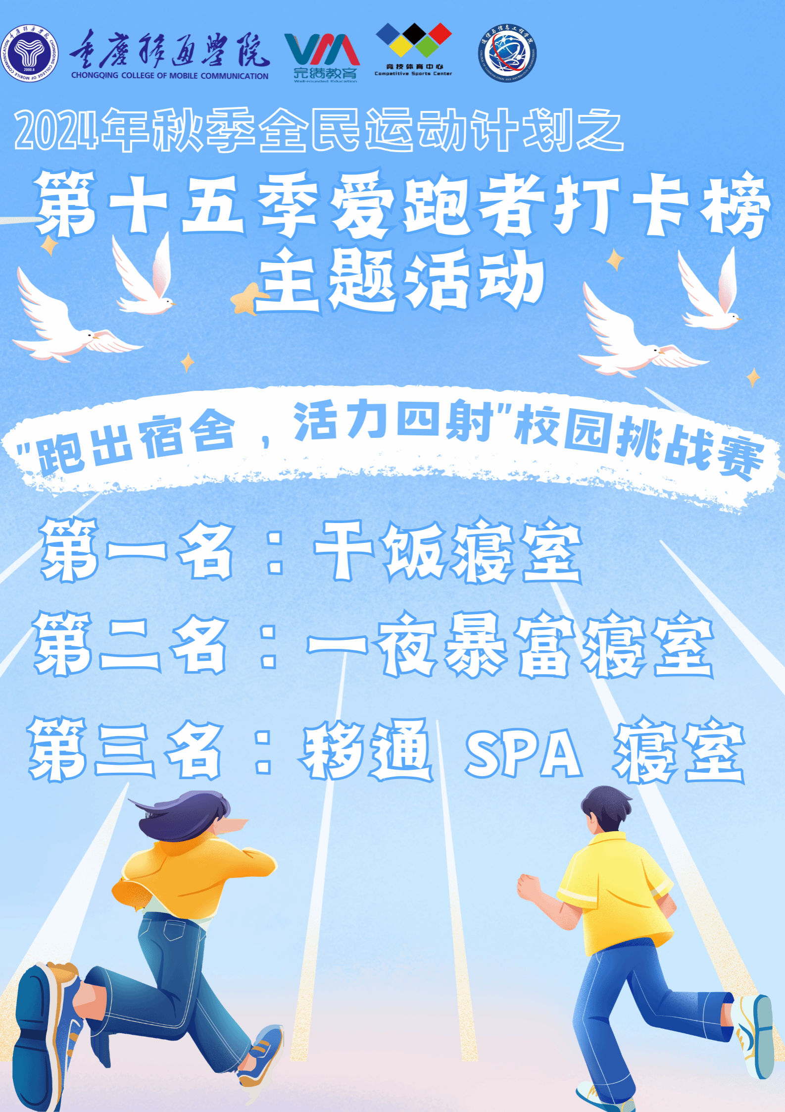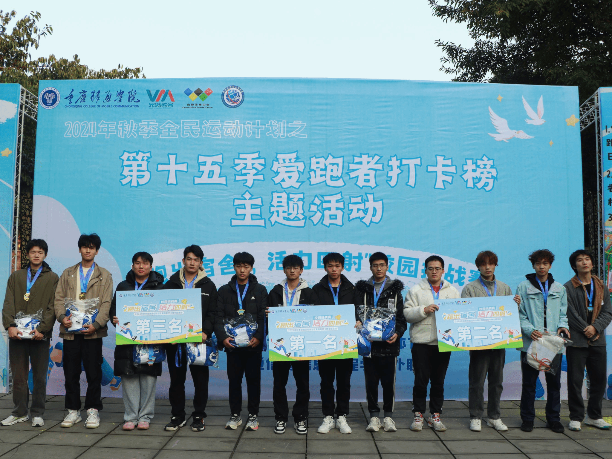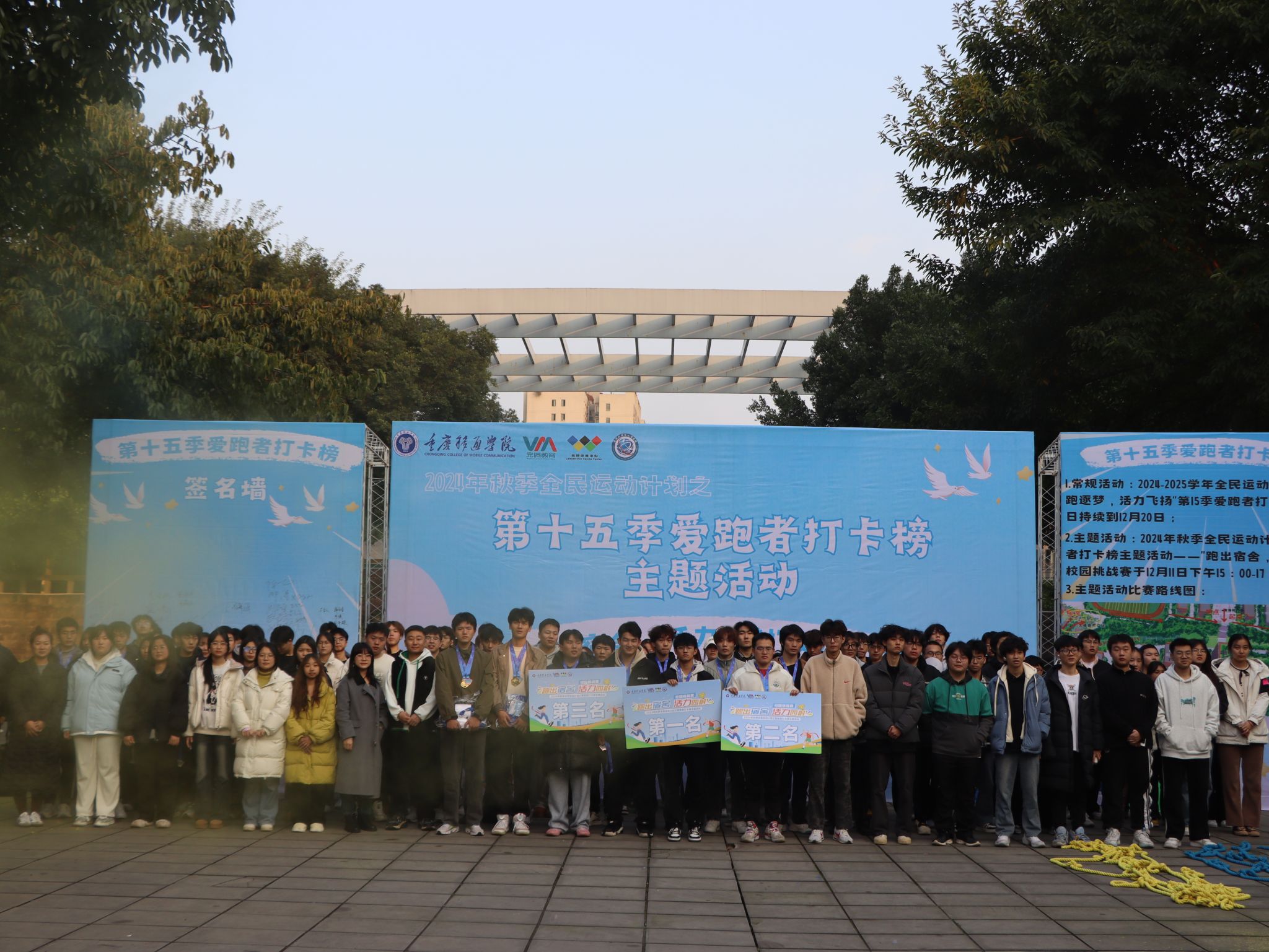 12月11日重庆移通学院(合川校区)第15季爱跑者打卡线下主题活动之“跑出宿舍,活力四射”校园挑战赛在南校区黄桷树广场圆满开展。通信与信息工程学院副院长熊斌老师、竞技体育中心体育活动部办公室主任岳振远老师、宿管中心副主任张旭老师、通信与信息工程学院团总支书记孙怡老师、学工办主任苟凡铖老师以及就业创业办公室主任李林燕老师等均莅临现场,并且为获得校园挑战赛的前三名的宿舍颁奖——第一名:干饭寝室,17 分 28 秒;第二名:一夜暴富寝室,18 分 07 秒;第三名:移通 SPA 寝室,18 分 28 秒 06
