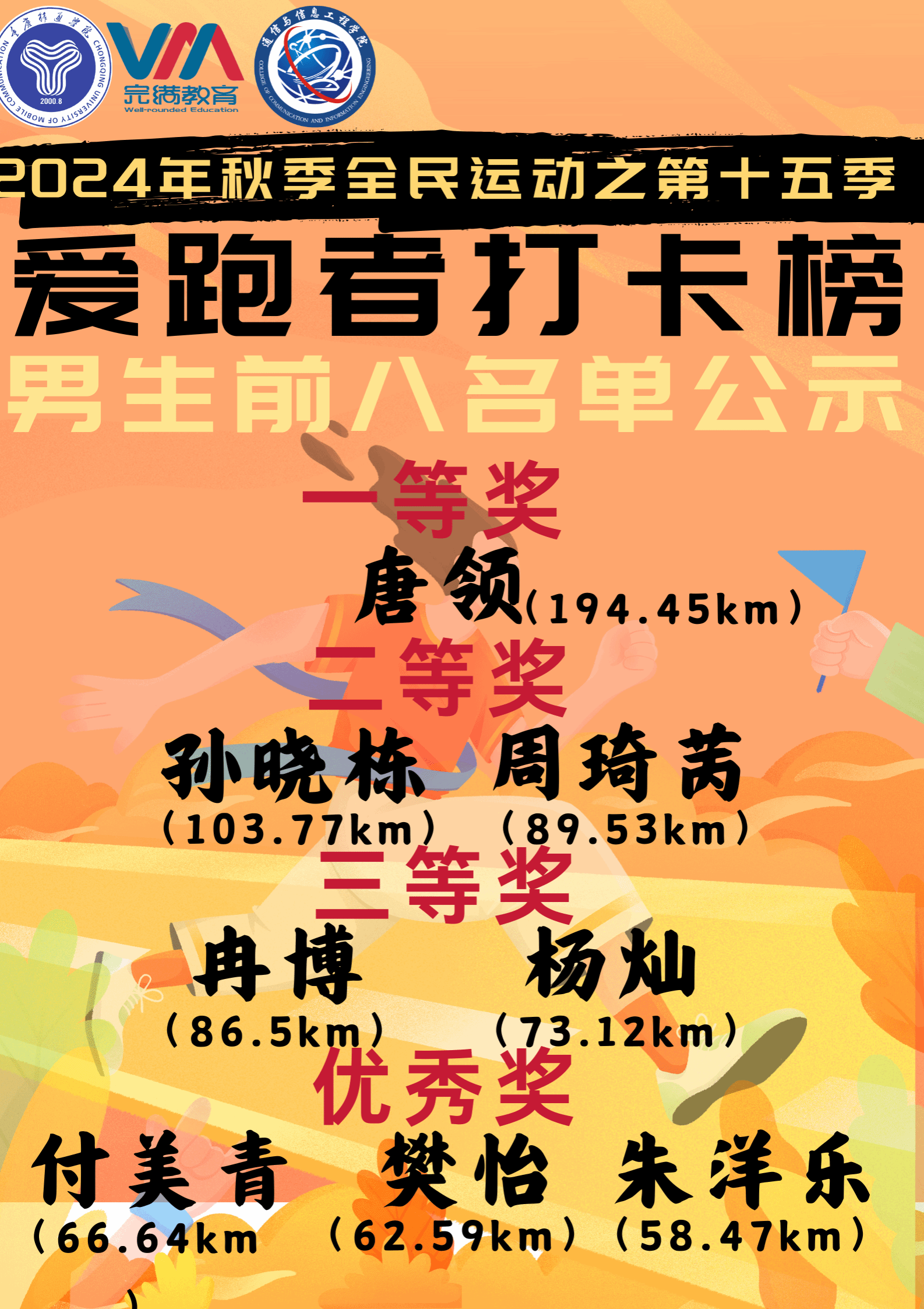 2024-2025学年“奔跑逐梦,活力飞扬”第15季爱跑者打卡榜辉煌落幕。然而,奔跑的脚步从不停歇,愿同学们始终保持阳光活力之姿、健康向上之态、竞技合作之精神、坚韧不拔之志。让我们共同期待,在全民运动计划第16季爱跑者打卡榜上再度绽放辉煌。