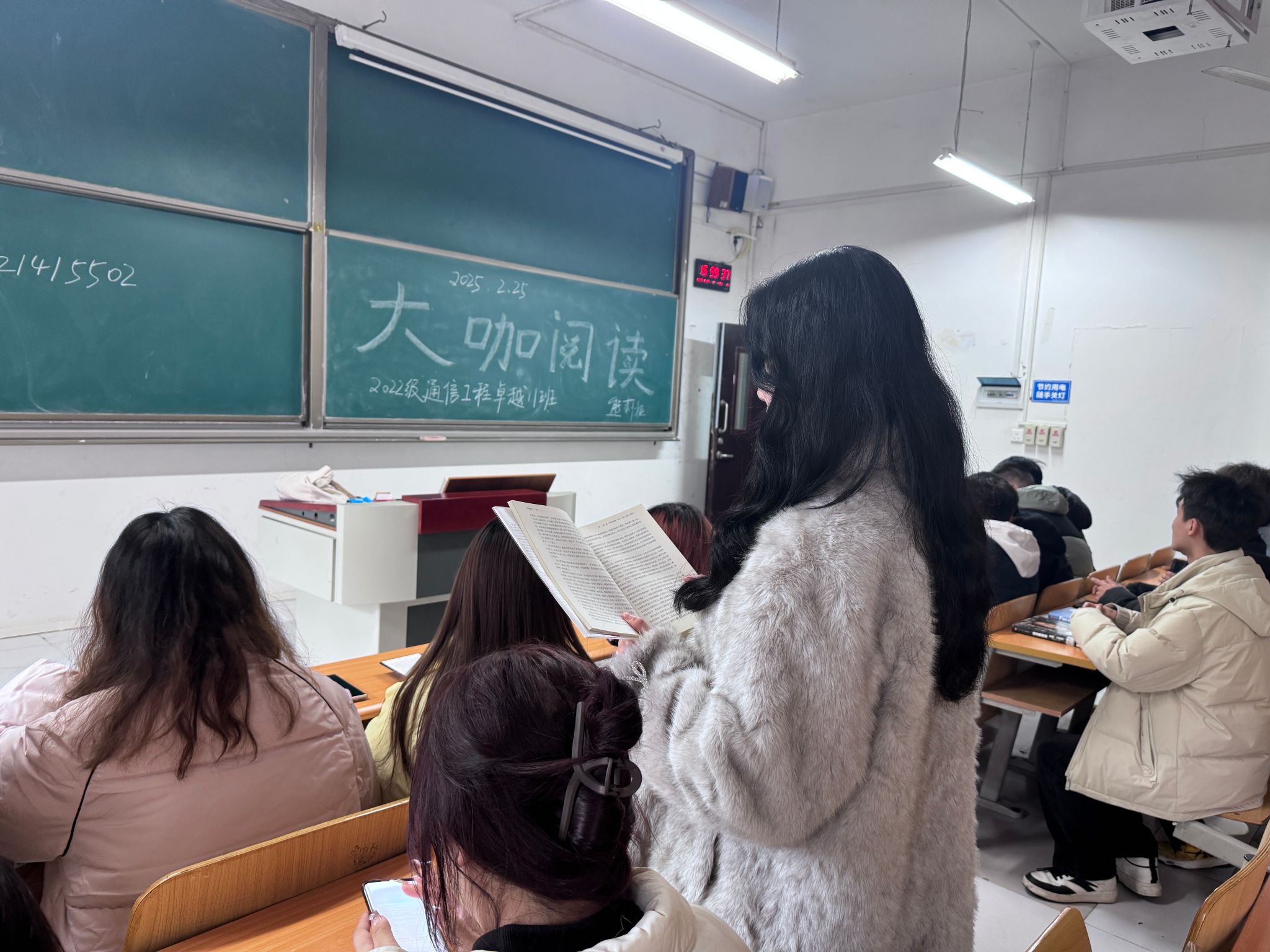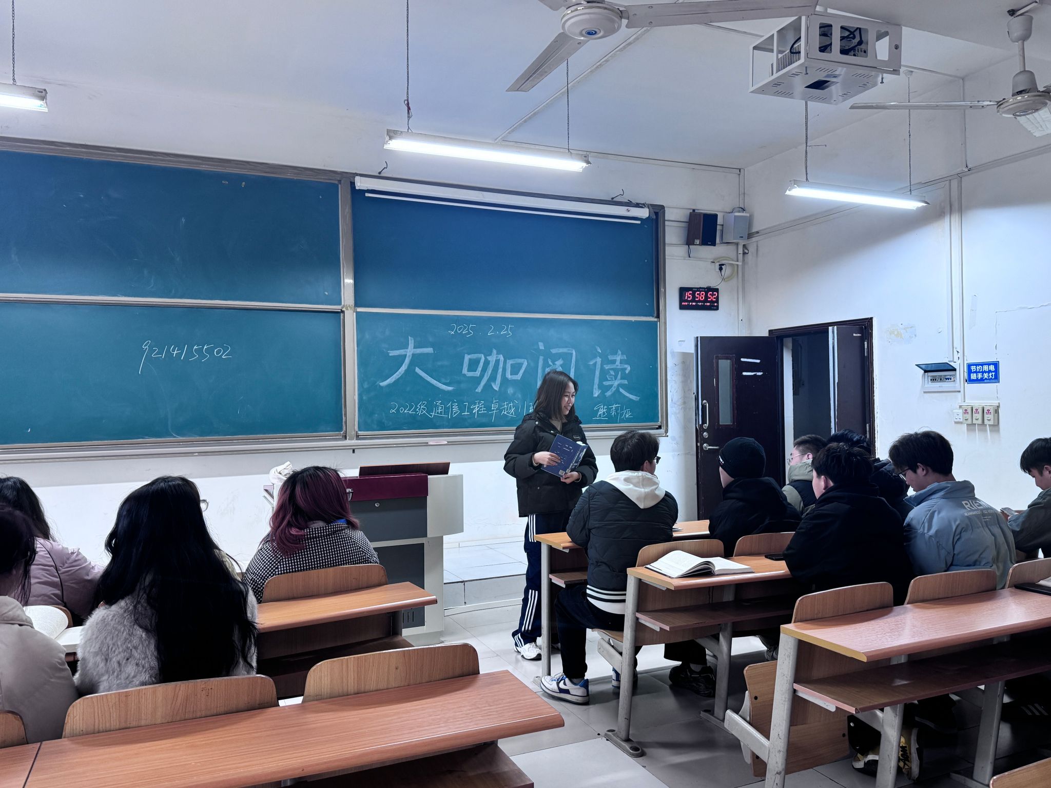 2025年1月3日下午,通信工程学院2022级通信工程卓越11班全体学生与学业导师熊莉娅于1204教室联合举办“大咖阅读·思行致远”主题活动。本次活动以学校“四位一体双院制”育人模式为指引,通过师生共读、思维碰撞的形式,探索专业教育与完满教育的深度融合,助力学生成长为“完整的人”。