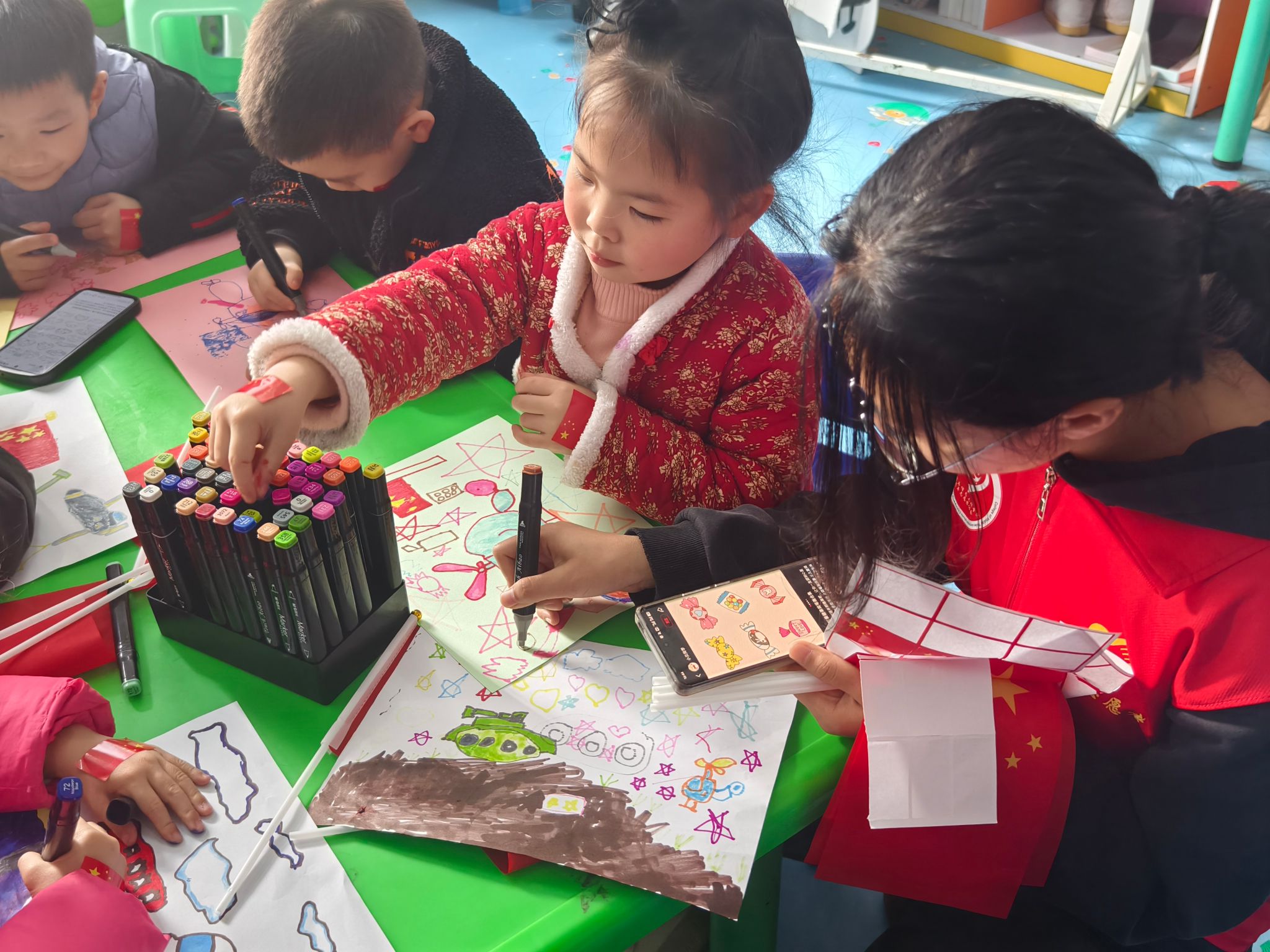 绘画结束后,小朋友踊跃地向志愿者分享着自己的画作,画国旗的小朋友高高举起自己的作品,眼中闪烁着光芒,激动地说道:“这是我们中国的国旗,它叫五星红旗!”画高铁的小朋友也不甘示弱,指着自己的画作兴奋地分享:“高铁跑得可快啦,能带着大家去好多地方!”志愿者们认真倾听,不时给予肯定与鼓励,现场欢声笑语不断。