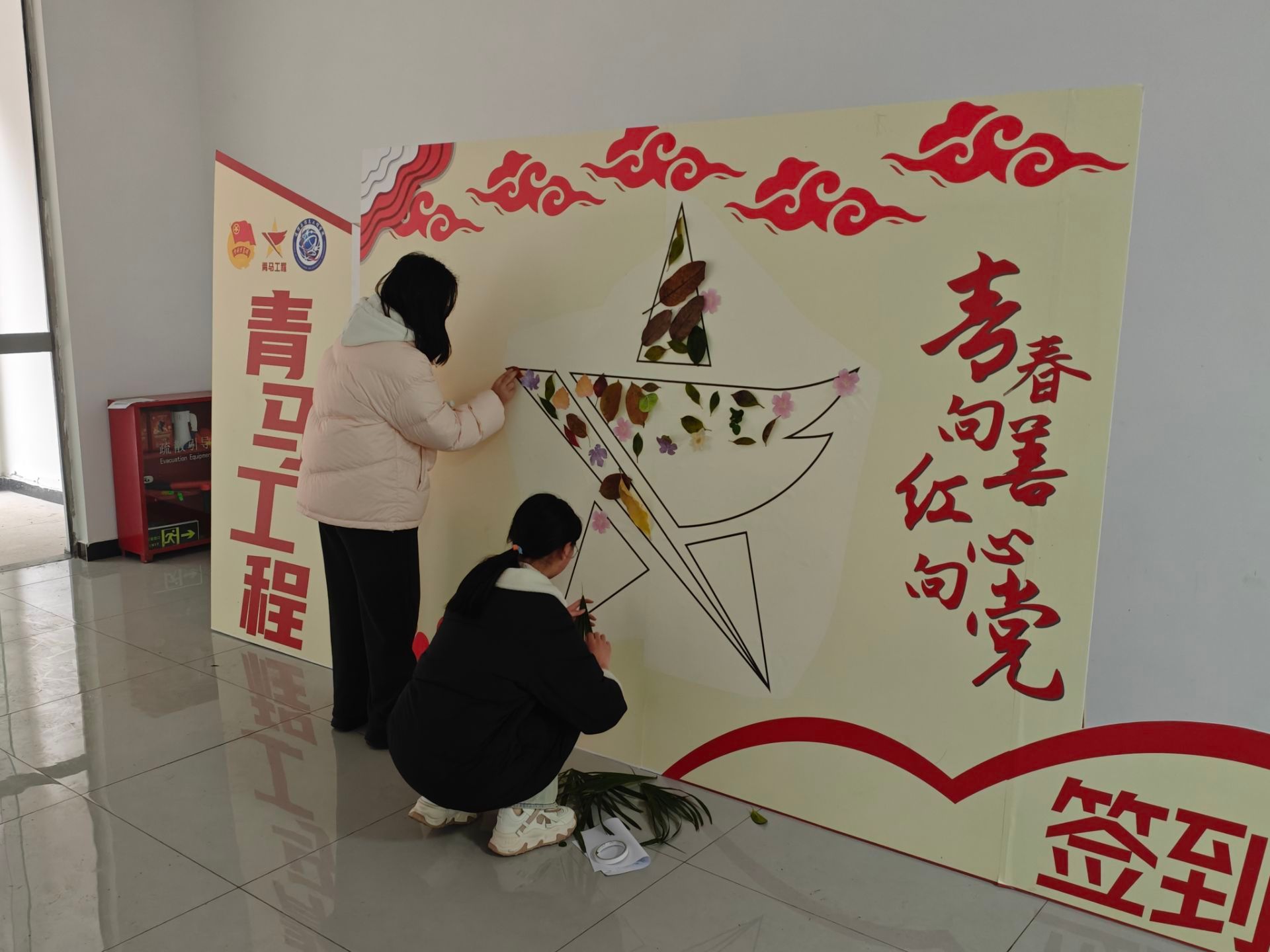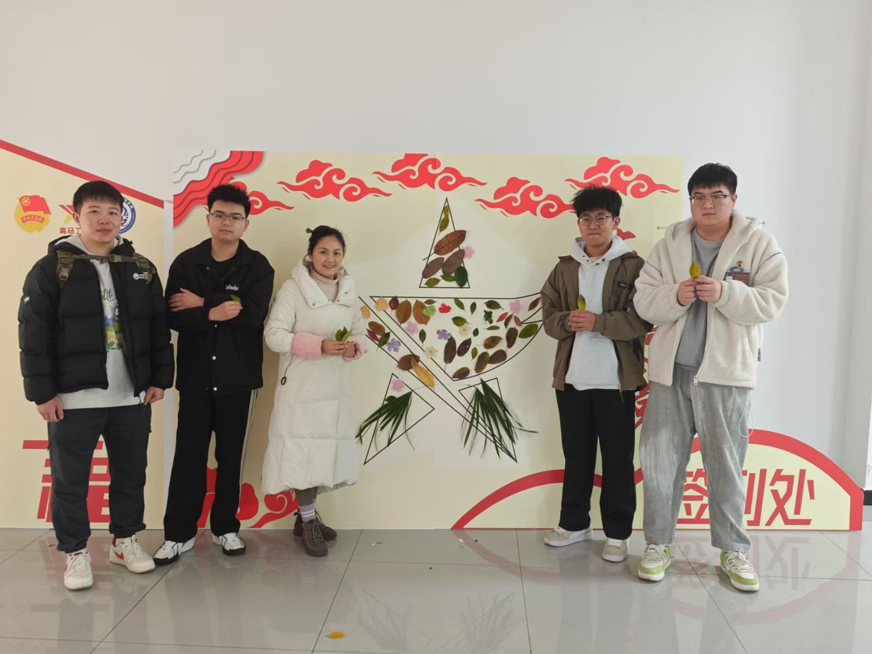 在“青马工程”主题LOGO拼贴区,学员们以“零废弃”理念采集校园落叶、废旧纸屑等生态素材,通过艺术化重构诠释“绿水青山就是金山银山”的发展理念。通过生态文明理念与红色文化基因相融合的创新实践,彰显了当代青年的环保担当,喻示着红色精神在新时代的创造性转化。